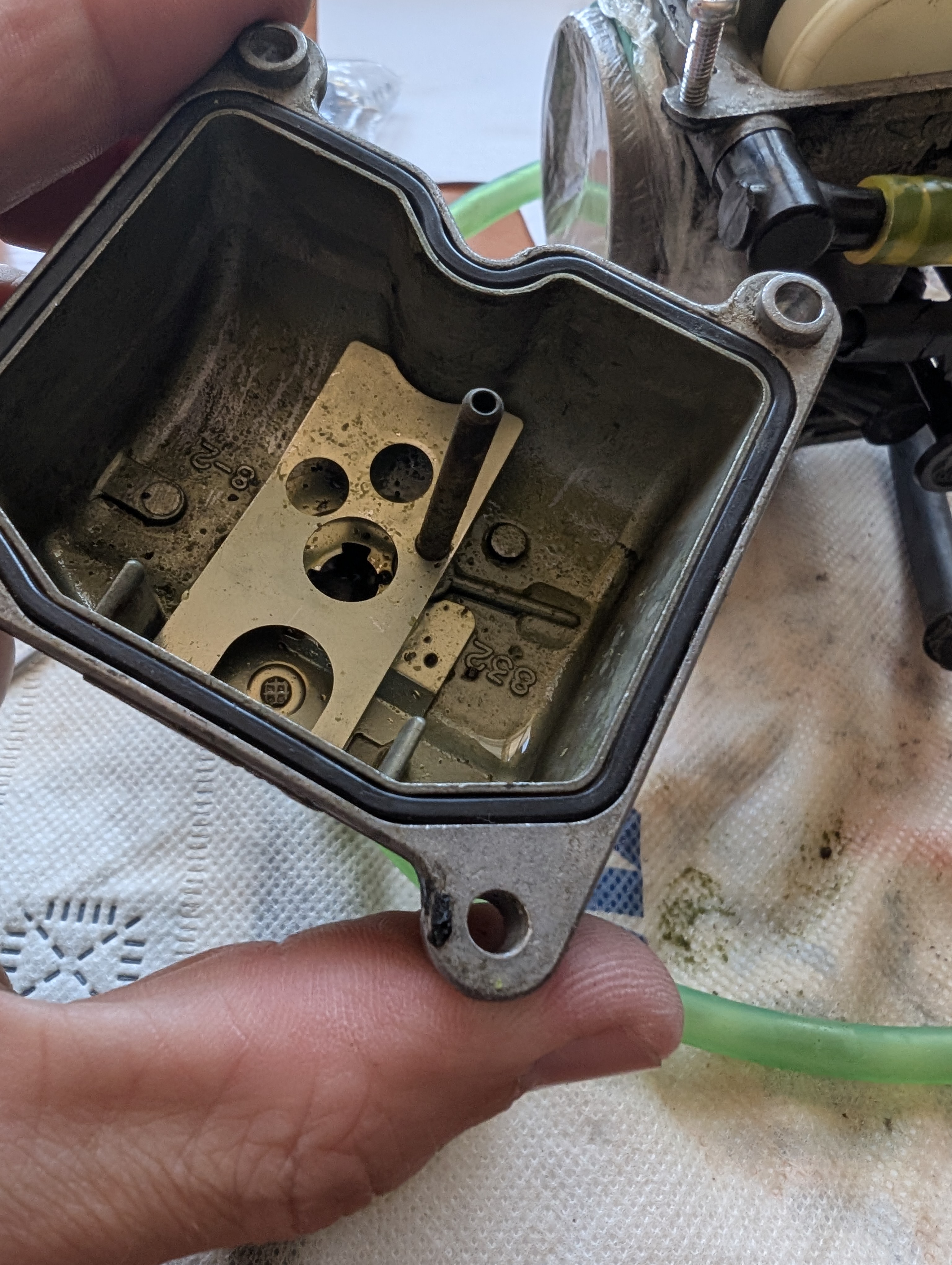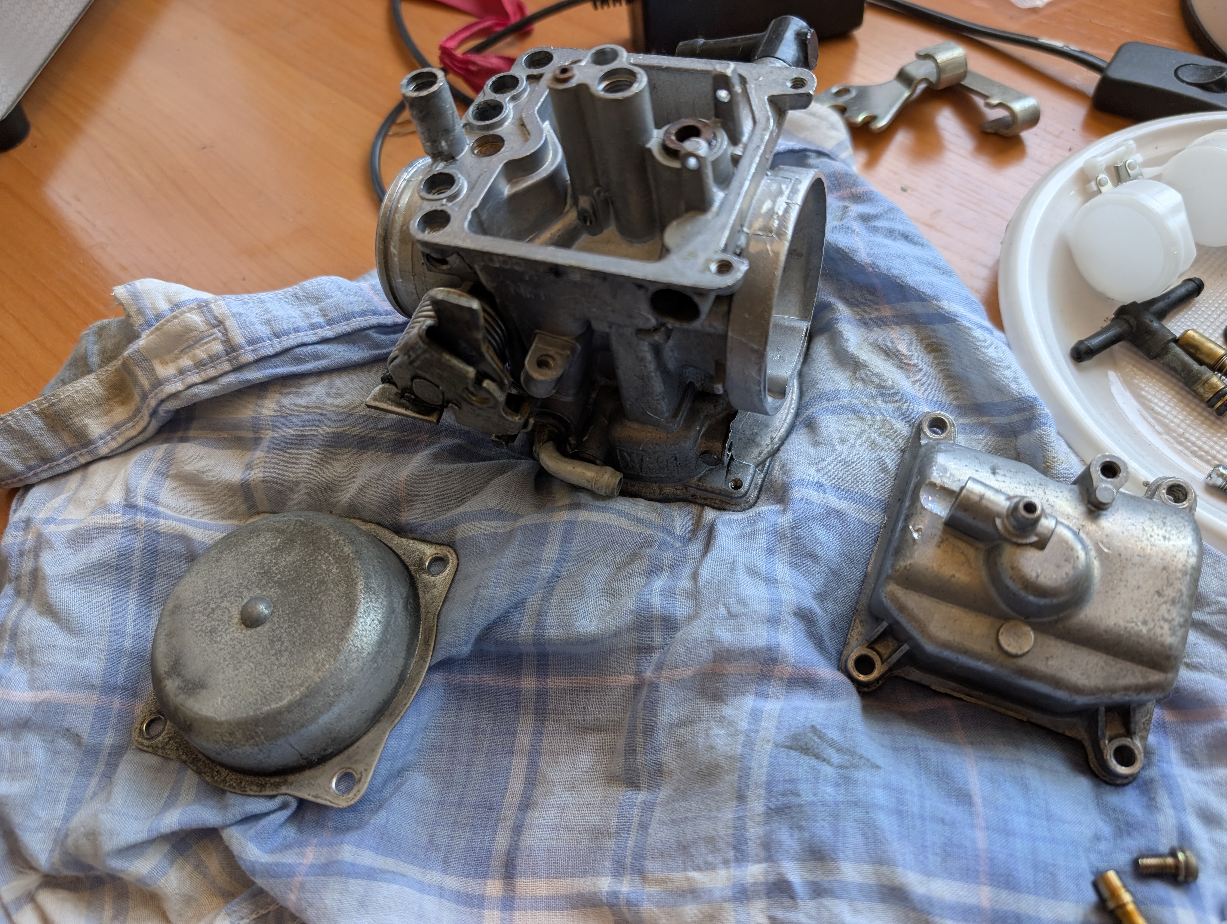 Я disassembled курбулятор. Там засрано, особенно где мембрана, да и вообще везде. Для успешного разбора пришлось изготовить спец отвёртку путем стачивания излишков у обычной, чтобы добраться до idle jet, алсо, понадобилось сходить в магазин и купить набор инструментов, которые типа форма звёздочка с дыркой, дабы открутить болты у датчика дроссельной заслонки. Ну короче разобрал, что разбирается и загрузил в ультрасоник ванну, но жду химию, которая должна завтра прийти, тогда и посмотрю, насколько это оверрейтед шайтан машина или годнота.