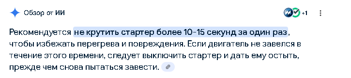>>503947 >Гугл АИ сказал, что стартер испортится, если больше 4 секунд крутить В приличном обществе за попытку использовать АИ в качестве пруфа бьют с вертухи в щи и потом обоссывают. На них нельзя в точных вопросах полагаться. Вот мне например он выдал 10-15 секунд, и это уже более-менее похоже на правду. Я сам так много раз делал и ничего не сгорело. Естесно, много раз подряд нельзя такие длинные включения делать, т.к. он точно перегреется. Ну как правило емкости штатного аккума не хватит чтобы сжечь стартер, можешь на это ориентироваться. Ну и в любом случае, если ты покрутил 10-15 секунд а мот даже не чихнул, это повод начать диагностику.