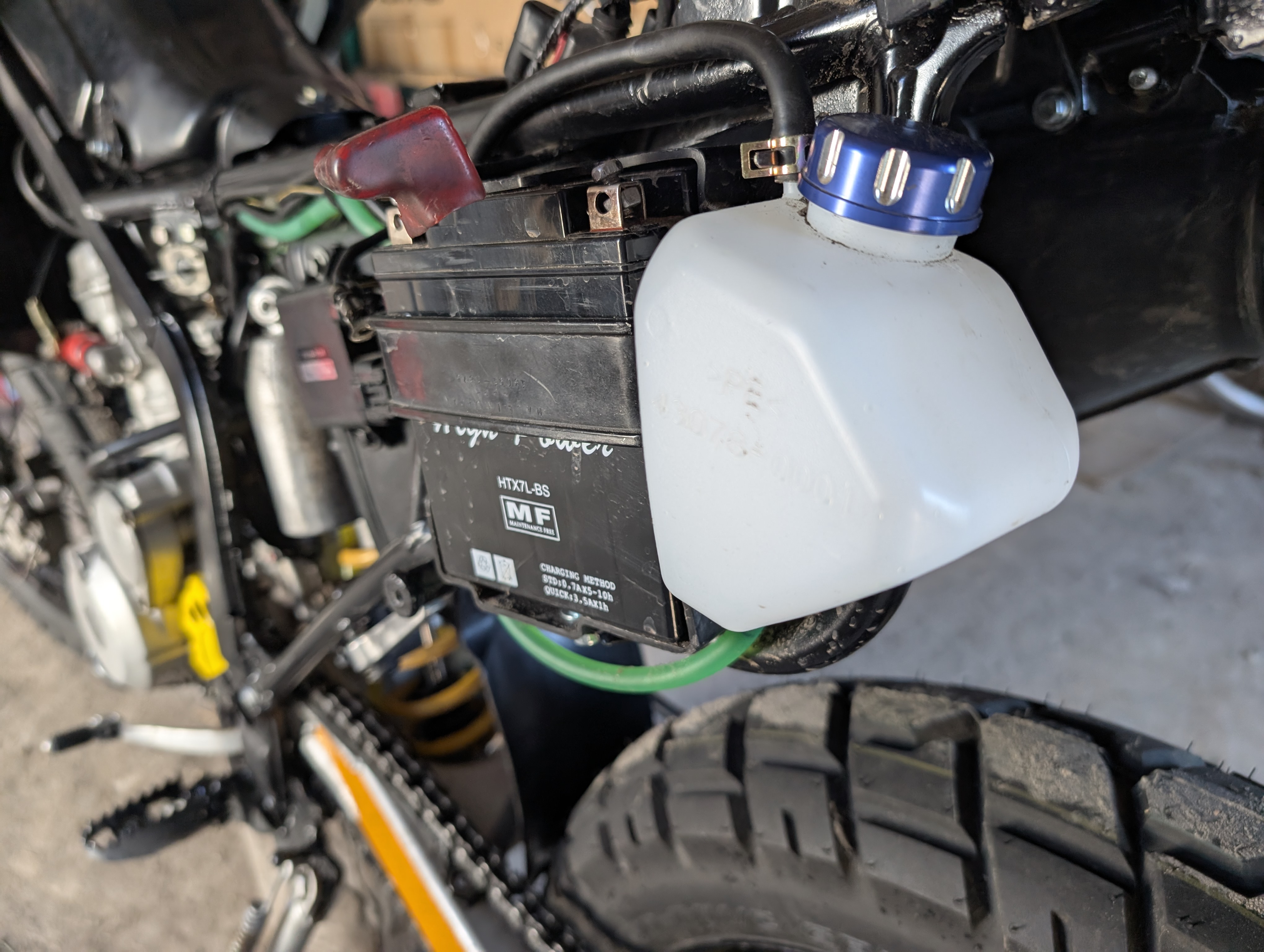 Ну и всё ещё Сузуки далеко до достойного состояния: 1) Во первых подтекает, пусть и медленно, маспо из места, где я обнаружил сорванный болт во время контрольной протяжки по мануалу спасибо наверное японцам, которые не знали про динамометрический ключ. 2) Во вторых течёт реар шок, который я прошлом году сдавал между прочим в ремонт и он нагрузок после этого не имел, а 99,9% времени был просто вывешен. Думаю, что можно теперь уже либо самому с ним повозиться, ибо кабанам механикам я что-то уже больше не доверяю, а сам пусть и долго и не всегда с первого раза, но восстанавливаю. Либо как вариант можно поискать китайский АНАЛог, подходящий по размерам, но с этим сложно очень --- надо думать и искать решения. 3) Ну и 3, в третьих, надо чтобы двигатель поработал какое-то время и успел нагреться и посмотреть, работает ли пропеллер на радиаторе и датчики и помпа. Сам корпус двигателя после мини прогрева был теплый, но пропеллер не включался, собственно надо убедиться, что всё ок, чтобы не сварилось там ничего когда не надо. А ведь как назло, датчик перегрева отсутствует.