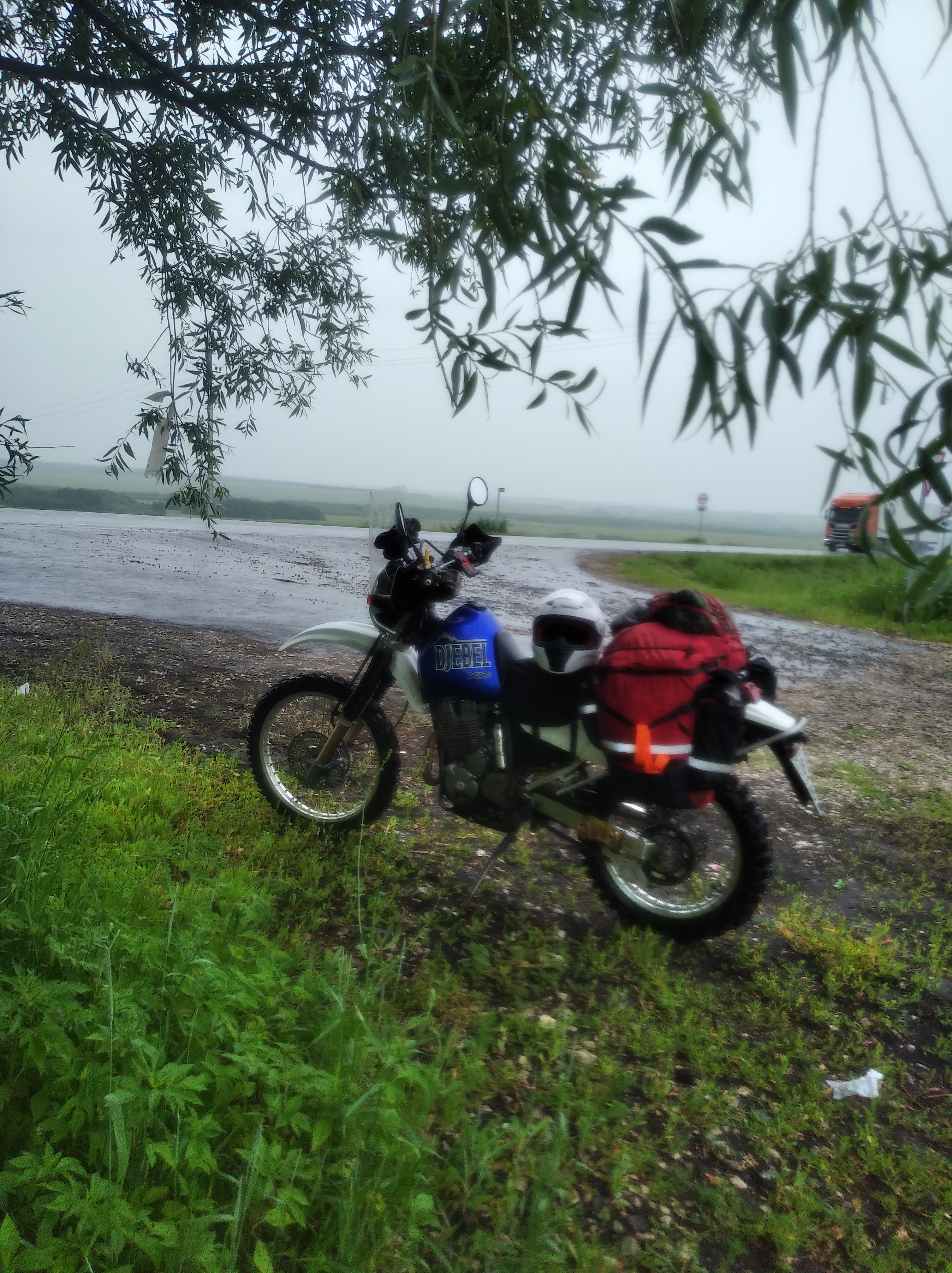 Корочии, день сегодня выдался неоче. Утром была офигенная погода, а потом я въехал в тучу и 6 часов под ливнем её проезжал. Кошмар блин. Зато, испытал дождевик с Али. Годнотаа. Не промок и изнутри я не отсырел от конденсата. Магия. А вот мотоботы продержались пару часиков и протекли.