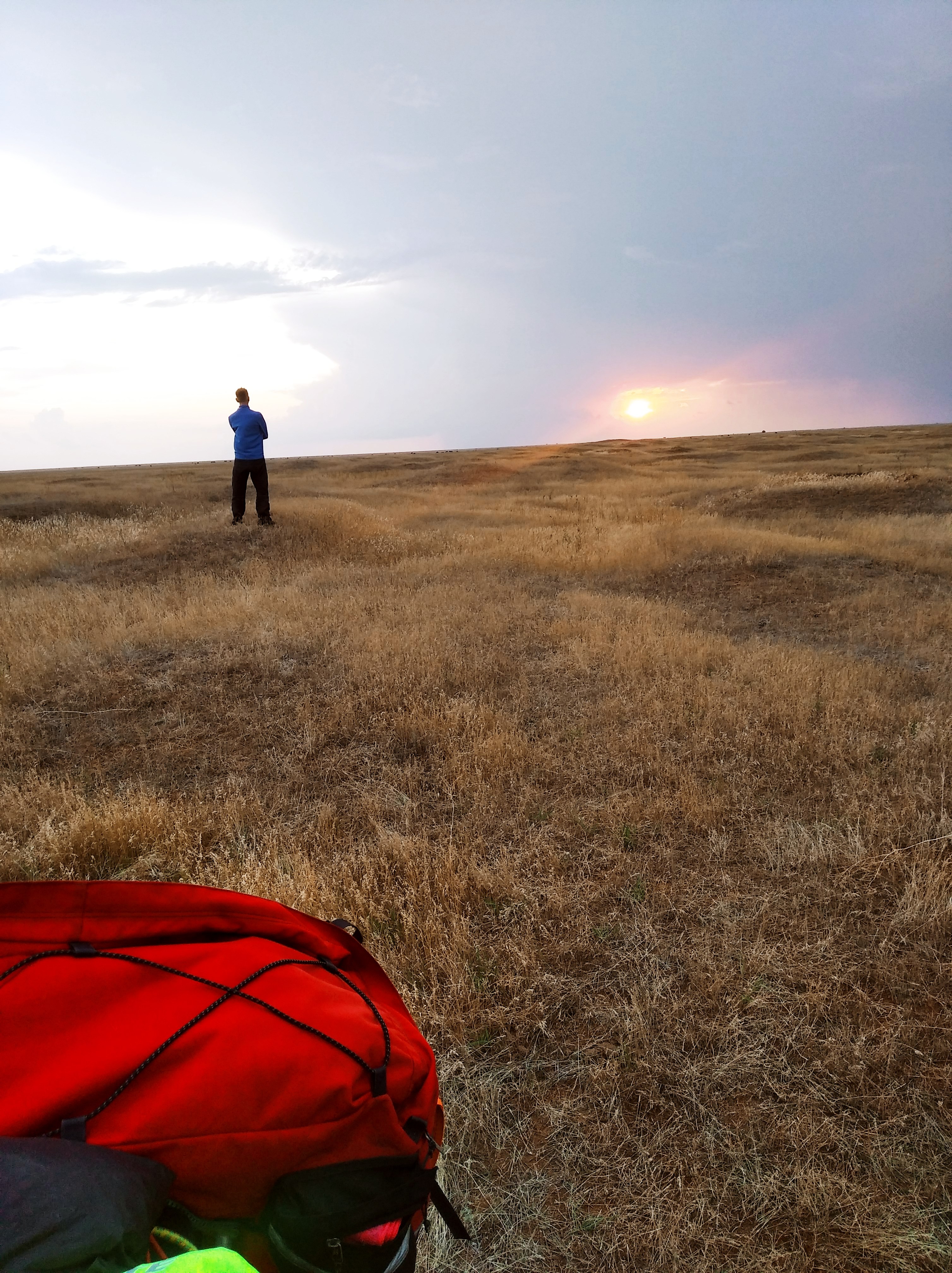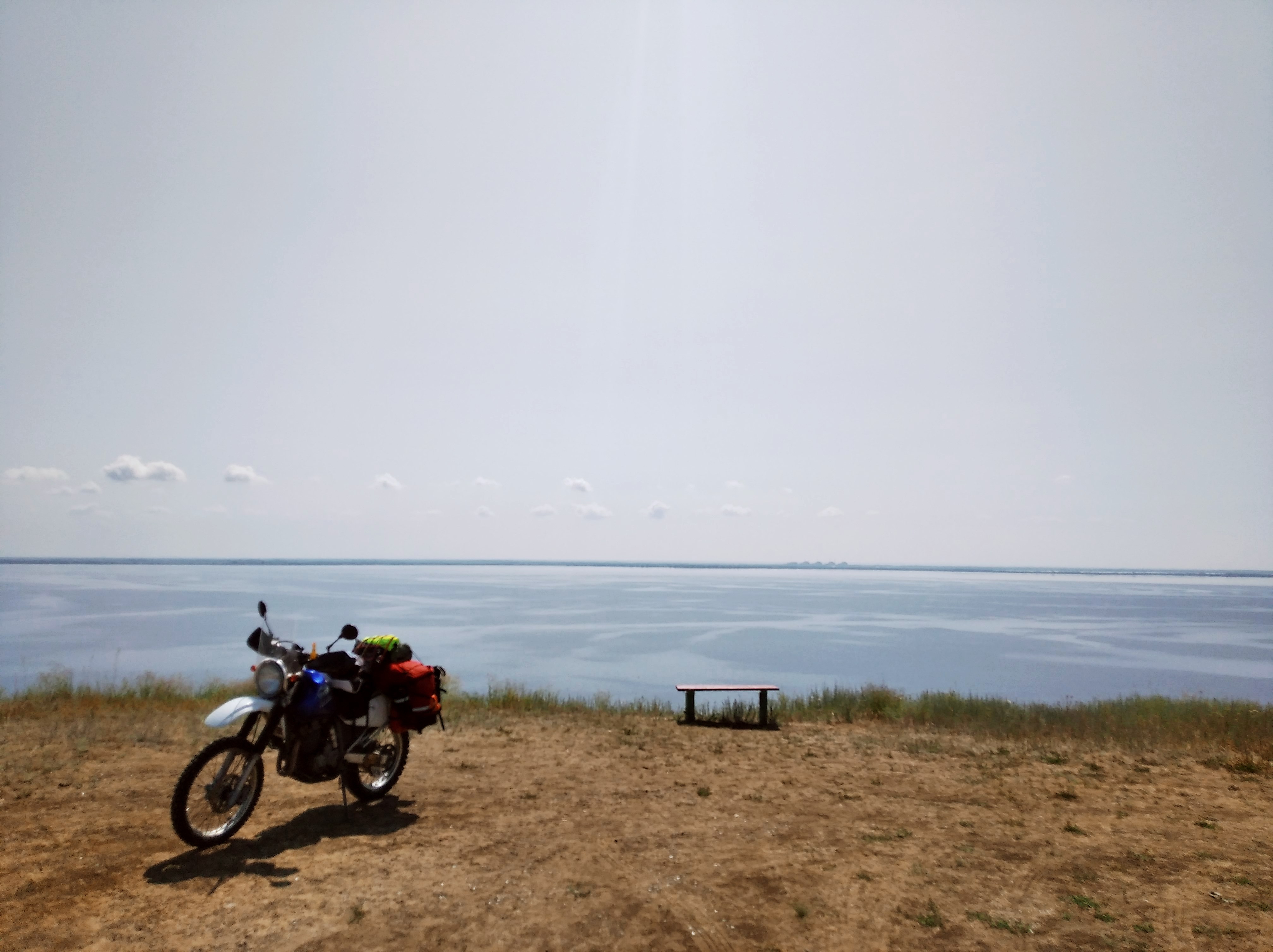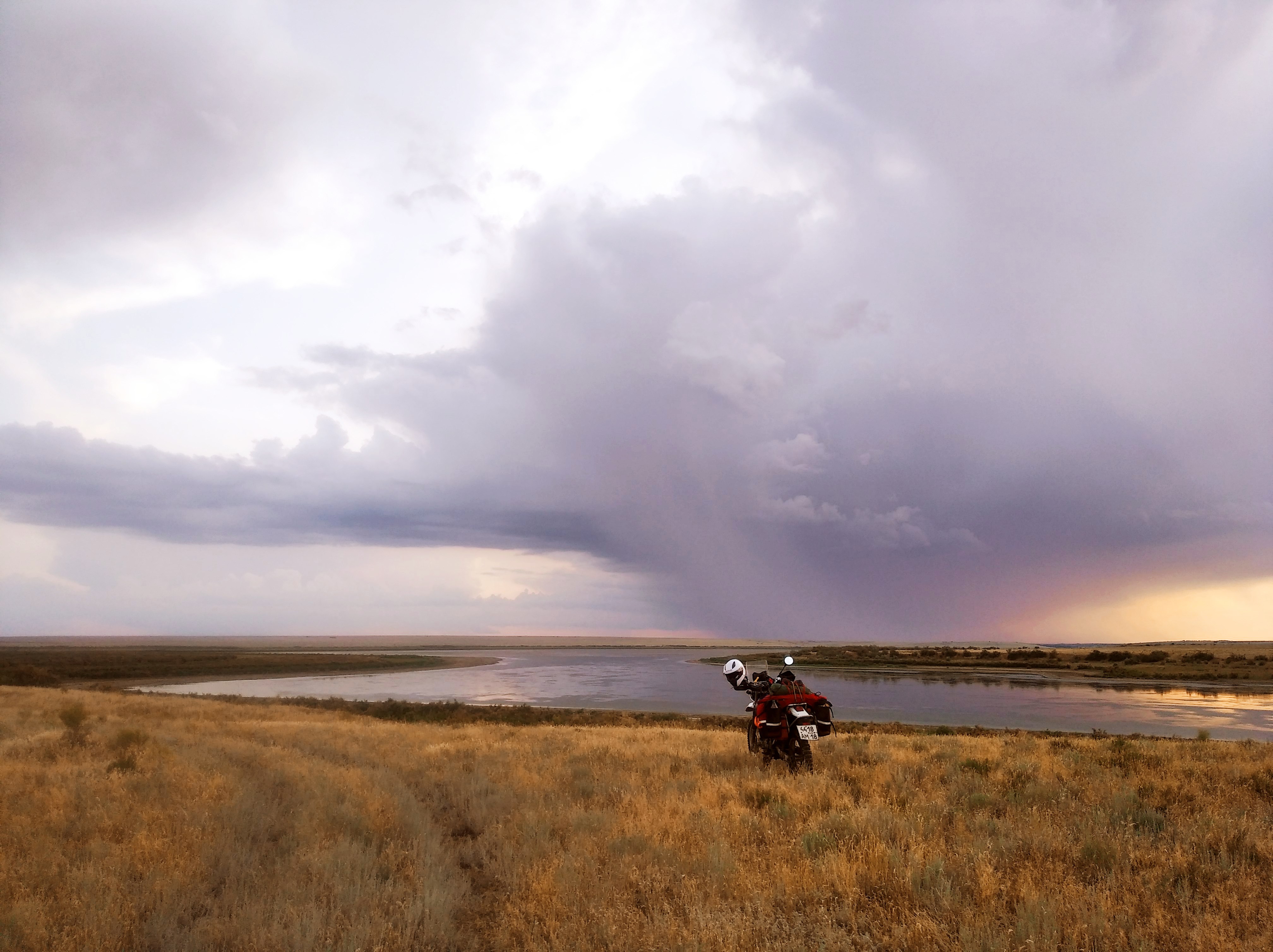 Встал на берегу какого-то пруда или озера. А до этого же хотел в мотеле переночевать. Ну, нафиг. Когда я ещё в степи заночую среди ничего? Сунулся вначале в одно место, а там степь после дождя. Едрить она СКЛИЗКАЯ. Я ехал километр и взмок блин. Скользкота неимоверная. Какая-то космическая помесь песка с белой глиной. Даже Митас е09 не цепляет. Сейчас палатку поставил около воды, а на горизонте туча виднеется. Спуск к воде был ВИТИЕВАТЫЙ и, если ночью пройдёт дождь, завтра выезжать отсюда будет весело. Сейчас-то сухо.