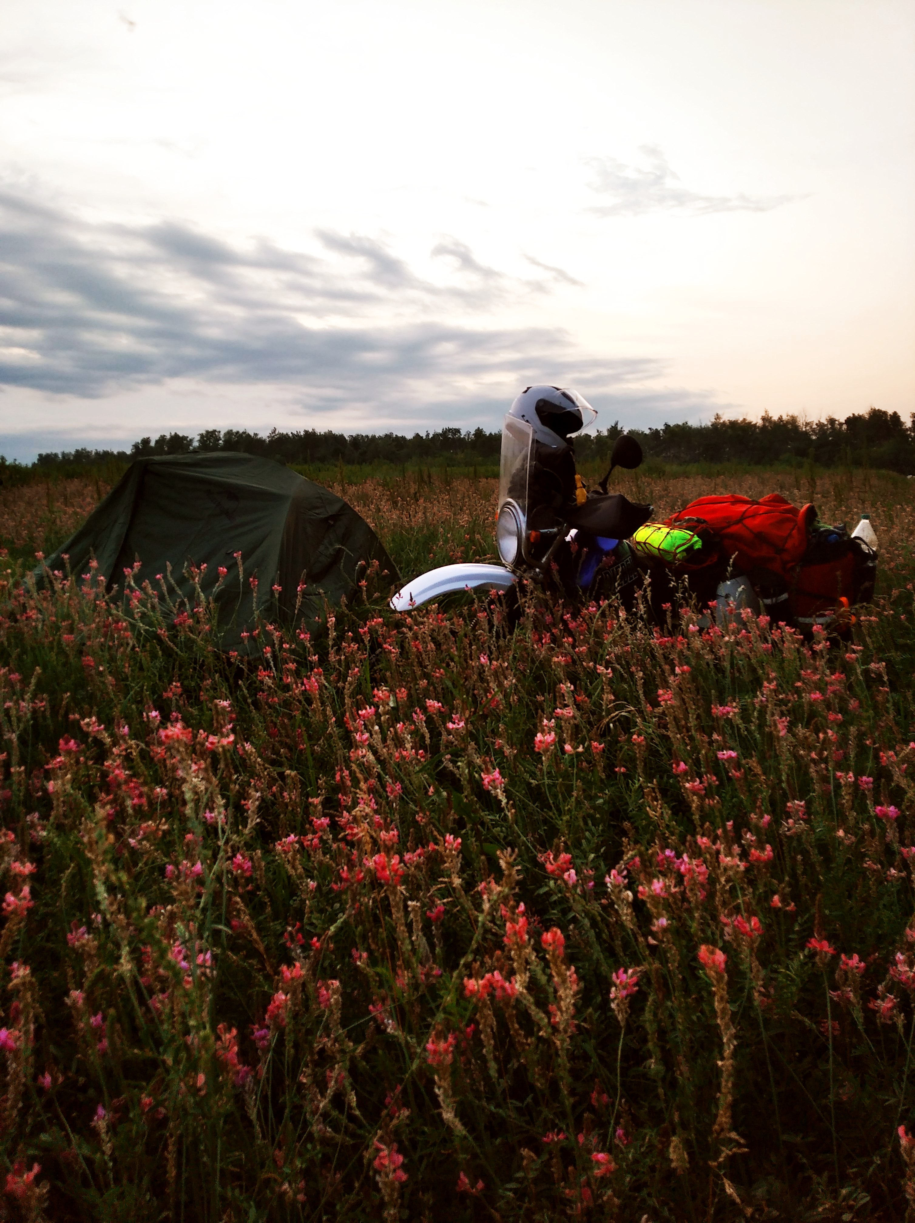 Тучу проехал, проехал Тольятти и началась благодать. Погода офигенная. И тут же полезли смски от МЧСа, мол, готовься анон, к тебе идёт гроза, ураган, снег и гнев Аллаха. Что ж, поглядим. Лежу сейчас в палатке в поле. Хорошоо. Тут у них какие-то ГИГА-одуванчики. Размером больше моего кулака. А ещё, запас хода у Джебеля до резерва 340км, а расход 4.2л на сотню. Баджаж то был эффективней. Расход 3.2, а объём 400кубиков.
