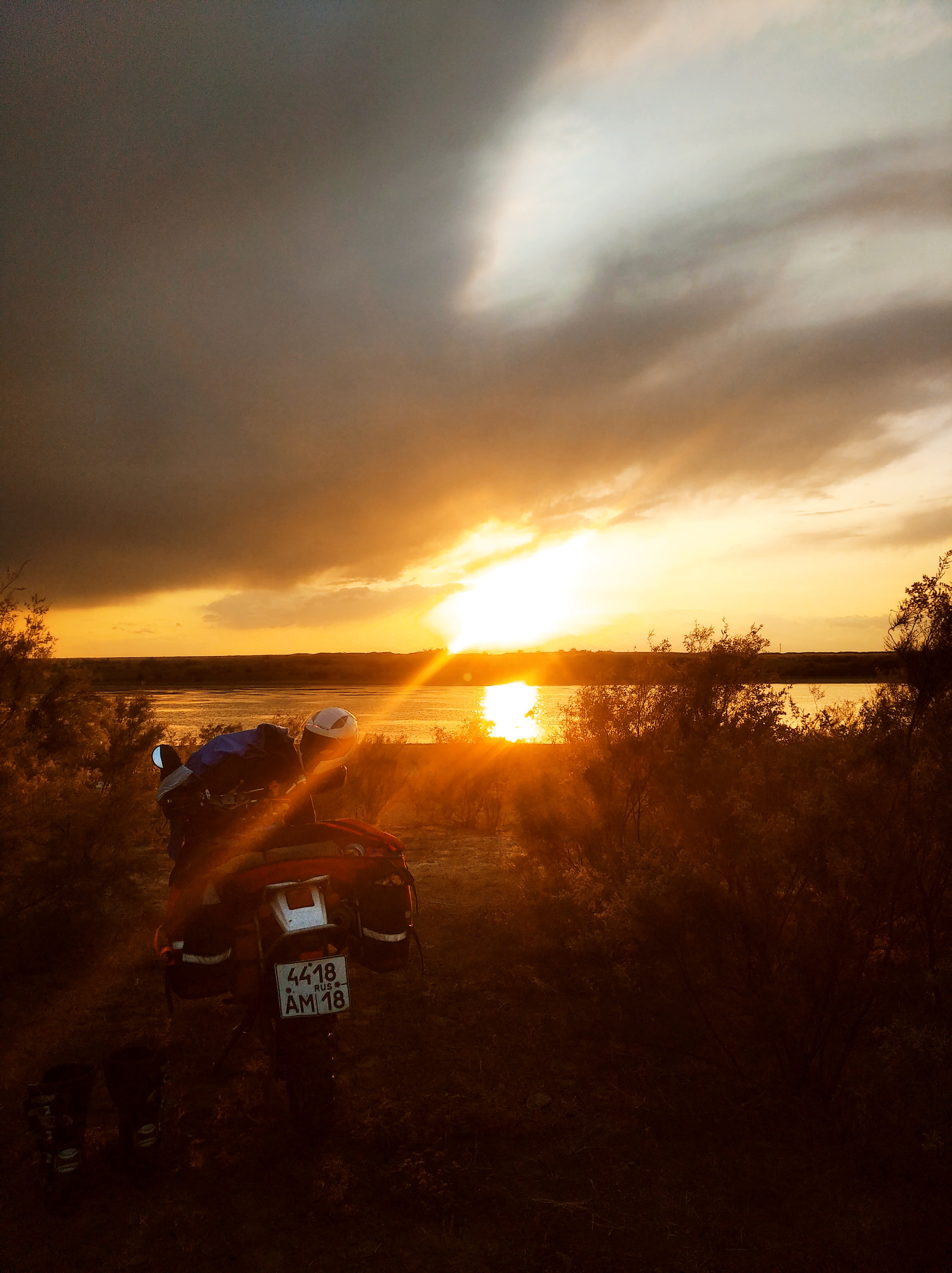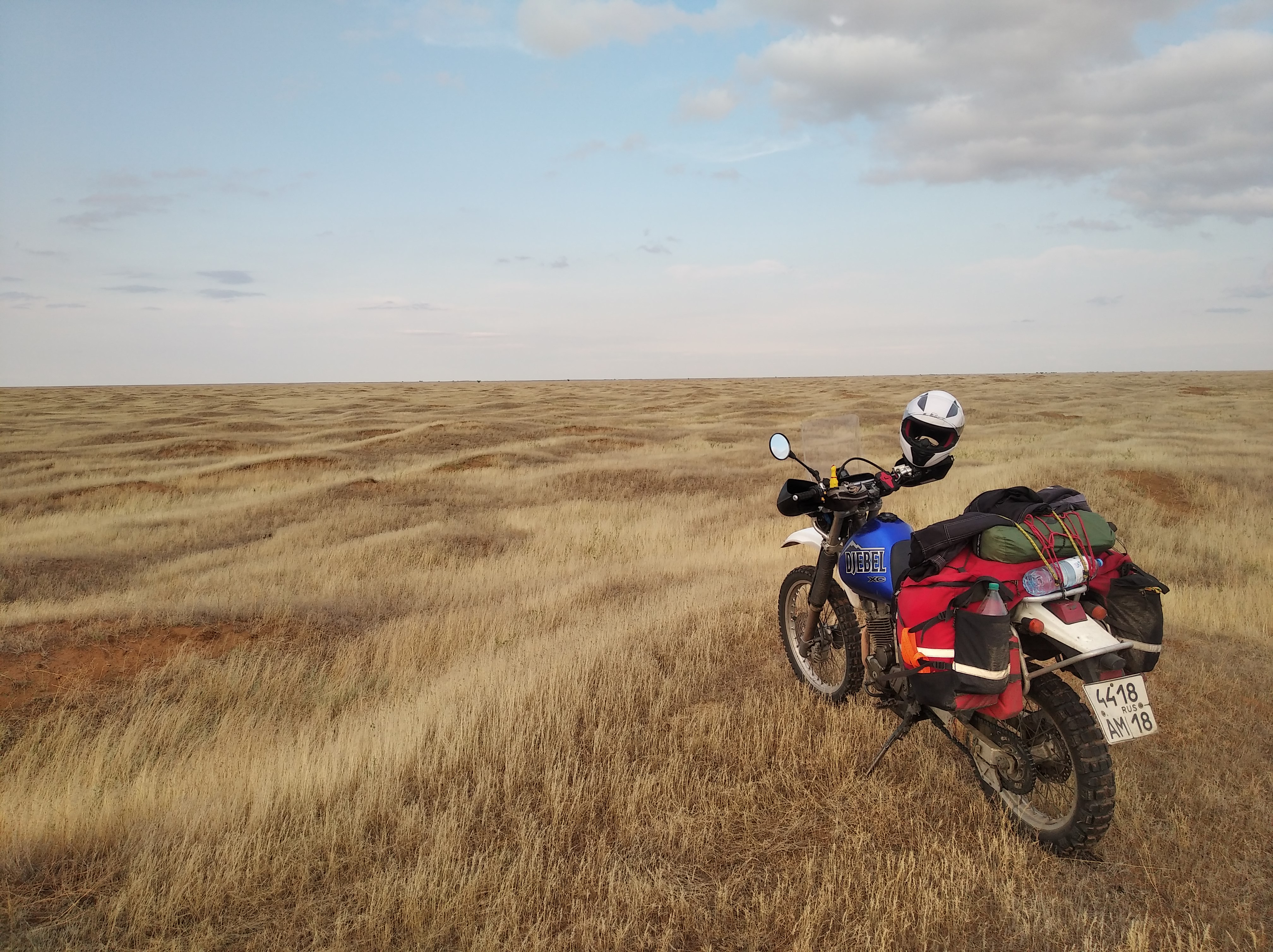 Итак, анончики, связи нет, ибо я В ПУСТЫНЕ НАХРЕН. Ну, как в пустыне, на фотках в Яндексе действительно выглядело как пустыня. На деле же пикрилейты. Стоял на этих барханах минут 20, пытаясь поймать сеть. Тщетно. Лежу сейчас и пишу это в заметки, чтобы завтра отправить. Конечно же, на горизонте здоровенная туча. Молюсь Будде, чтобы не полило, ибо размокшую пустыню я уже только что помесил. Алсо, в тред дико призываются всякого рода колдотворцы, волхвы и прочие волдеморты. Ибо! Ибо я уже задолбался от дождей. Что же это такое? Калмыкия мне сегодня оче трудно далась. Не, спал я отлично, и даже утром было солнышко, а ночью не было дождя и выехал я хорошо с места ночёвки. Но потом полнялся жуткий боковой и встречный ветер. Да такой, что я ехал с креном градусов в 15-20, а при встречном ветре, мот отказывался ехать быстрее 70 км/ч. Впервые с таким встречаюсь. И мой самодельный ветровичок - вещь! Без него помер бы. И телефон остаётся сухим при дожде в движении.