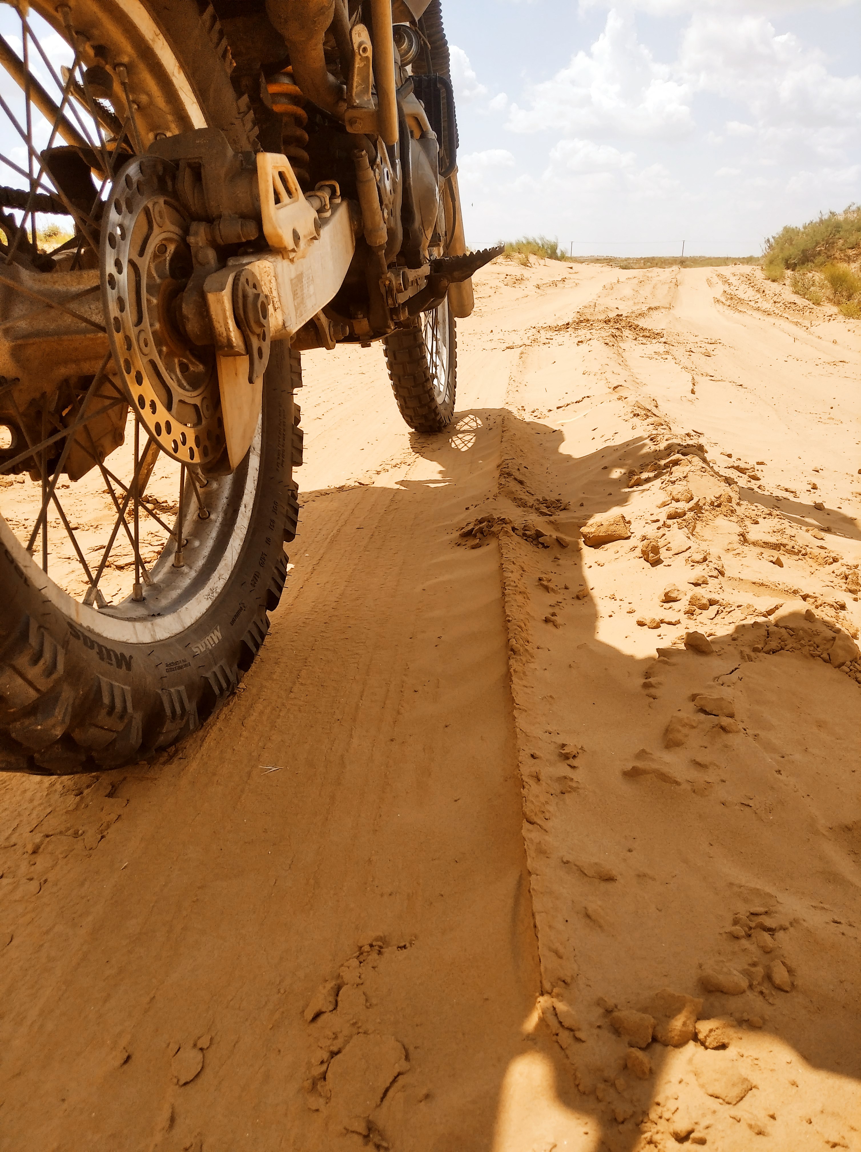 По сухой грунтовке мот идёт вообще здоровско. Хоть ям, хоть не ямы по пути. Мелкие неровности вообще не чувствуешь, когда больше разгонишься, как и торчащий из под засохшей грязи щебень. По рыхлой мелкой гравийке с круглыми гальками тоже идёт офигенно и, что забавно, мот меньше таскает из сороны в сторону, чем Джебель. Видимо сказывается масса.