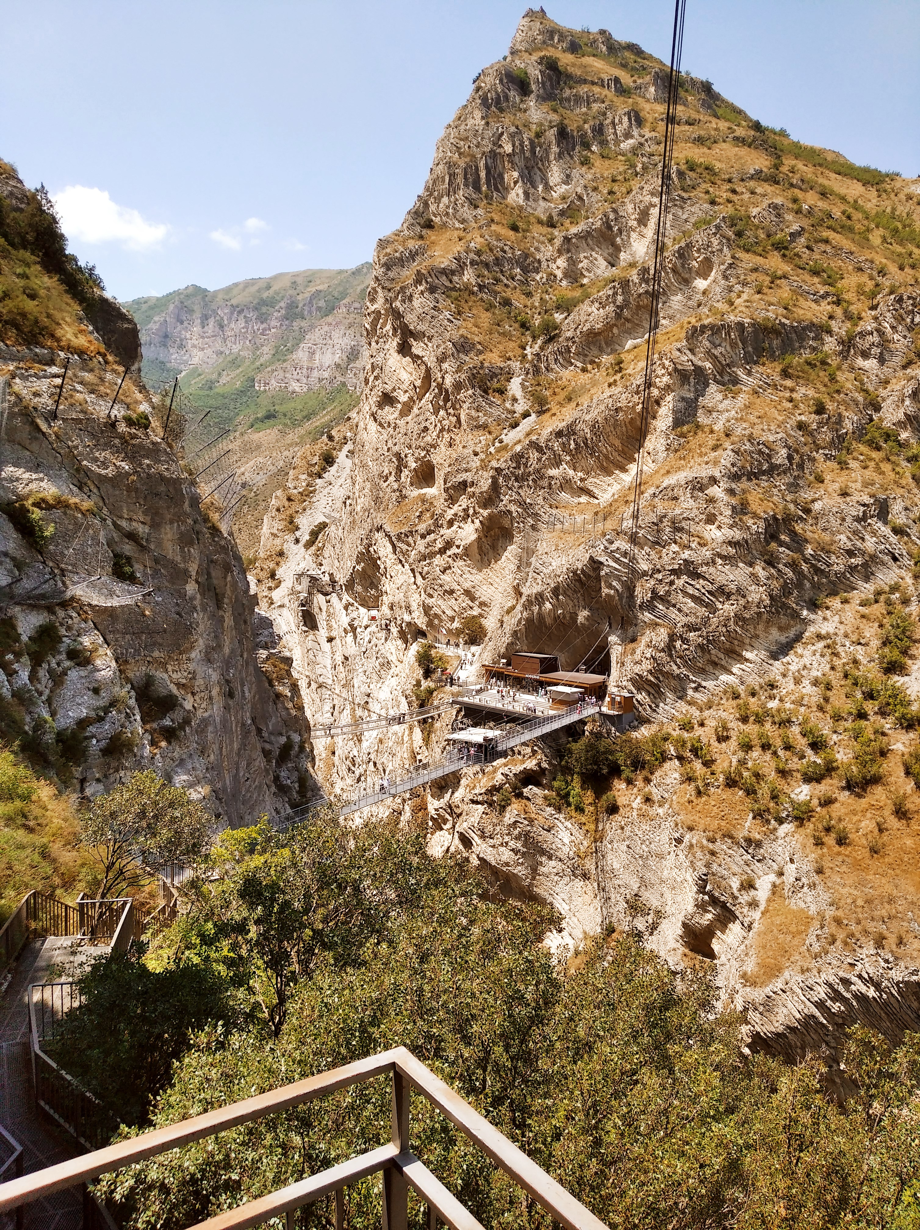 Далее по плану был Сулакский каньён. Но, я куда-то не туда свернул и попал к какой-то пещере. Куча туристов, автобусы ,вход 500рублёв и выдают КАСКИ. Пошёл. И не зря! Сама пещера прикольная, а далее начало Сулакского каньона и подвесной мост на высоте метров 100. Вид шикарнейший. И тарзанка с гигантскими качелями. Ухх блин. Посмотрел, как люди летают и думал, лететь не лететь. Долго решался, минут 15. На Алтае я прыгал с тарзанки, но там высота поменьше была. Короче, решился. Пошёл покупать билет и настало 12 часов дня. ВРЕМЯ МОЛИТВЫ. И все работники на 2 часа ушли. Вот блин! Тарзанка стоит 7000р, гигантские качели 5000р.