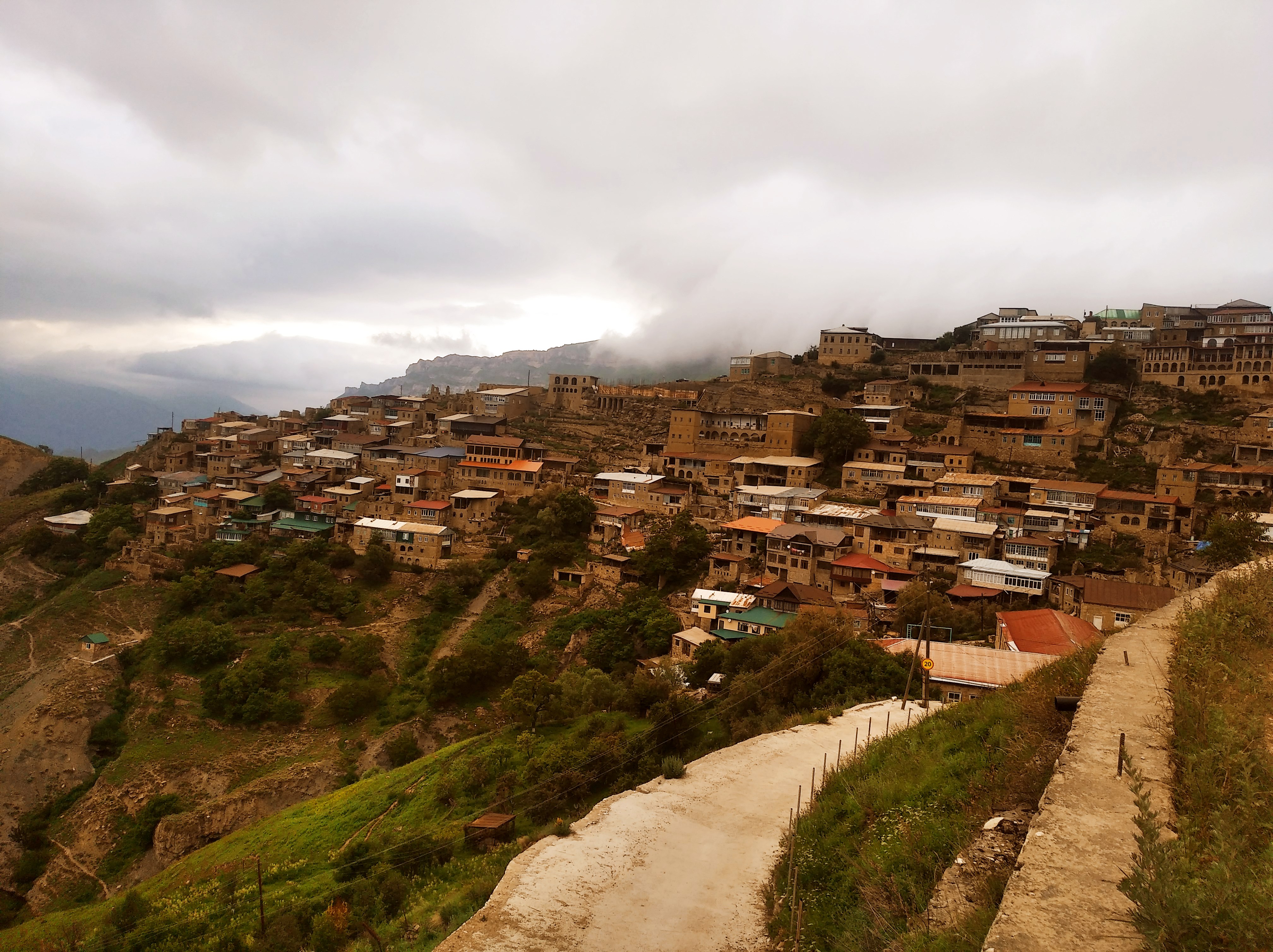 Сегодня был полностью ПЕШКОДРАЛЬНЫЙ ДЕНЬ. Утром, в 8 часов я стартанул в аул-призрак Гамсутль. Чтобы духи меня приняли, я обоссал палатку по кругу 3 раза. Не сработало. Они послали мне дожди и туманище. Если кто-то соберётся туда же, знайте там уазики за 100р довозят полпути вверх, откуда ещё около часа хода пешком среди куч свежего говна. Я же пошёл рано, и уазиков не было. Потому, путь у меня занял полтора часа вверх и час вниз. Но, оно того стоило. Если б тумана не было, добавились бы божественные виды. А в моём случае, туман добавил таинственности и мистики. Сам Гамсутль прикольный аул с непередаваемой атмосферой. Старая кладка, среди которой встречаются камни с мусульманскими надписями или узорами. Старая планировка, узкие улочки, стены оштукатуренные глиной с сеном, потолков нет. Но, есть хорошо сохранившийся дом последнего жителя, который умер 10 лет назад. Там даже вещи его лежат. И сральная комната работает. Офигенное место, но идти далеко.