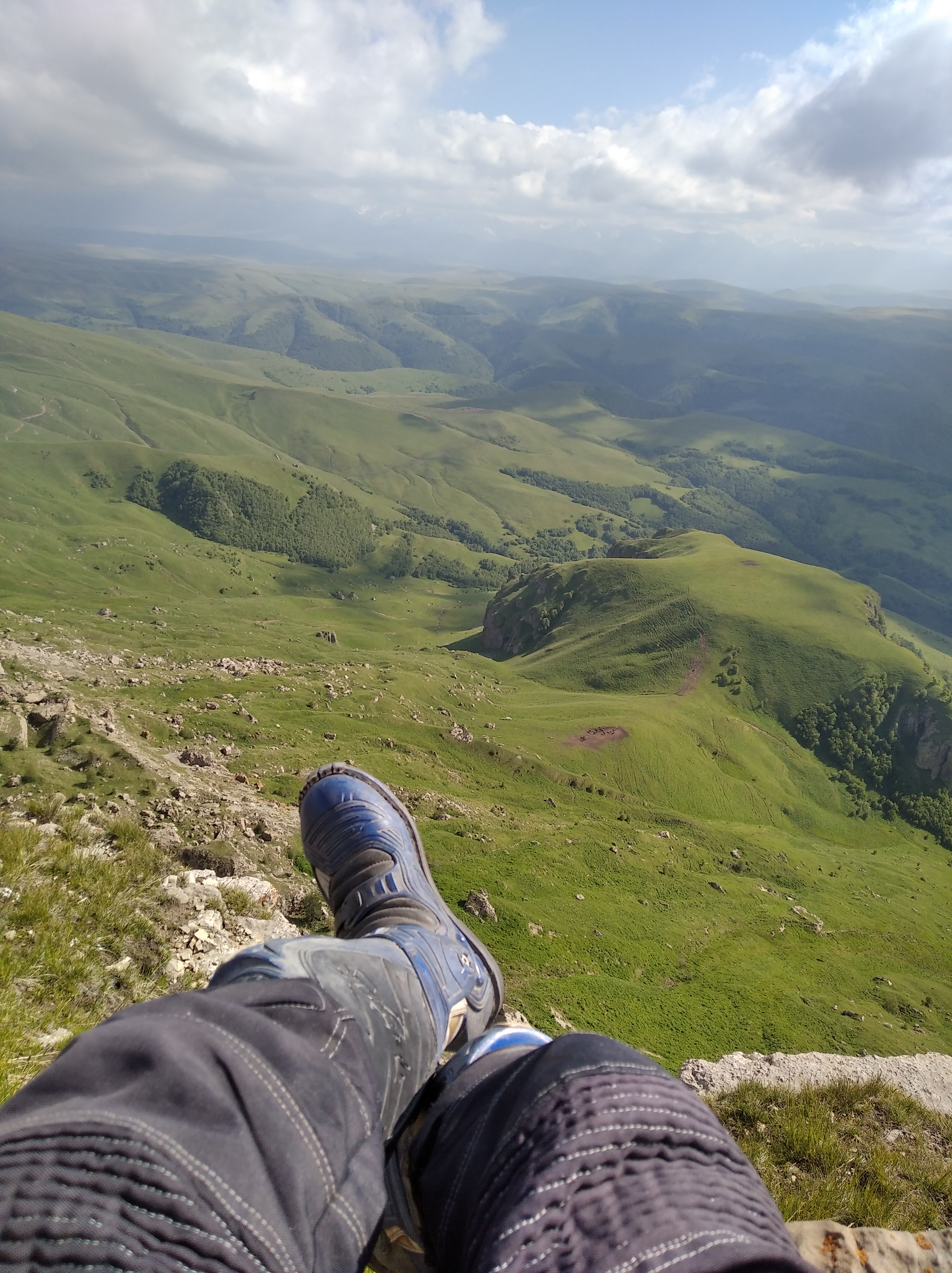 Ещё и легкодоступно. Люди на легковушках сюда приезжают вон. Я приехал сюда часа в 4 и тут же решил остаться на ночь. Нельзя это всё впитать за полчаса. Тут столько висящих над пропастью камней, где можно сесть и ножками поболтать, а под тобой 800м пропасти. Столько дорожек и пологих склонов, где можно покататься. Как же хорошо, что я на лёгком эндуро! Склоны травянистые без выступающих камней, пологие. Одно удовольствие по ним кататься. Часа 3 так делал , останавливаясь и сидя на обрыве по полчаса. Заехал на сааамый высокий пик, куда только решился и куда уже не было следов.