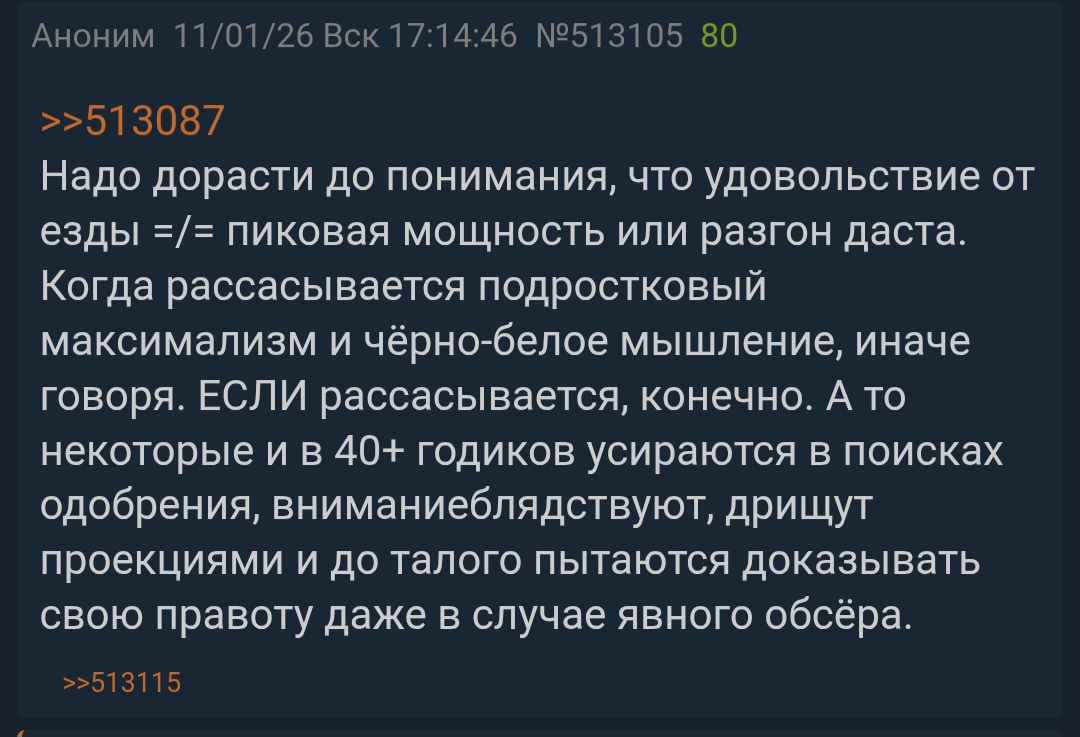 >>513087 Надо дорасти до понимания, что удовольствие от езды =/= пиковая мощность или разгон даста. Когда рассасывается подростковый максимализм и чёрно-белое мышление, иначе говоря. ЕСЛИ рассасывается, конечно. А то некоторые и в 40+ годиков усираются в поисках одобрения, вниманиеблядствуют, дрищут проекциями и до талого пытаются доказывать свою правоту даже в случае явного обсёра.