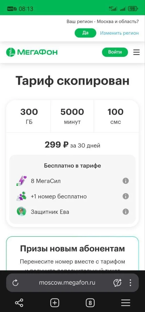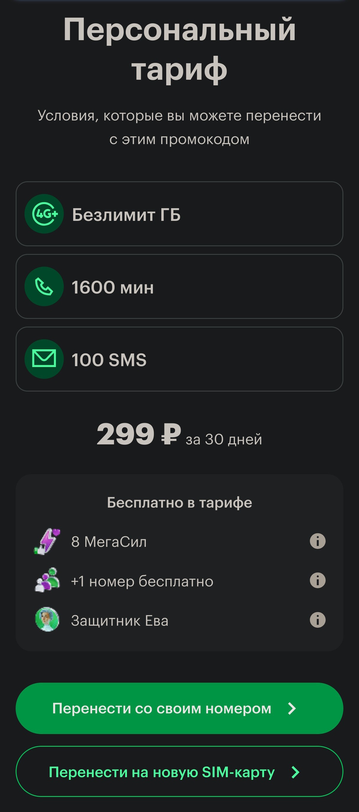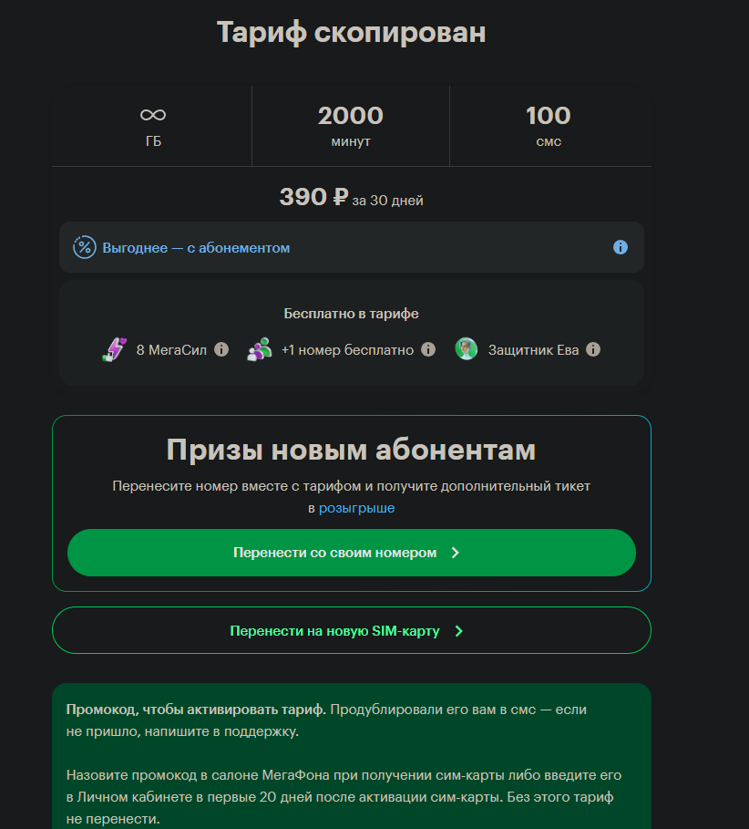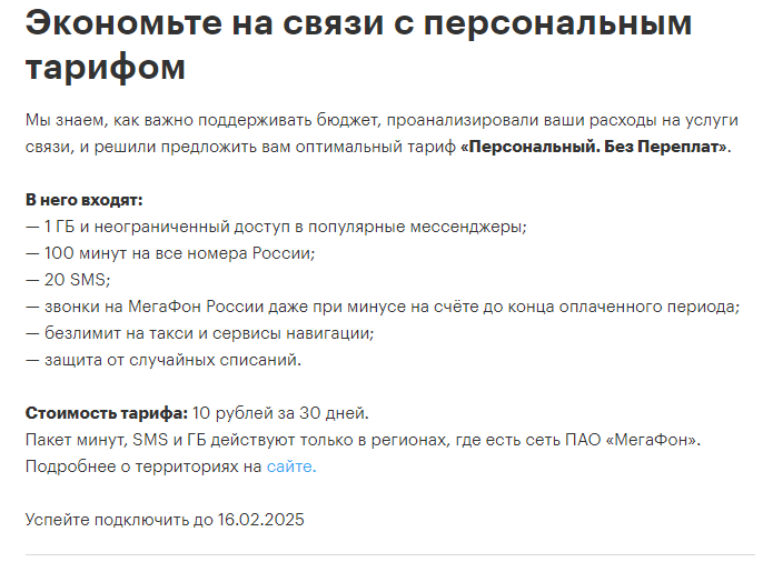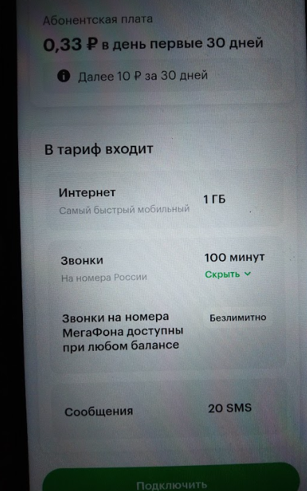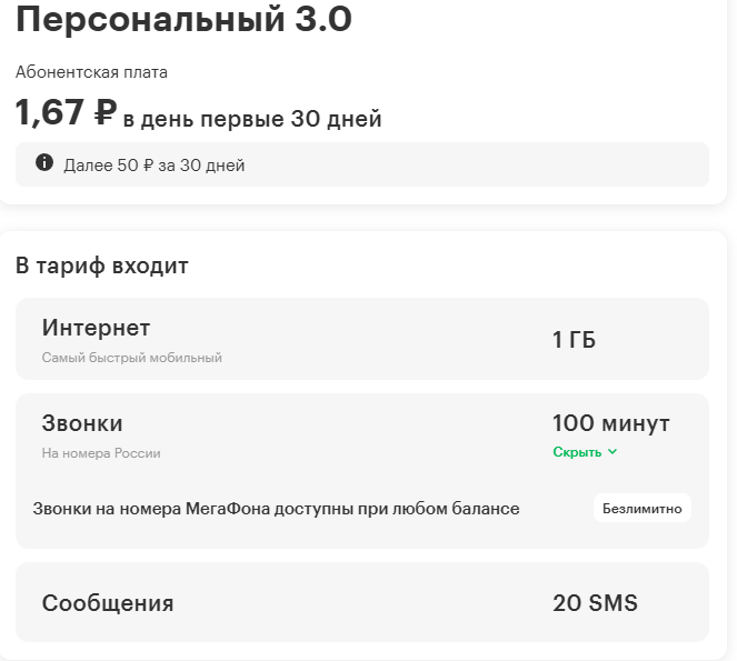 Мы подобрали для вас тариф «Минимум» со скидкой 90% на 3 месяца, далее скидка 75%: - 400 минут и 30 SMS на номера России - безлимит на МегаФон после окончания пакета и при нуле А ещё - безлимитный интернет и дополнительные Плюс 1000 минут на тариф по РФ для звонков.
