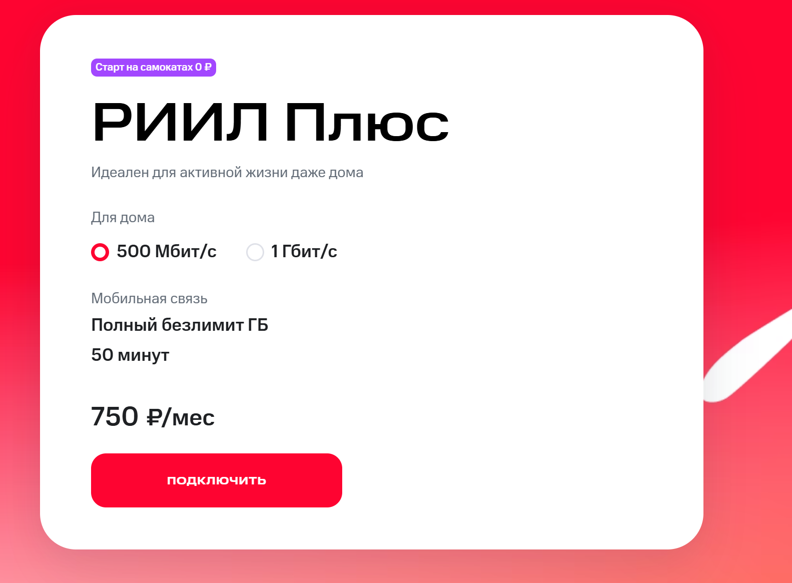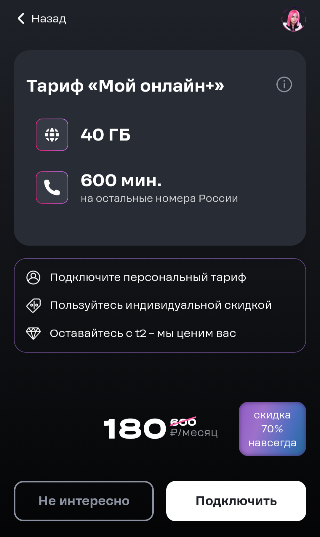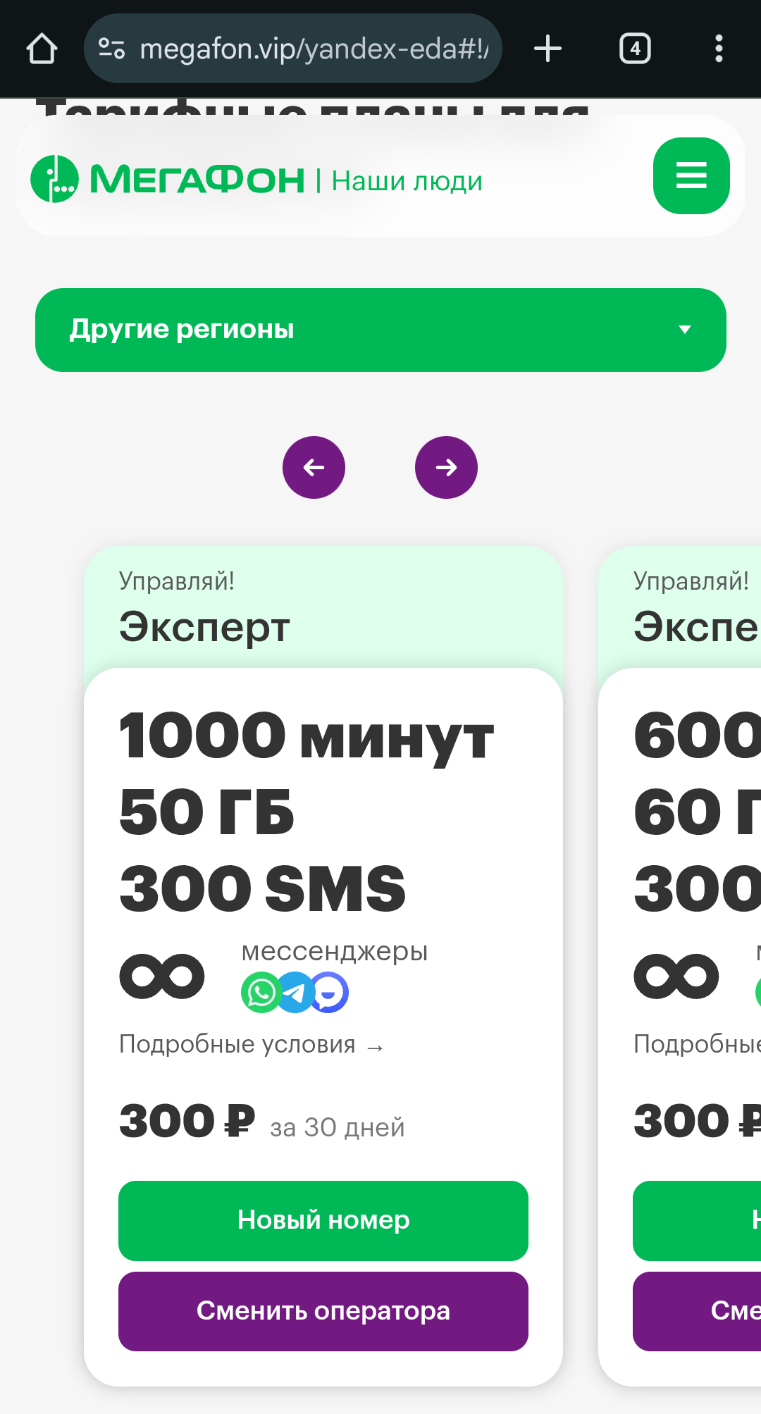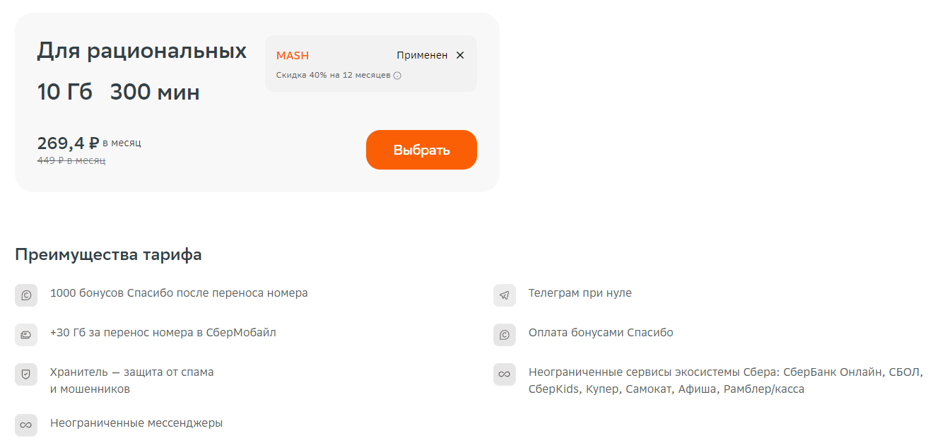 Мы подобрали для вас тариф «Минимум» со скидкой 90% на 3 месяца, далее скидка 75%: - 400 минут и 30 SMS на номера России - безлимит на МегаФон после окончания пакета и при нуле А ещё - безлимитный интернет и дополнительные Плюс 1000 минут на тариф по РФ для звонков.