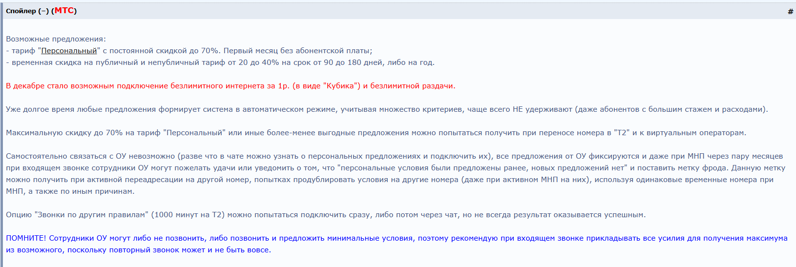Что имеем на данный момент: Опытным путём выяснили, что если подать заявку на MNP к другому оператору, то твой текущий оператор может позвонить тебе и предложить _более интересные условия_ Можно даже попытаться наебать позвонившую операторшу и сказать, что у опсоса, к которому вы уходите, есть такие то охуенные условия и вы хотите такие же - вам могут их предоставить. Но это не точно. Если ты не очень ценный клиент, то тебе никто не позвонит, заявку на переход можешь отменить или оставить в силе и посмотреть что там есть интересного у другого оператора. Все еще продолжаем обсуждать тарифные пакеты, качество покрытия, наёб системы/абонентов, модемы, скорость приёма, отмены безлимитов и такое прочее.