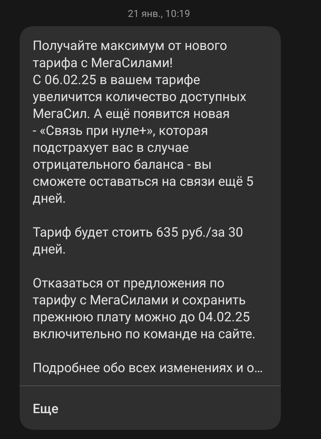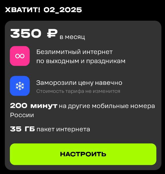 Ебать пидорасы, хотели поднять плату на 100 рублей и вкорячить свои мегасвины и связь при нуле, которая у меня на тарифе уже блять есть и она бесплатная. Причем можно отказаться и последняя дата отказа - сегодня, хорошо что заметил и послал нахуй зеленых пидорасов. Оказывается до этого то же самое было с 460 до 530 рублей, но я проглядел. Уебаны. У кого тоже мегавонь и персональные тарифы, проверьте свои смски от оператора, а то вас так же пересадят на тариф подороже без права возврата. Алсо рейт тарифа: 530 рублей за 38 гигов, безлимит на ютуб, вк, телегу, тикток, ватсап и рутубопарашу (наверное норм пиратский кинч глядеть), есть перенос остатков. Причем такой тариф они мне предложили сами и он был намного выгодее старого, подключил сразу же. Видимо теперь я им не выгоден и они решили выжимать из меня бабки, пользуясь моей невнимательностью.