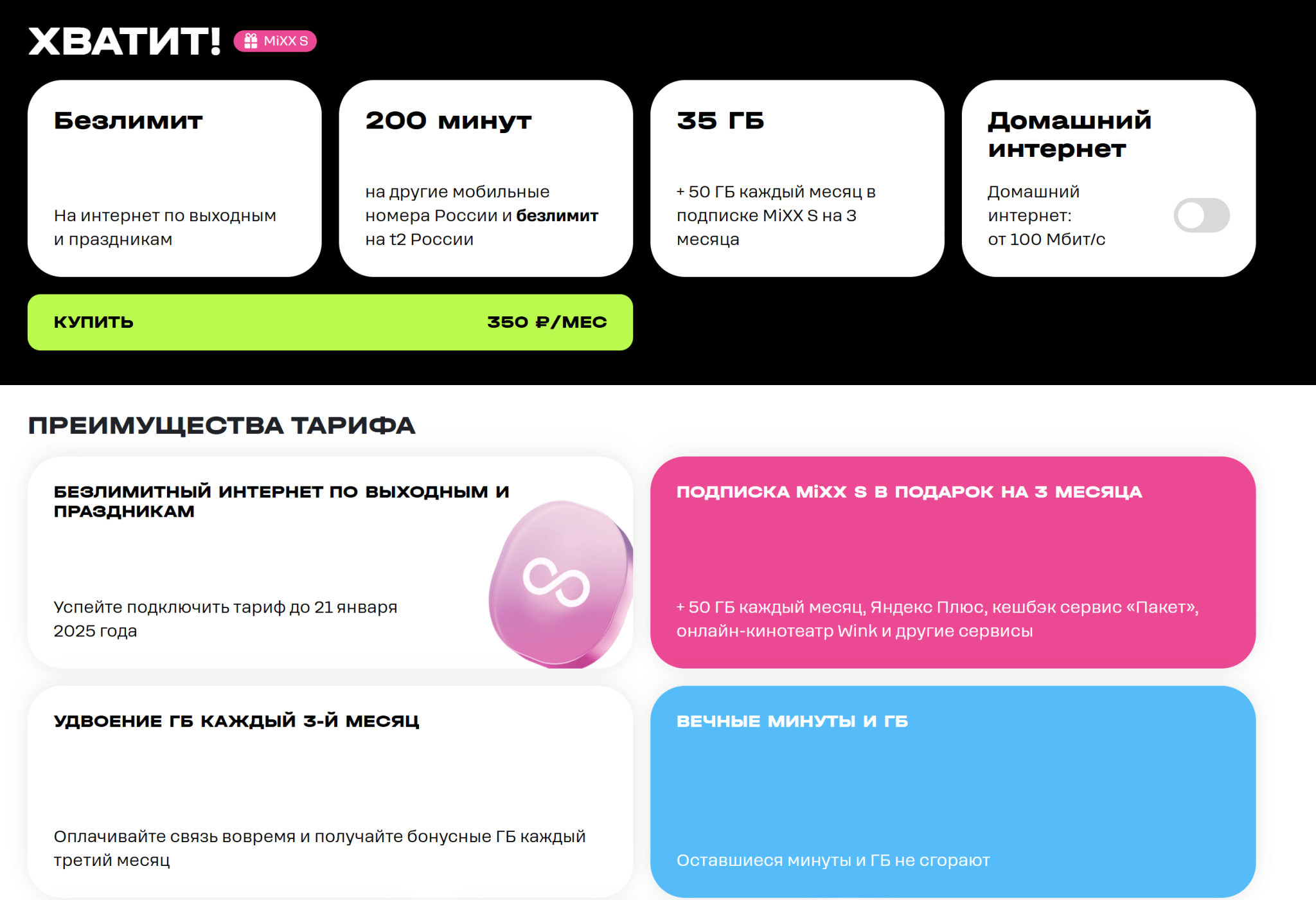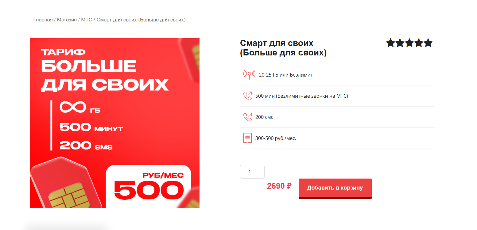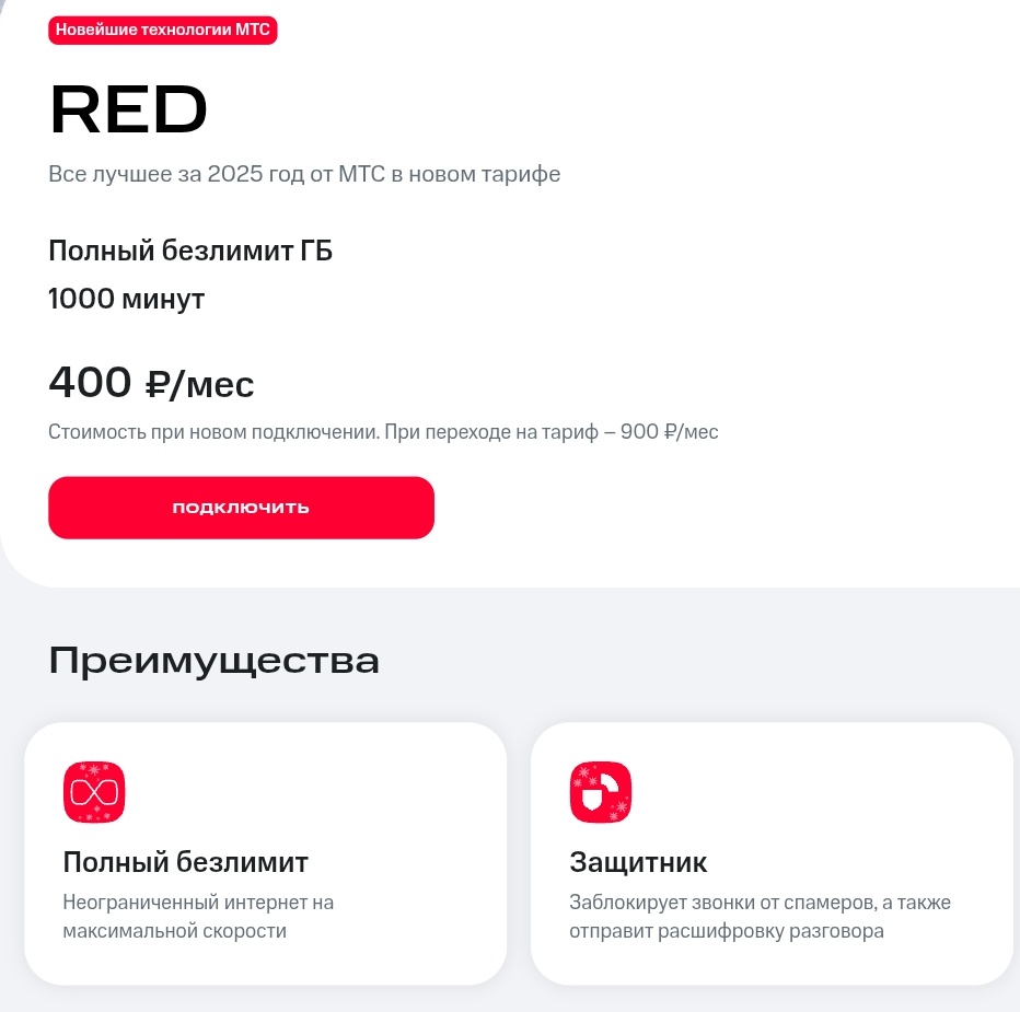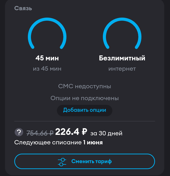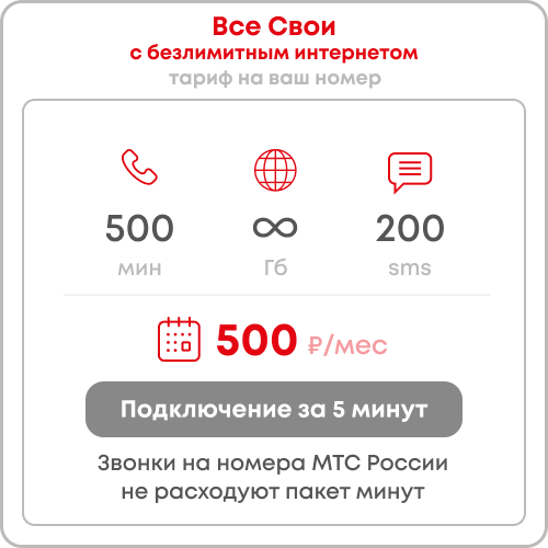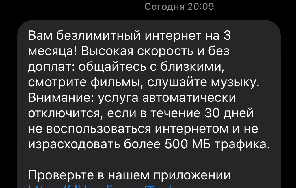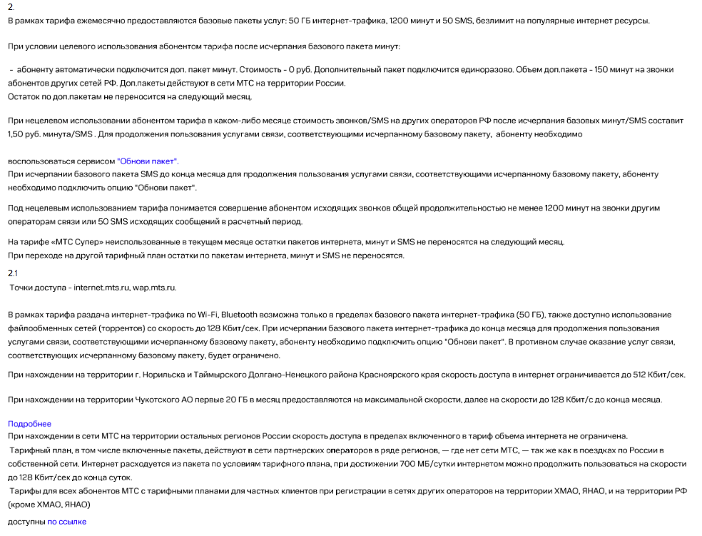 >>2688029 Не даст. А чего гореть и истерить, если не читал? Прости и сделай осознанный выбор. А проще - купи тариф "смарт для своих" у МТС у барыг. 2к стоимость подключения. 300р за 600 мин, 600 смс. И плюс 200р за опцию безлимит инет возможно тоже с подводными, если качаешь терабайты . В итоге за 500-550р 600/600/безлимит инет. Окупится за год