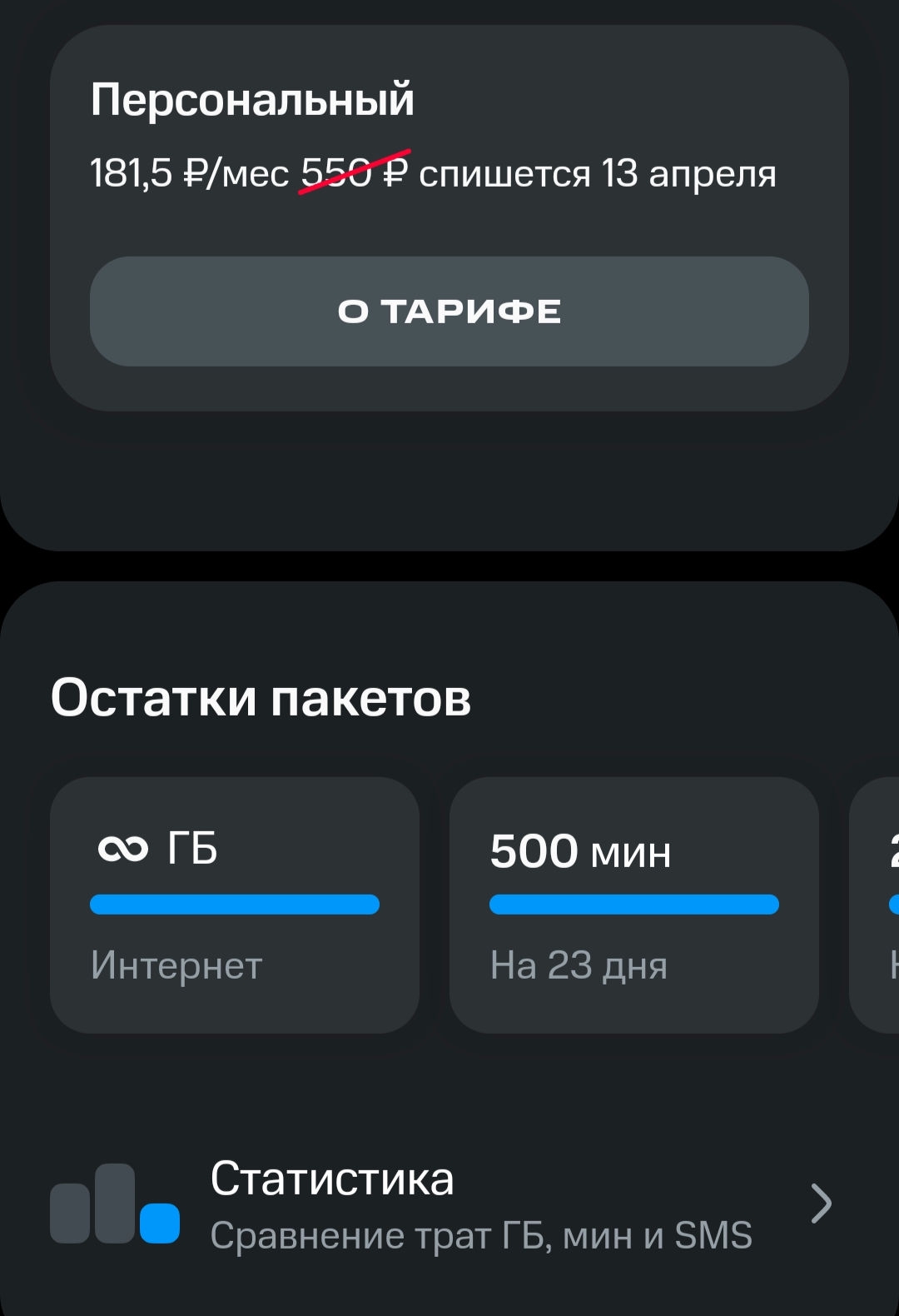 Главный прикол в том, что на работе есть челик у которого тоже архивный тариф от теле2, абсолютно теже 7 гигов и 300 минут, но с другим названием и платит он за него 500 р. А все потому, что пришел он к нему не с 90р тарифа, а с какого-то рублей за 250. Там изначально было 7 гигов и 300 минут, сейчас он в архиве и стоит в 2,5 раза дороже, чем мой точно такой же.