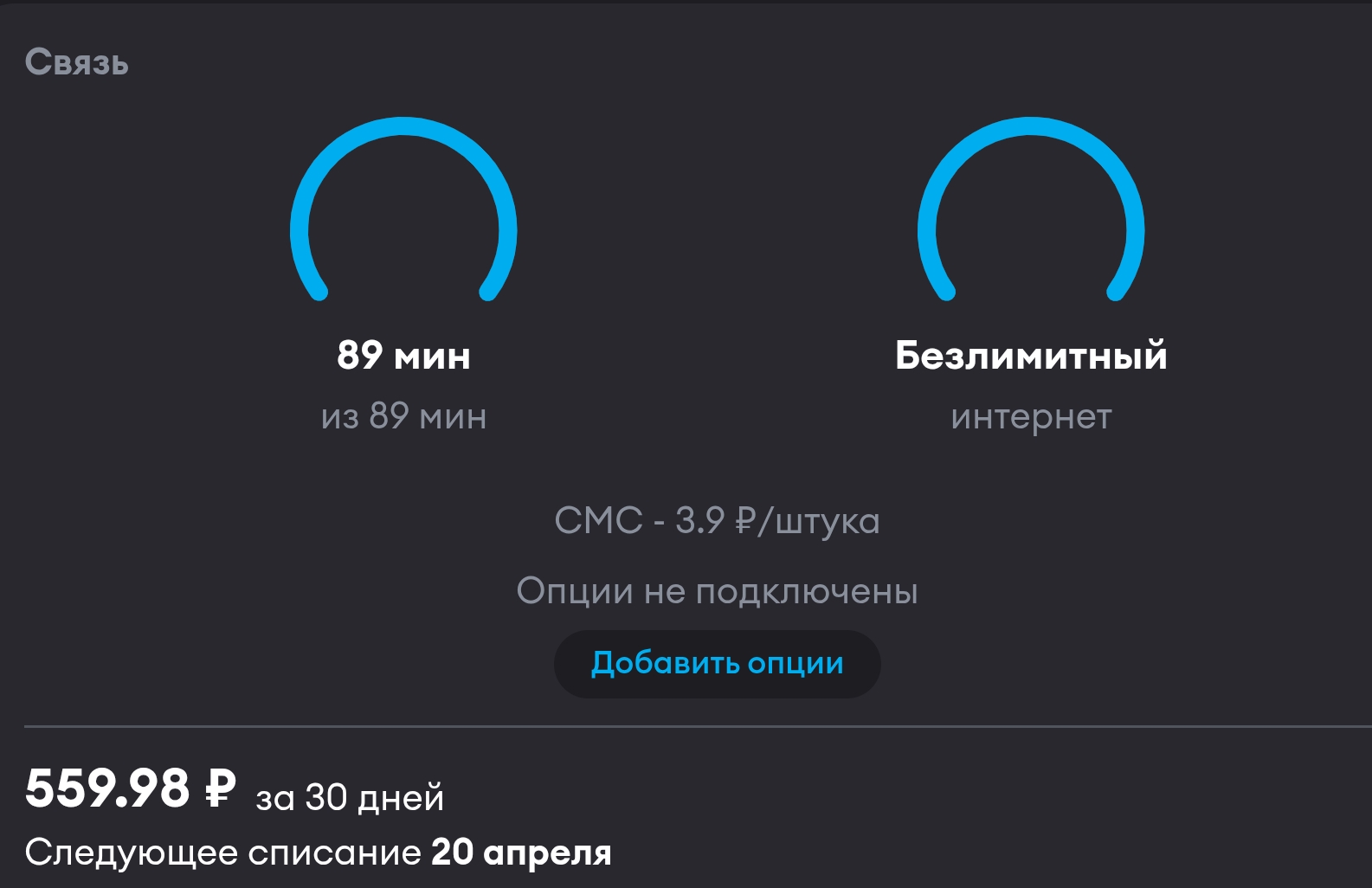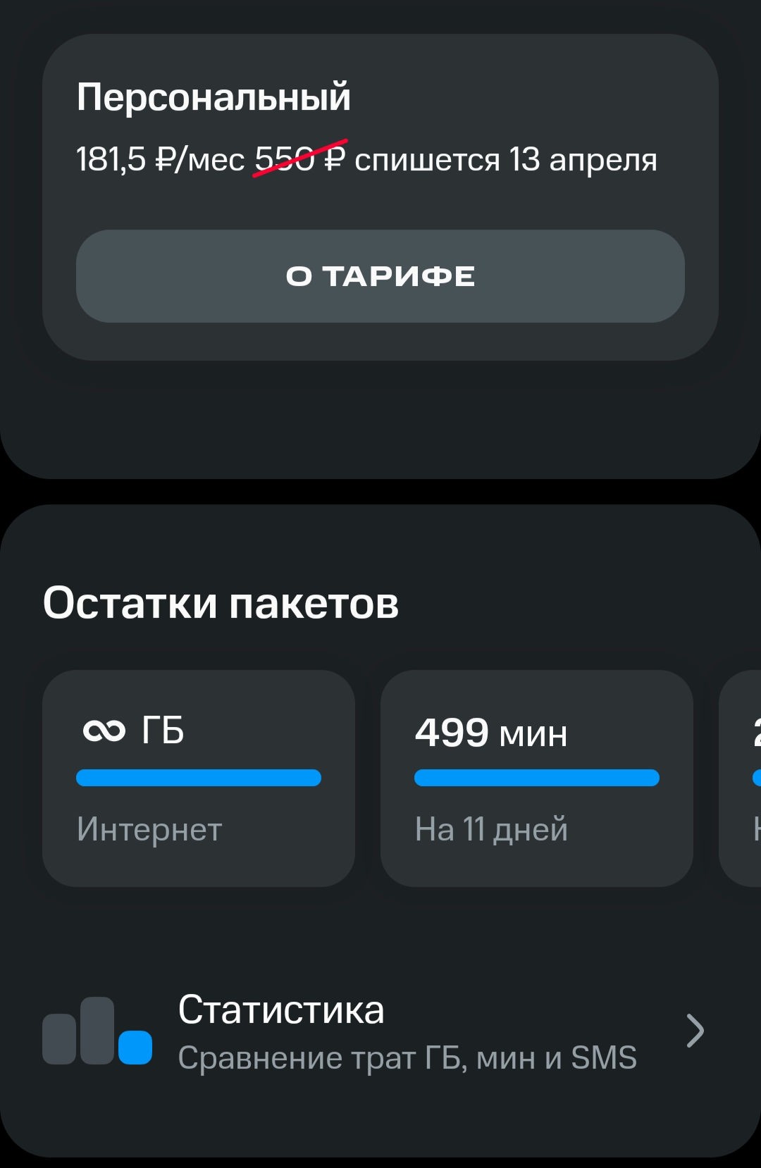 >>2626846 сейм, две симки взял недавно не то что бы супер выгодно, но по факту выгоднее не было есть в наличии еще одна олдовая симка с БЕЗЛИМИТОМ который по факту 100 гигов и последующий шейпинг скорости, еще до пакета хуяровой, там гдето 450 руб оплата, планирую просто кидать по 10 срублей раз в два месяца чтобы не заблочили