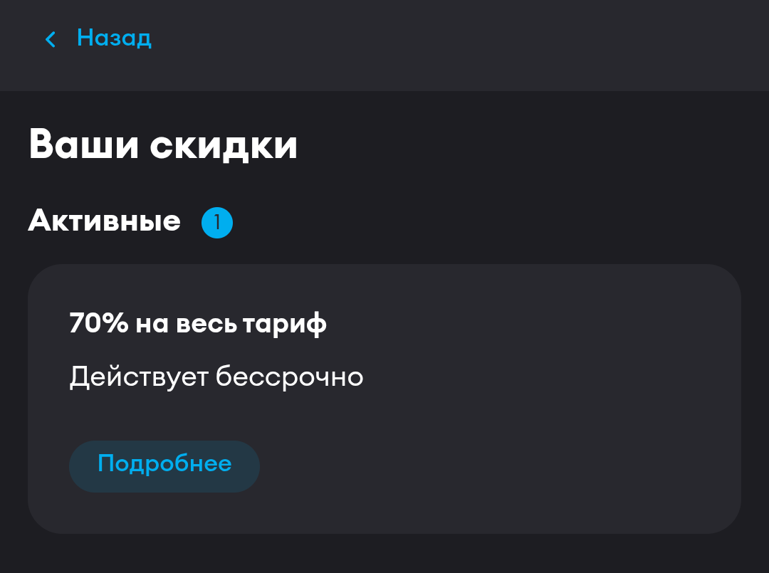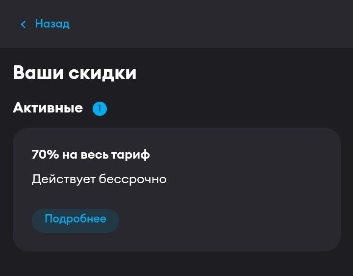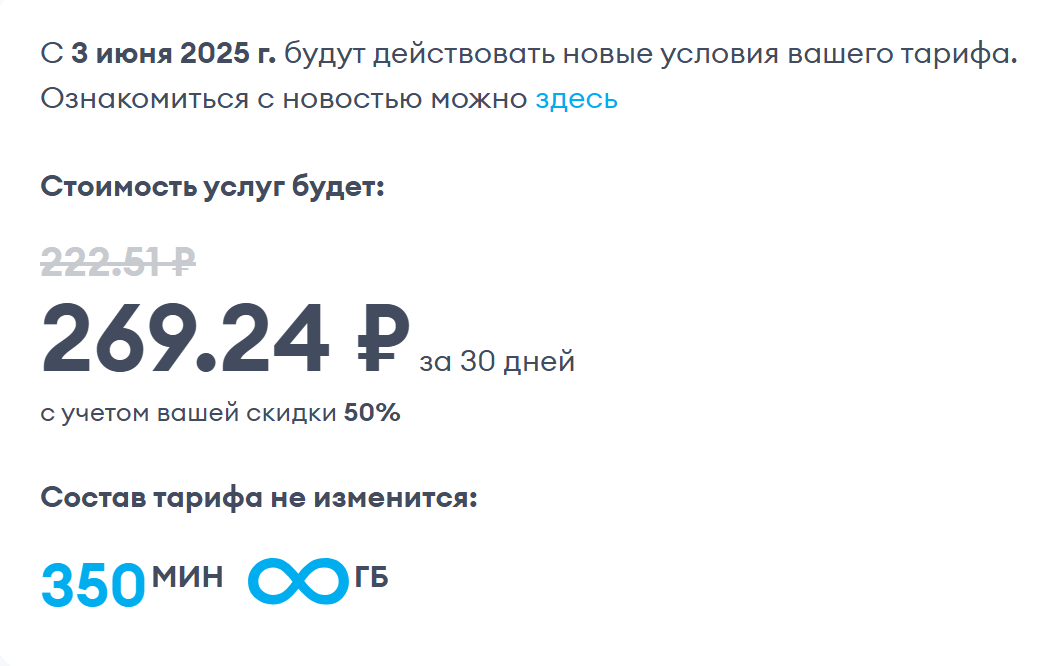 Здравствуйте! Сообщаем, что с 11 февраля ваша индивидуальная скидка на тарифе "Персональный" изменится и составит 25%. С ее учетом плата по тарифу - 300 руб/мес. Скидка применится со следующего списания, его дата и наполнение тарифа остаются прежними. Подробнее о причинах: mts.ru/pers При этом даже с учетом изменений тариф останется выгодным как по стоимости, так и по наполнению.