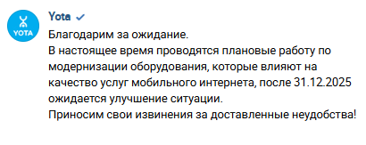 Меня йота на симке купленной в январе доёбывала постоянно поменяйте симку а то отключим роуминг. Напугали ежа годой жопой, я все равно никогда никуда не ездил. И вот 3 дня назад с интернетом случился пикрил. Калоградская область, то есть как в Рашке интернет не глушат, а скорости нет. Это блять смех, вернулся во времена диал-апа.