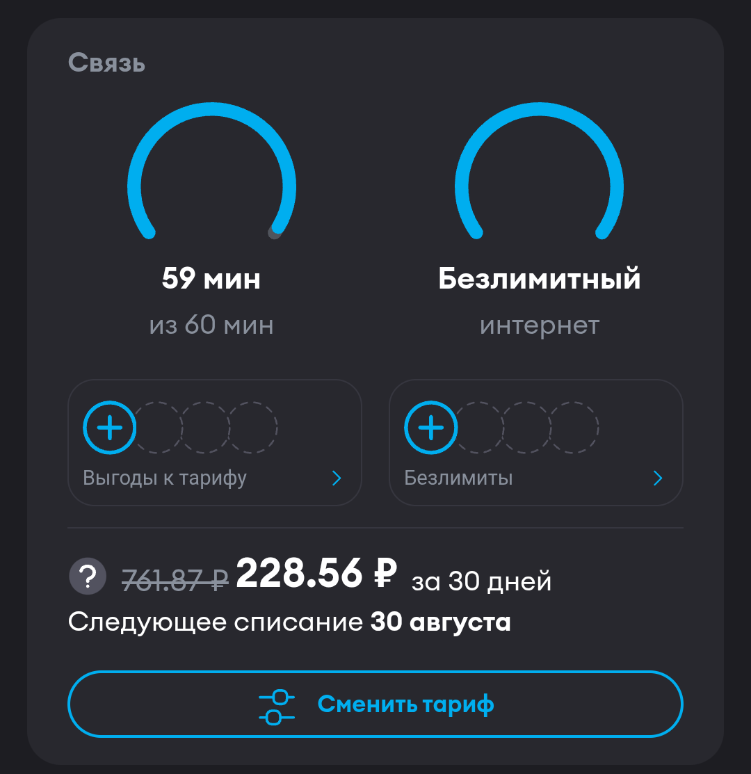 >>2683441 Потыкал свои банковские приложения, нашел этот хидден гем (газпром мобайл). Подводные? Да, 150р при предоплате на год, но все равно очень выгодно выходит
