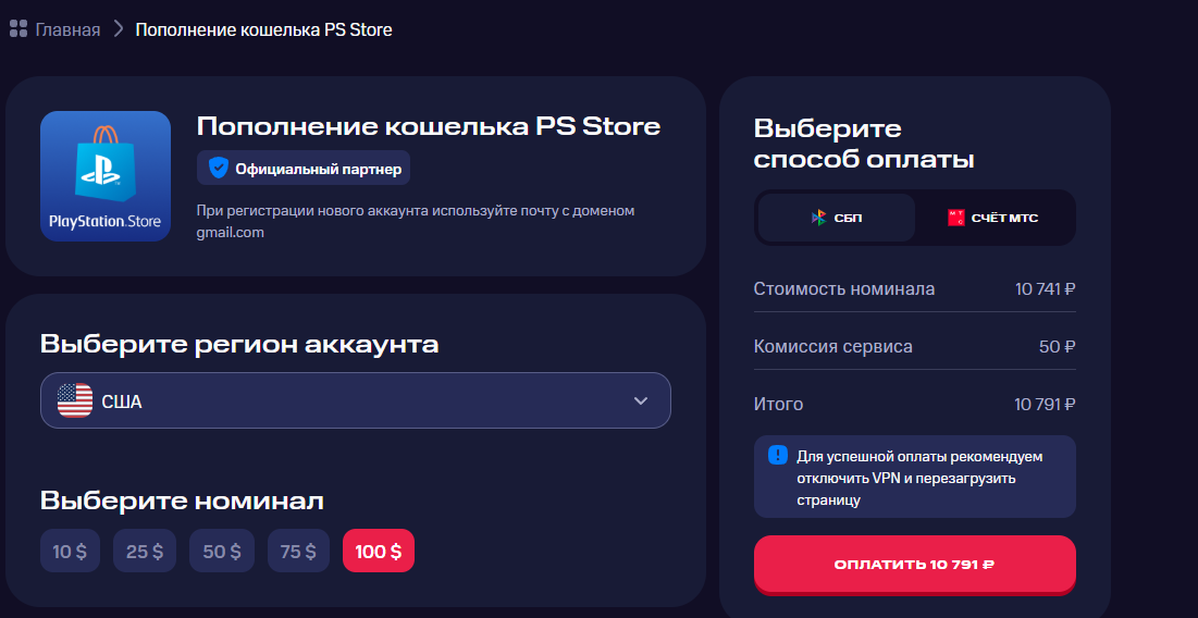 $100 на PSN у Билайн - 8879, комиссия Билайн - 0, итого - 8879