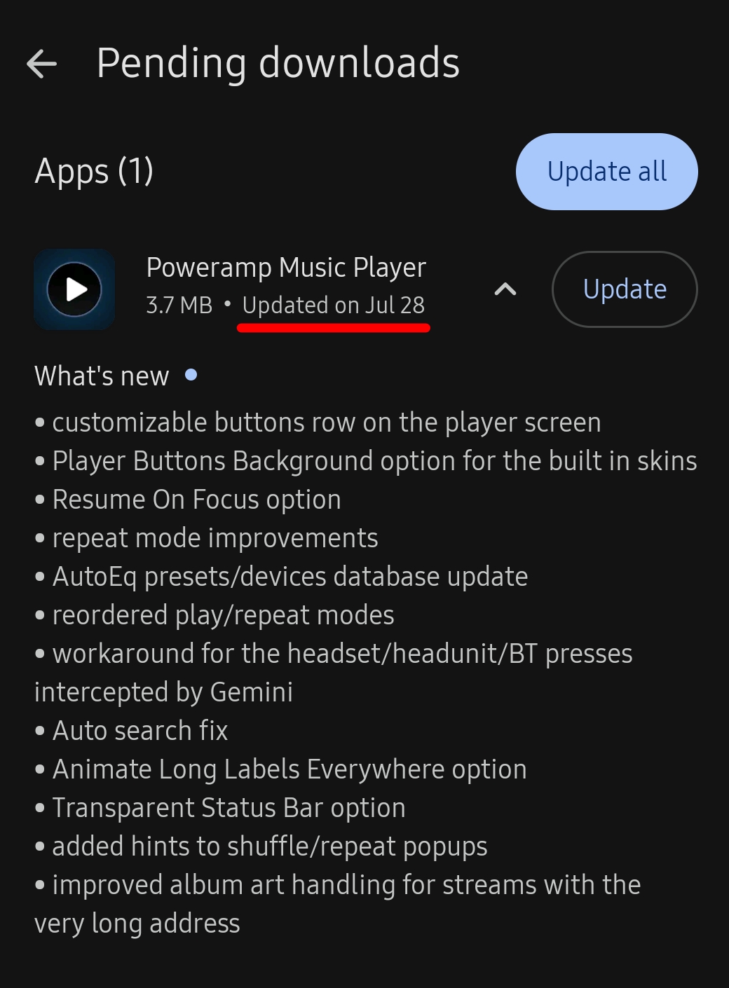 Ааа ещё из плюсов. Можно приложение скрыть из обновок. И если подписи не совпадают. Ну там мод стоит к примеру. То оно предлагает переустановить приложение. Сначала удаляет, а потом устанавливает.