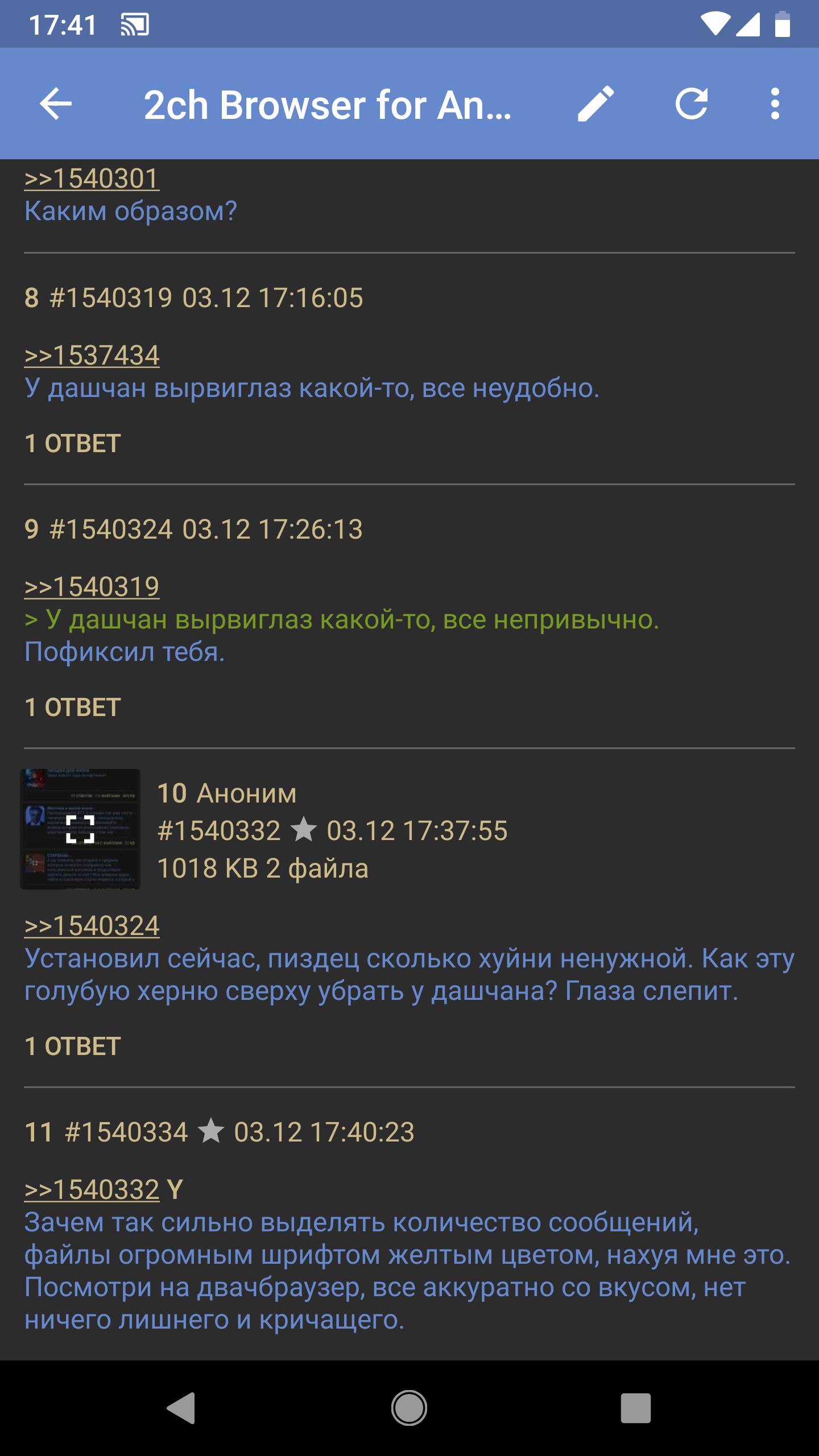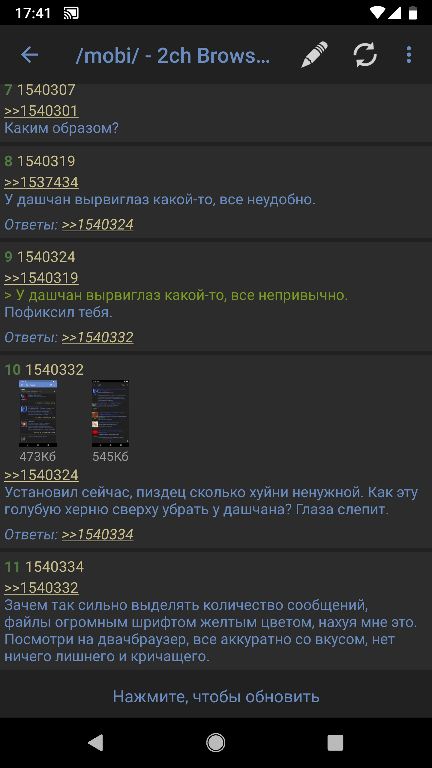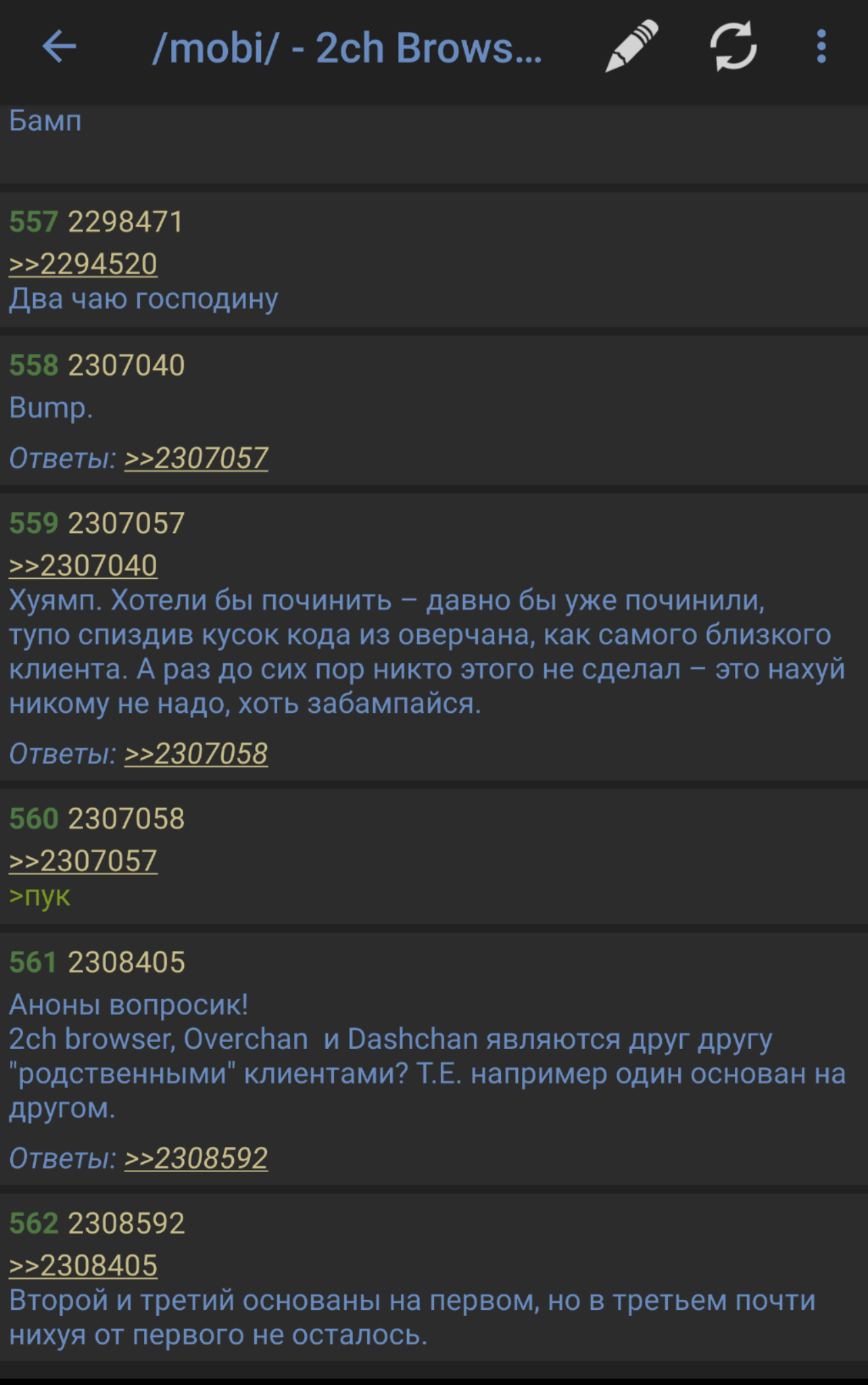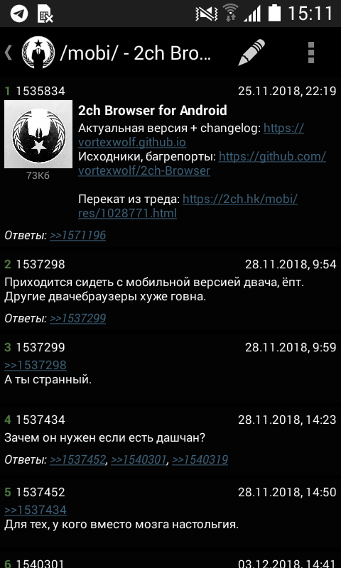 Лучше бы действительно полезные реквесты обсуждали, а не свистелки всякие: - Импорт/экспорт данных - Поиск текста в треде - Поддержка архивных (/arch/) тредов - Сохранение состояния открытых вкладок при закрытии приложения