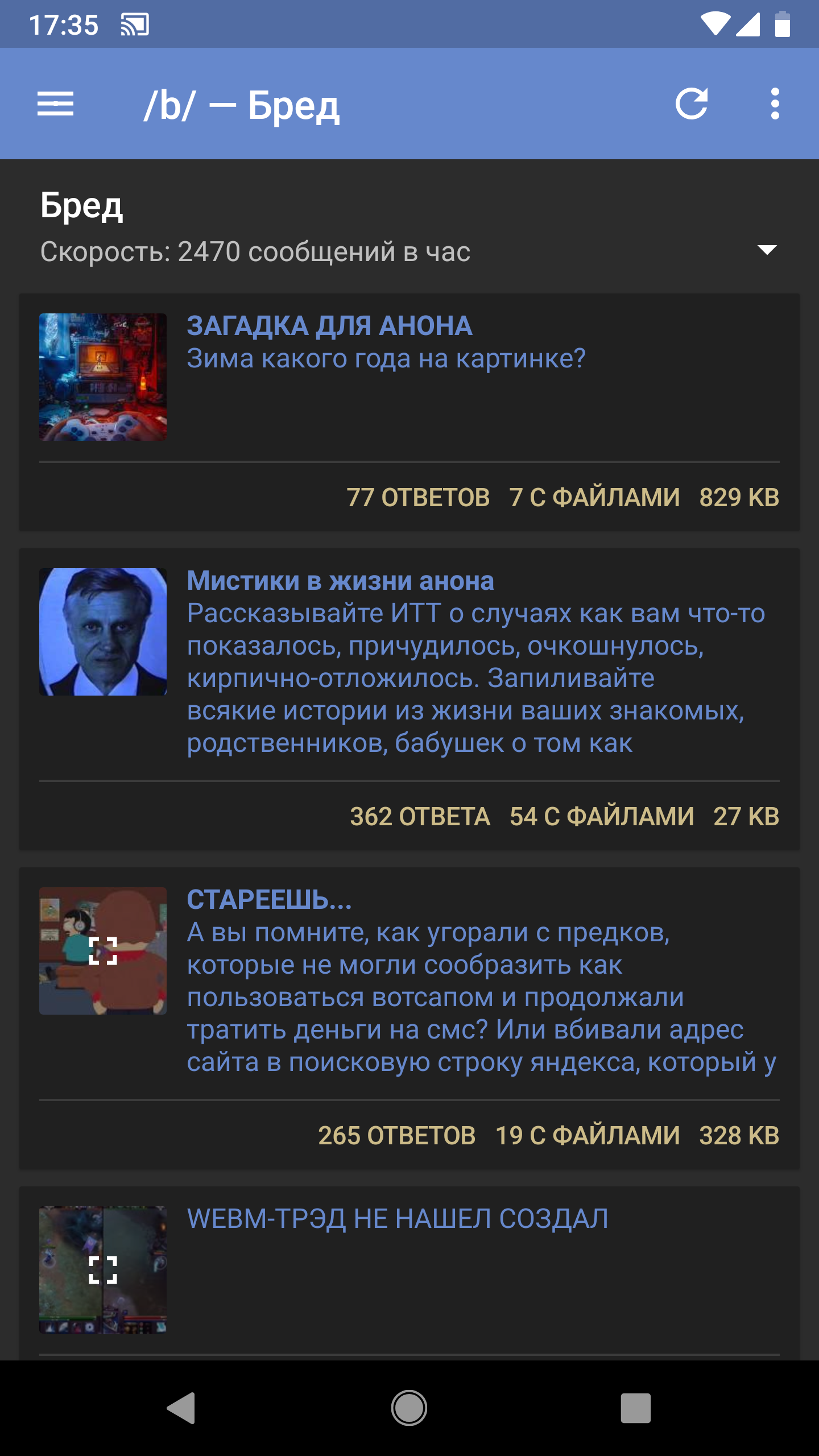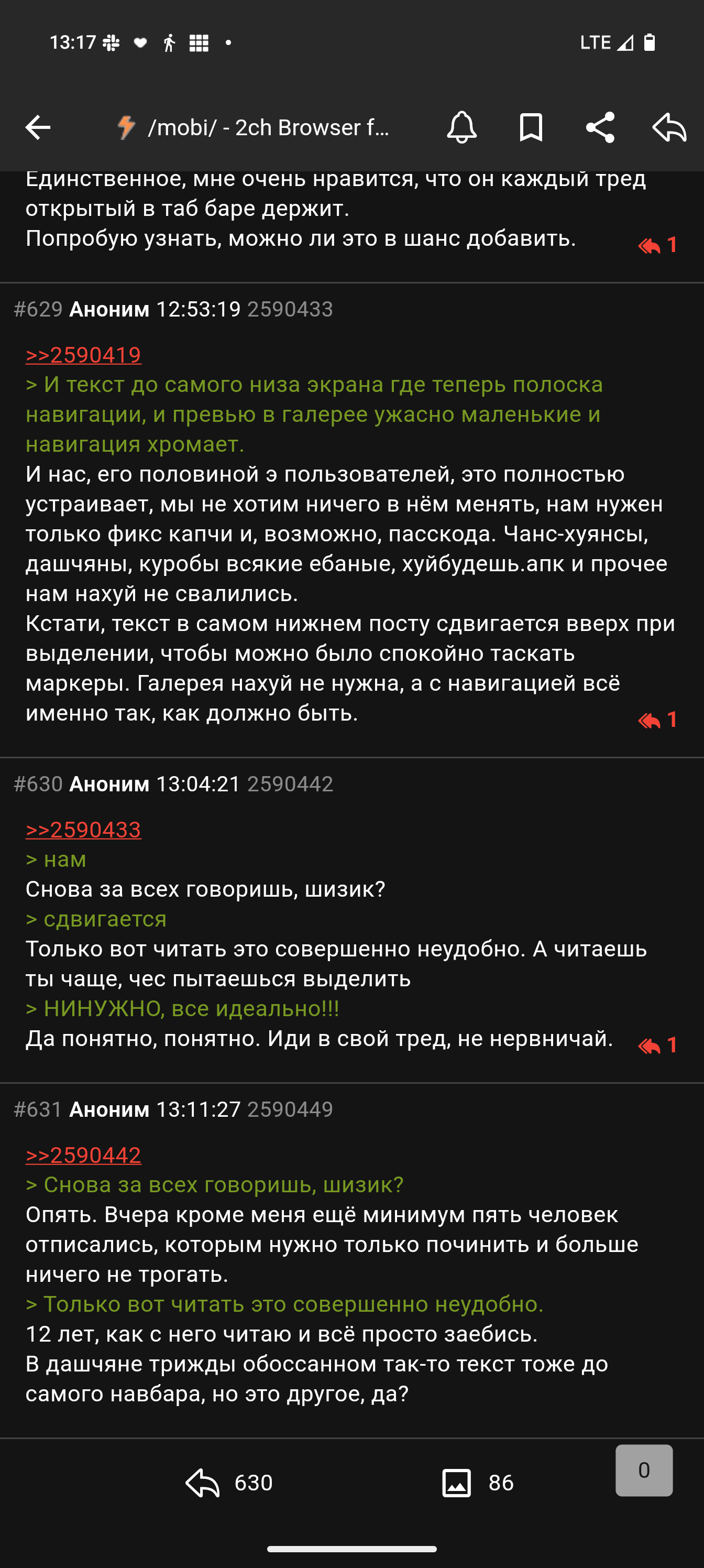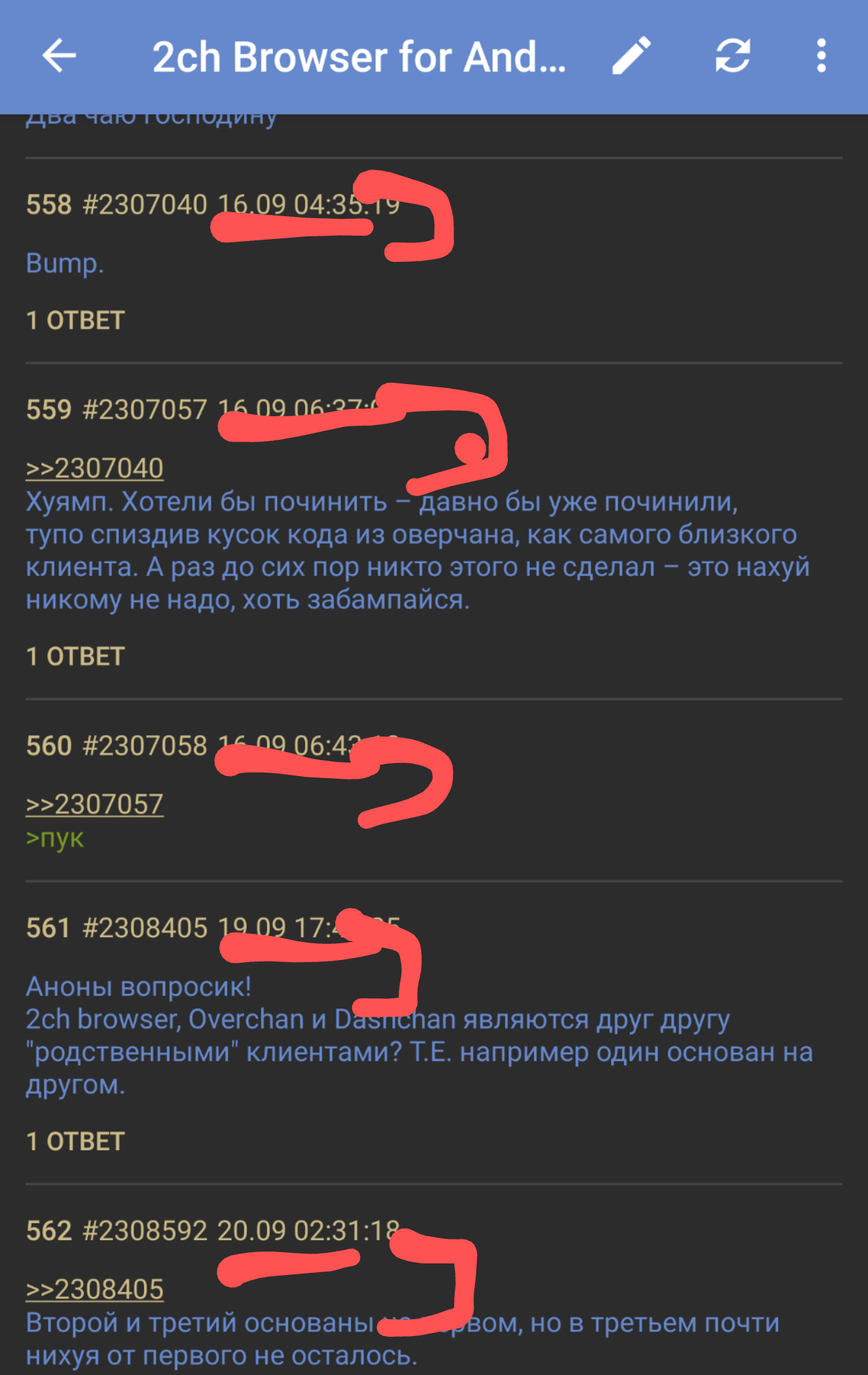 Лучше бы действительно полезные реквесты обсуждали, а не свистелки всякие: - Импорт/экспорт данных - Поиск текста в треде - Поддержка архивных (/arch/) тредов - Сохранение состояния открытых вкладок при закрытии приложения