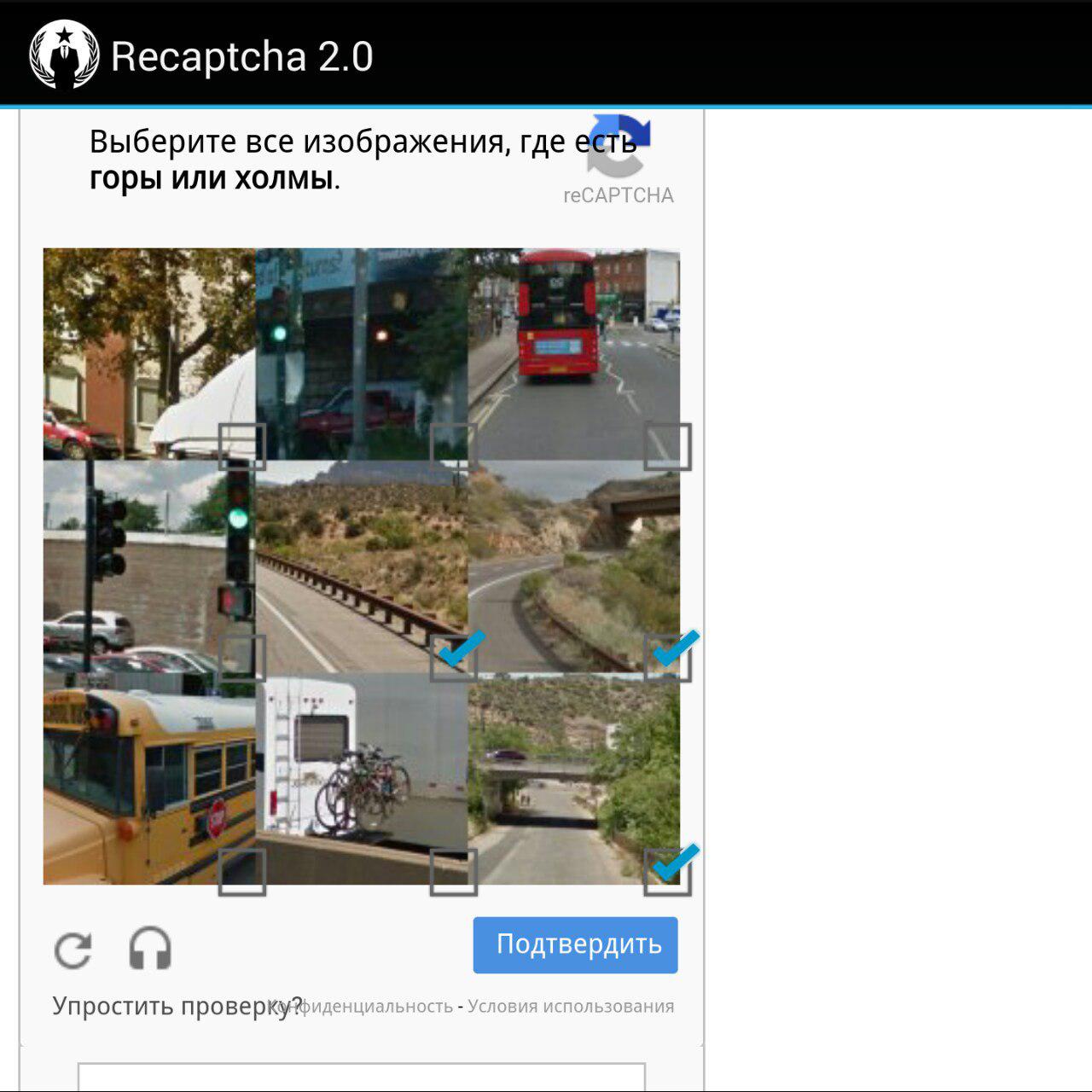 >>1651260 И вот так у меня выглядит капча. Приложение последняя версия с оффсайта. Правда я в Украине, на территории России у меня посты не отправлялись тоже. Не знаю, влияет ли это.