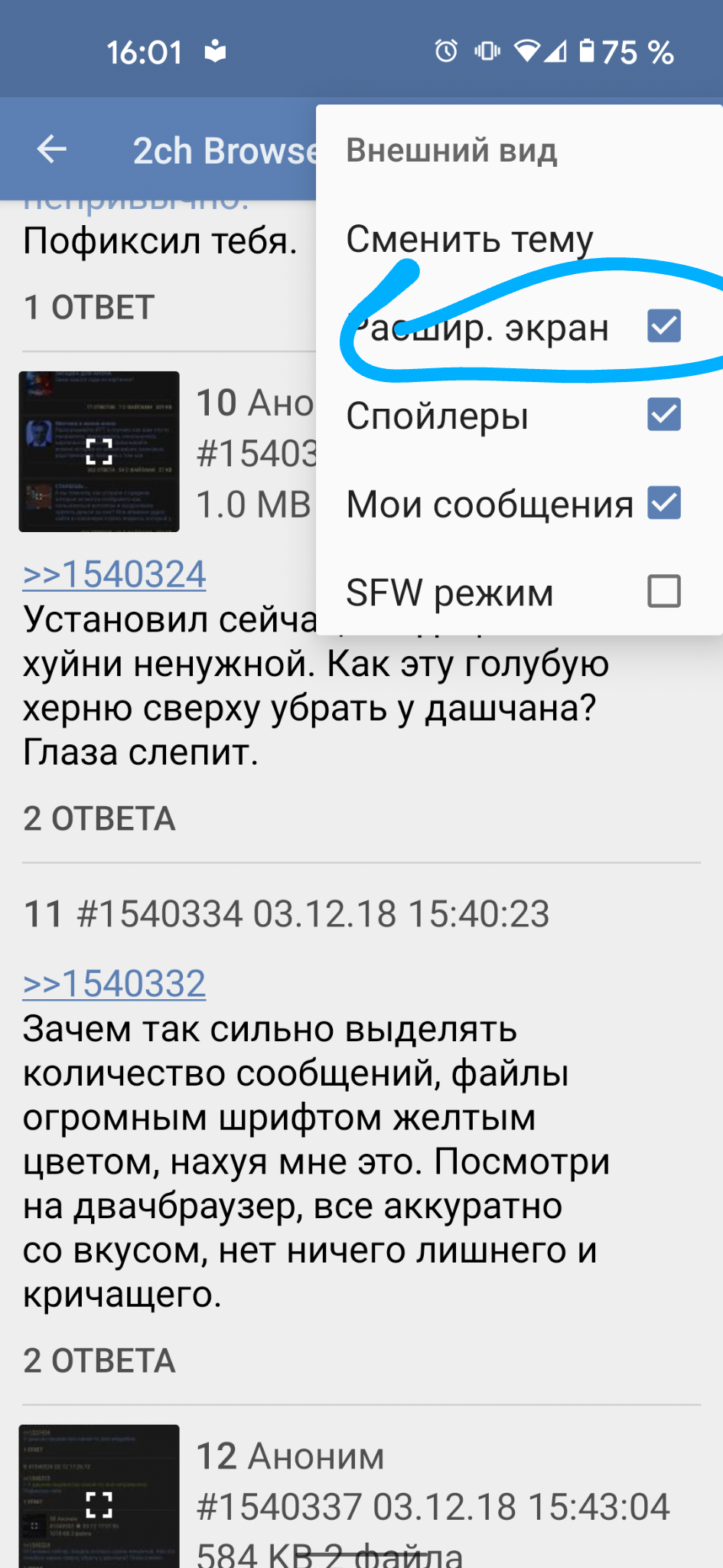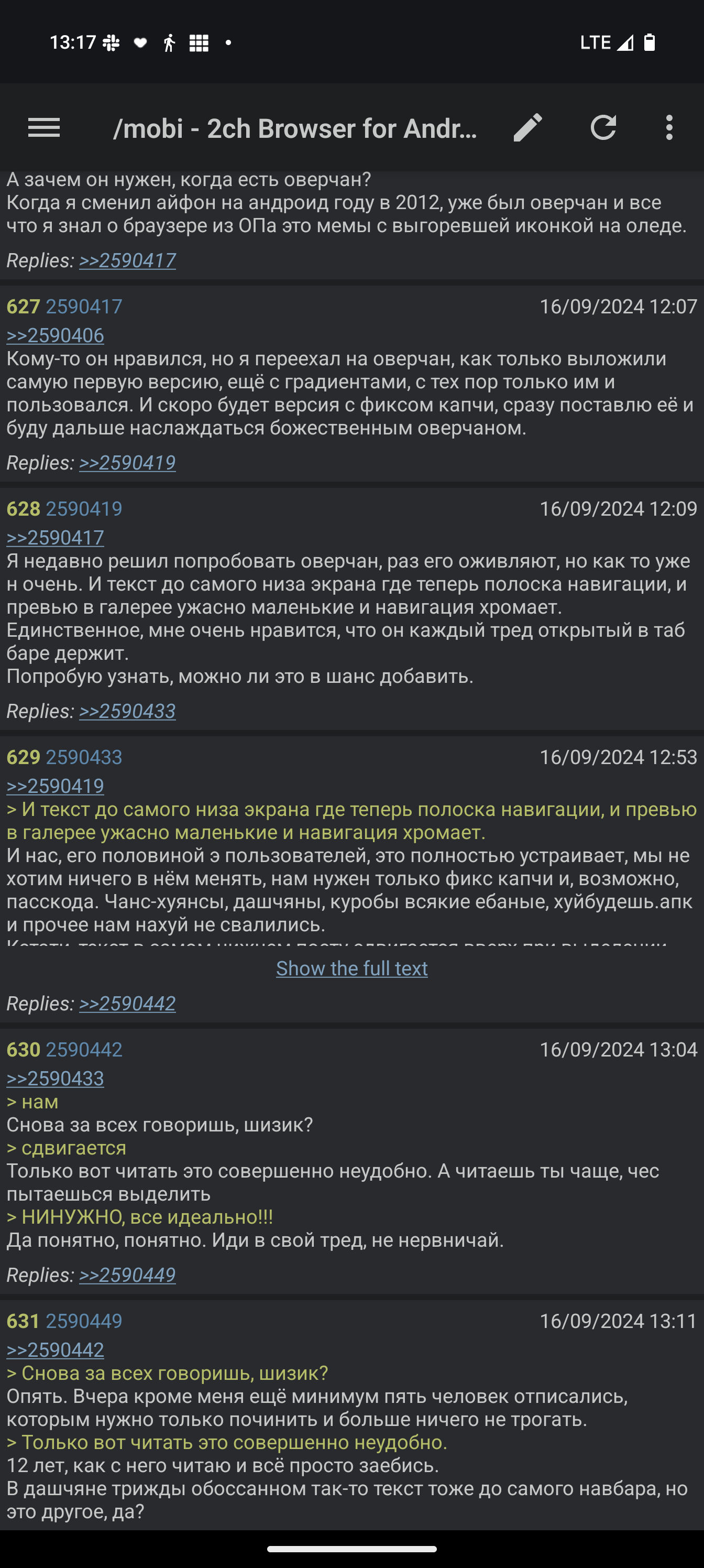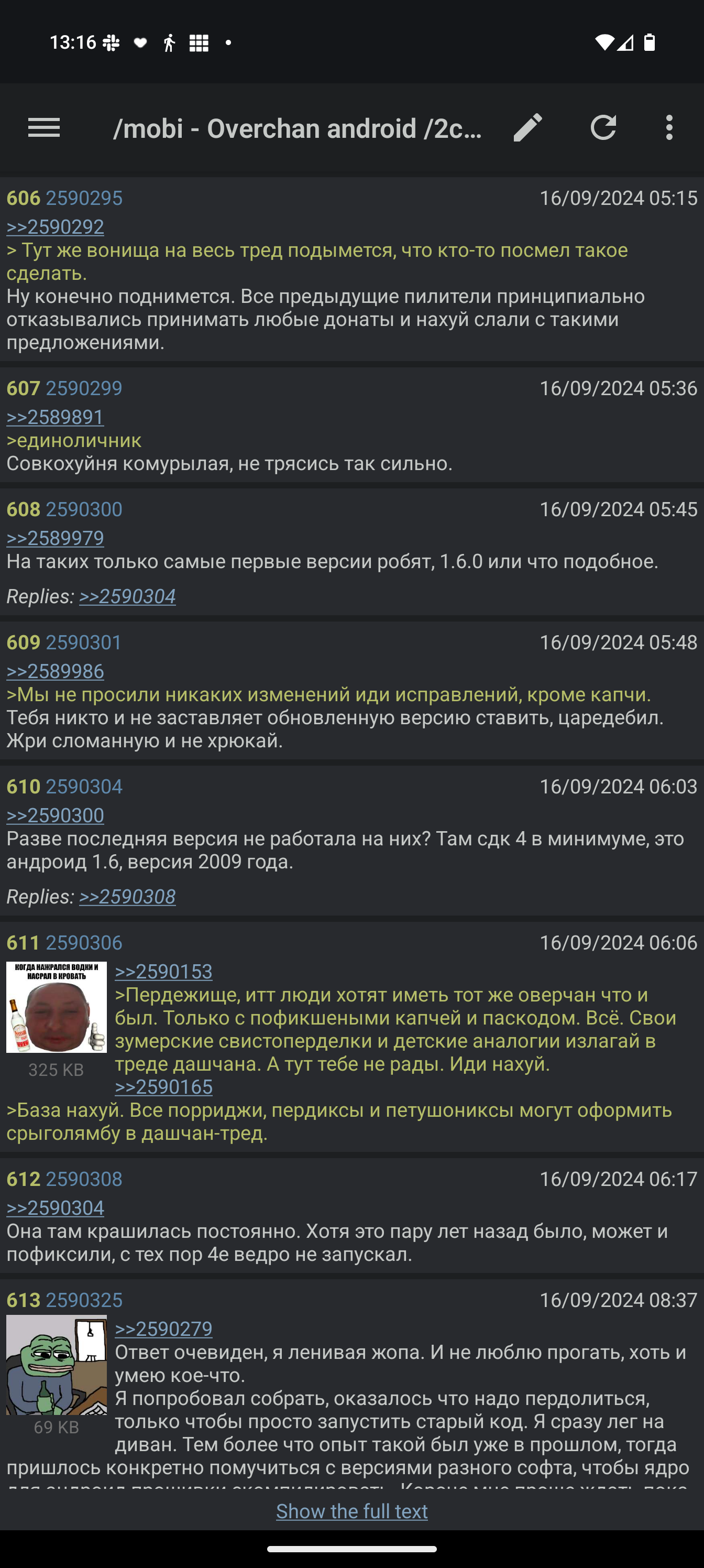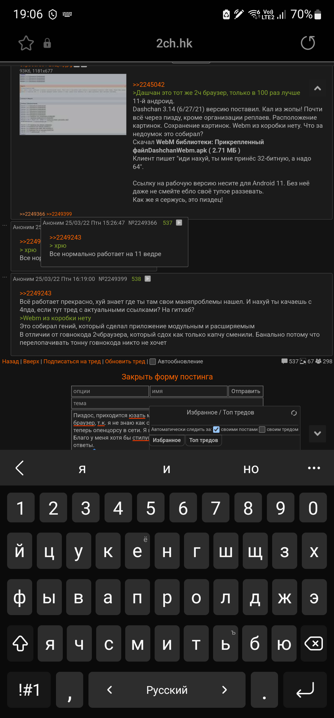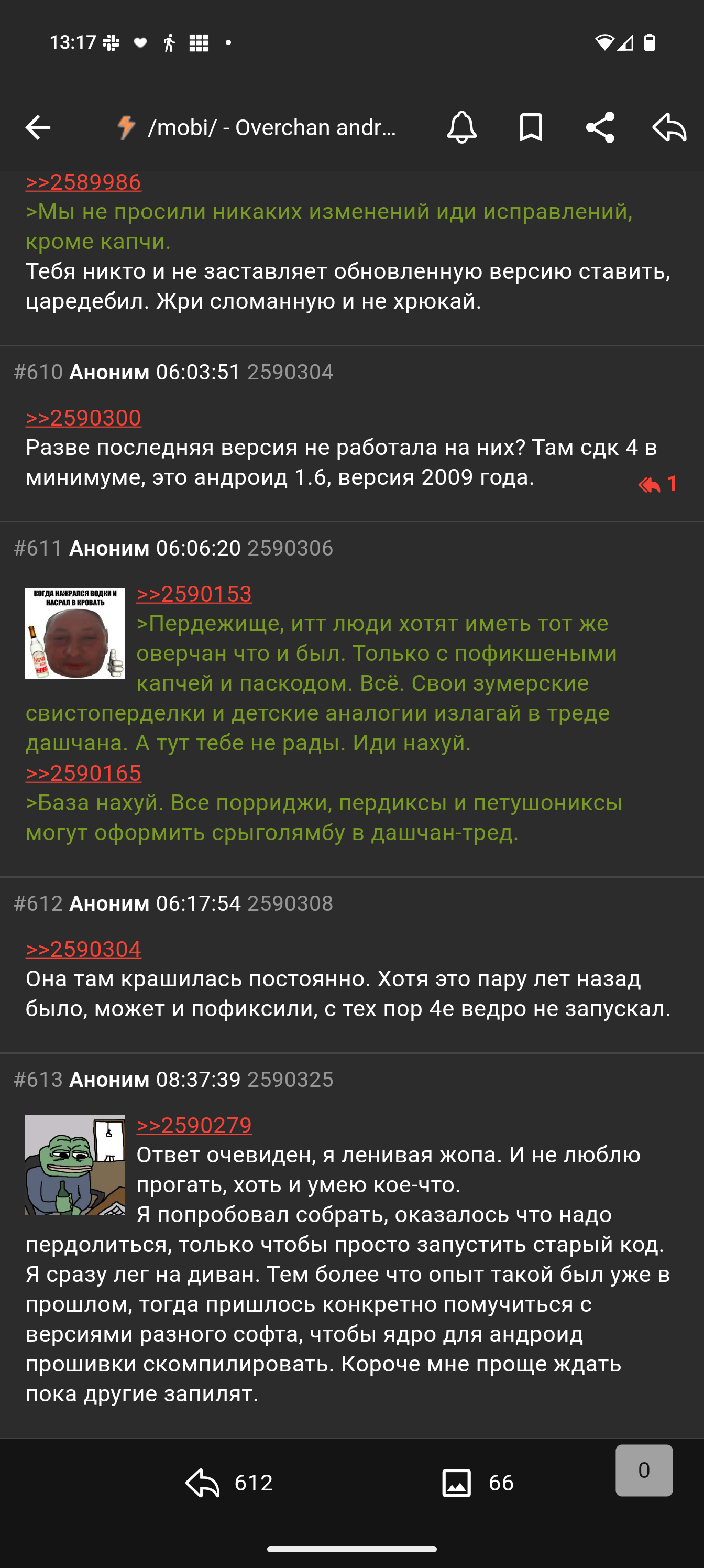 >>2238815 >вырвиглазный дизайн и UX времён android kitkat Времён раннего материала из лолипопа, который был лучше современного материала, кстати. >нет расширенного поиска с фильтрацией Ну и хуй с ним, ни разу не было нужно. >быстрого перехода в разделы Просто держу каталоги нужных мне разделов в боковой панели, куда уж быстрее? А в ненужные мне разделы и переходить незачем. >и меню открывается только от края экрана Да, так и есть, но мне и не нужно боковое меню от середины экрана. >он неудбный Для меня удобнее дашкиного поделия хотя бы тем, что нормально работает со вкладками, не надо ничего добавлять ни в какое избранное, что удобно в номерных тредах (или просто когда много сотен тредов открыто с кучи имиджборд, как у меня), в одном списке вкладки с разных имиджборд, а также это по сути своей двачбраузер на стероидах. А ещё здесь есть подтверждение отправки поста, что очень удобно с пасскодом, не отправится недописанный пост. Ну и никакого ебанутого разделения на блядские модули дебильные, всё сразу в одном приложении.