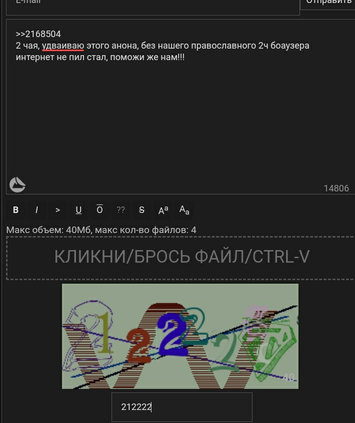 Поставил я этот клятый дашчан, все какое уебищное в нем, неудобное. Я нихуя не могу разобраться как сделать чтоб работала капча со светофорами, пишет инвалид капча. Зато здесь работает капча с цифрами, сто лет ее не видел. Напишите у кого работает 2ch браузер, я не хочу на этой помойке сидеть.