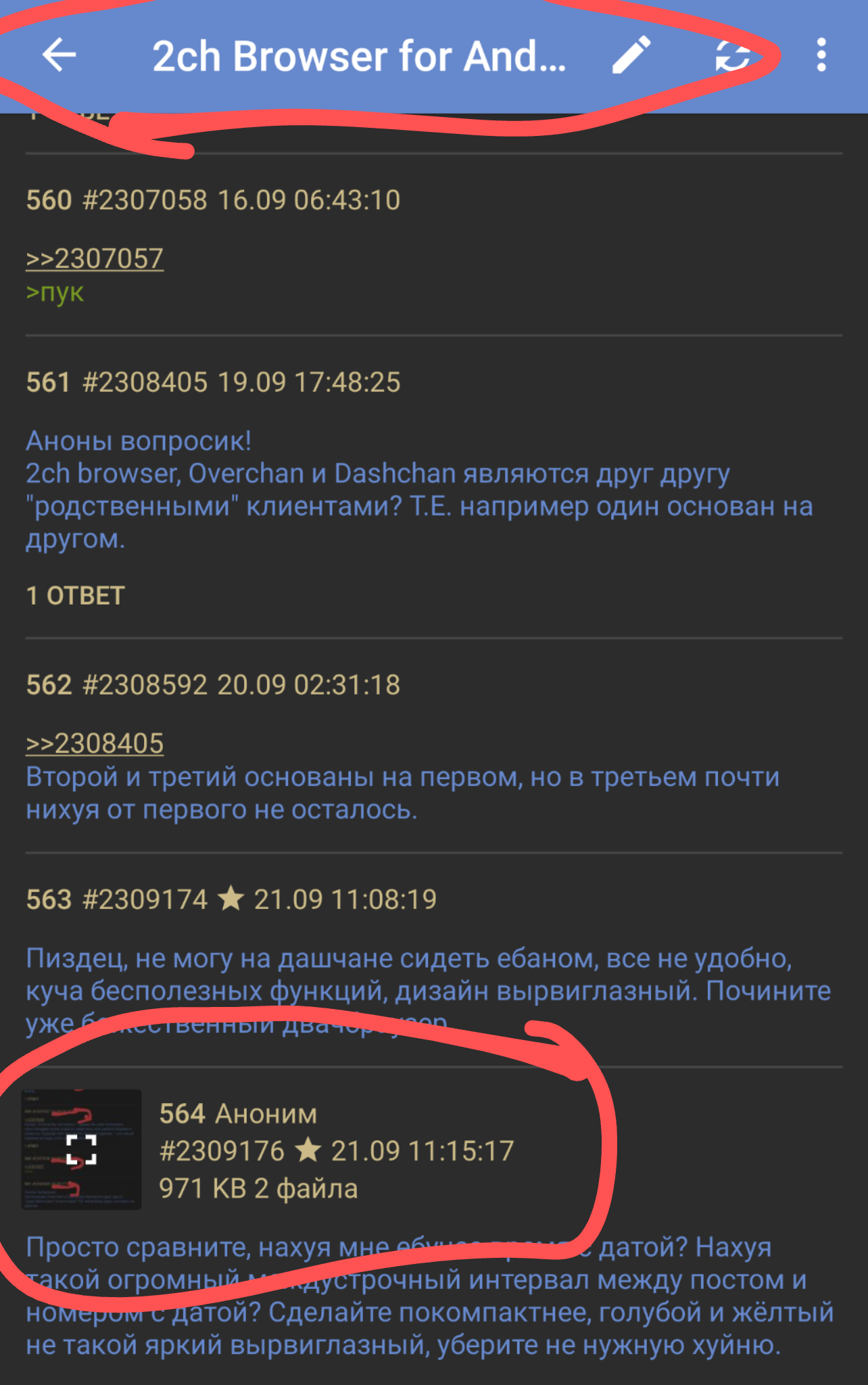 >>2131593 Буду утверждать. Здесь все хуевое, все не так сделано. Причем этот клиент пилится годами хорошо хоть видео научился проигрывать не во внешнем плеере. Я просто помню когда мобильное приложение только зарождалось, 2ch browser был спасением от кривой мобильной версии сайта. Потом он забухал и начался дашчан. Хотя в приложении вортекса все охуенно было с самого начала, он только устранял какие-то баги когда из запоя выходил. Никаких свистелок и перделок, все по делу. Чому в дашчане нельзя было просто скопировать идеал, а дальше плюшки прикручивать. Должна быть кнопка "сделать все как в 2ch браузере". цифровая капча только прикольная, она много лет не работала на 2ch браузере, еще бы сделать ее той самой, уебищной как 10 лет назад был бы бальзам на душу олдам