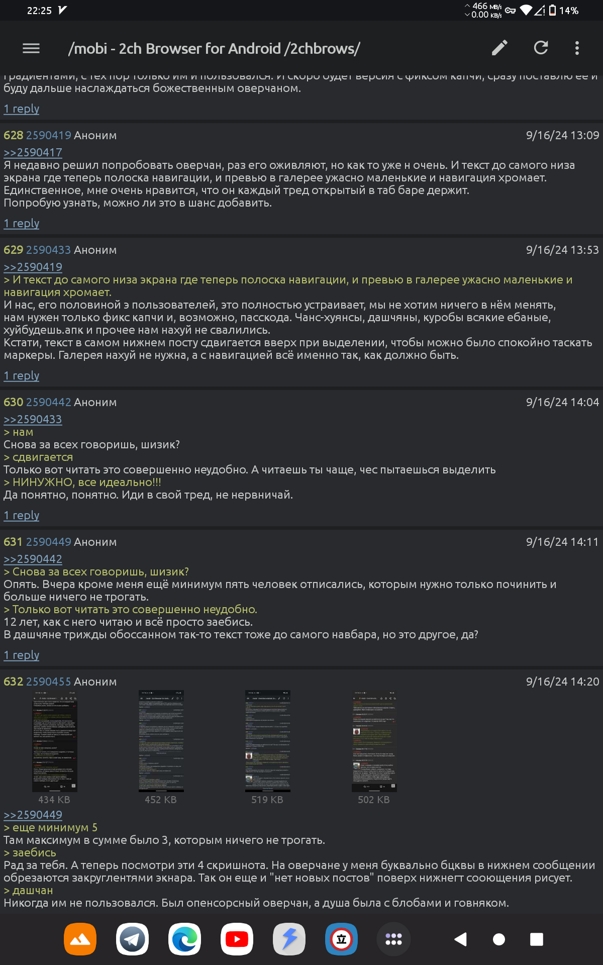 Какой шакал догадался сделать кнопки "Добавить в закладки" и "Сохранить все изображения" рядом? Промахнулся и случайно сохранил 153 изображения из треда. Где их теперь искать? Даже папки указанной по-умолчанию нет на SD. Чини, блять! Нахуя кнопки разметки ПОД формой постинга, да еще и такого шакального размера? Чини блять! Что с капчей? Чини блять! Нахуя ты устроил эту автоматическую залупу с отправкой почты? Сложно было сделать отдельный пункт/форму в настройках для жалоб и багтрекинга? Чини блять! Какого хера реклама появилась? Чини блять! Анон скажет что я бомбанул - да, так и есть. Но я не ожидал такого топора вместо клиента для двоща.