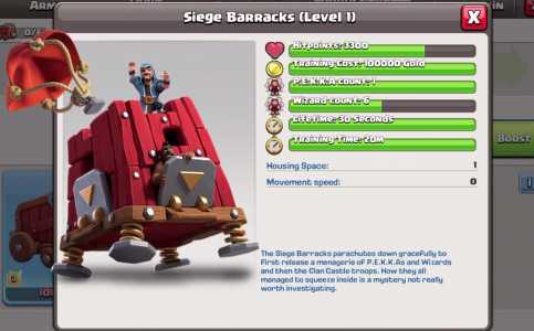 А вчера презентовали новое осадное оружие. Скидываешь его на свободное поле, оттуда вылезает сразу же ПЕККА, потом маги друг за другом с небольшим промежутком. Как только все вылезут, или хп осадного опустится до нуля, выбежит и/или вылетит подкреп из кк. В принципе, полезная штука для зачистки площадки перед высадкой основной армии, но будет ли она часто использоваться? Ведь стены тоже чем-то придется ломать?