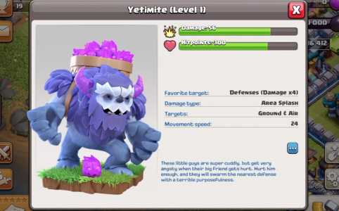 Вчера анонсировали нового юнита, которого можно будет открыть после прокачки бараков на 12ом тх. Приобретается за эликсир. Из особенностей у него "йетимиты", которые вылупляются из него при получении урона. Число их ограничено, зависит от лвла и если он сдыхает прежде чем они все вылупились, то вылезут оставшиеся. Наносят 4х дамаг по зданиям дэфа и перепрыгивают через стены.