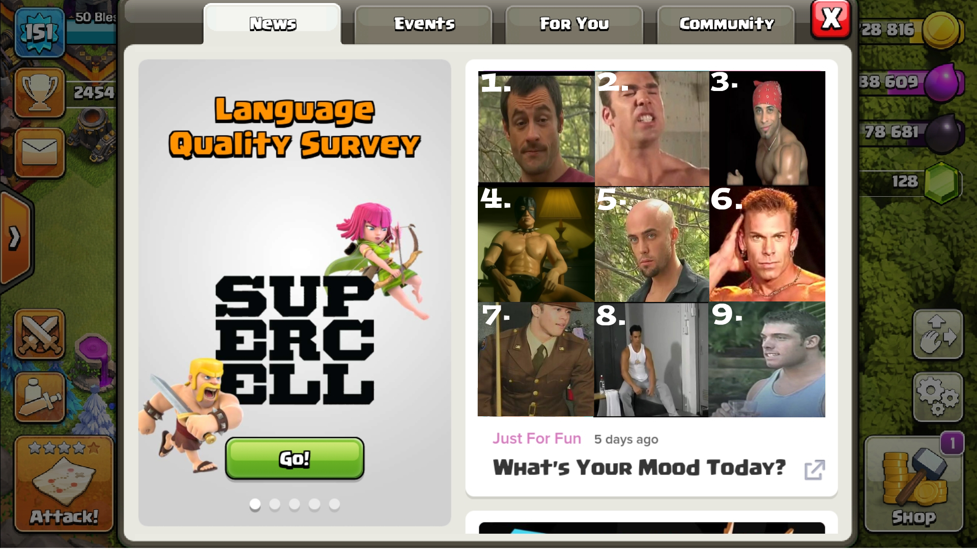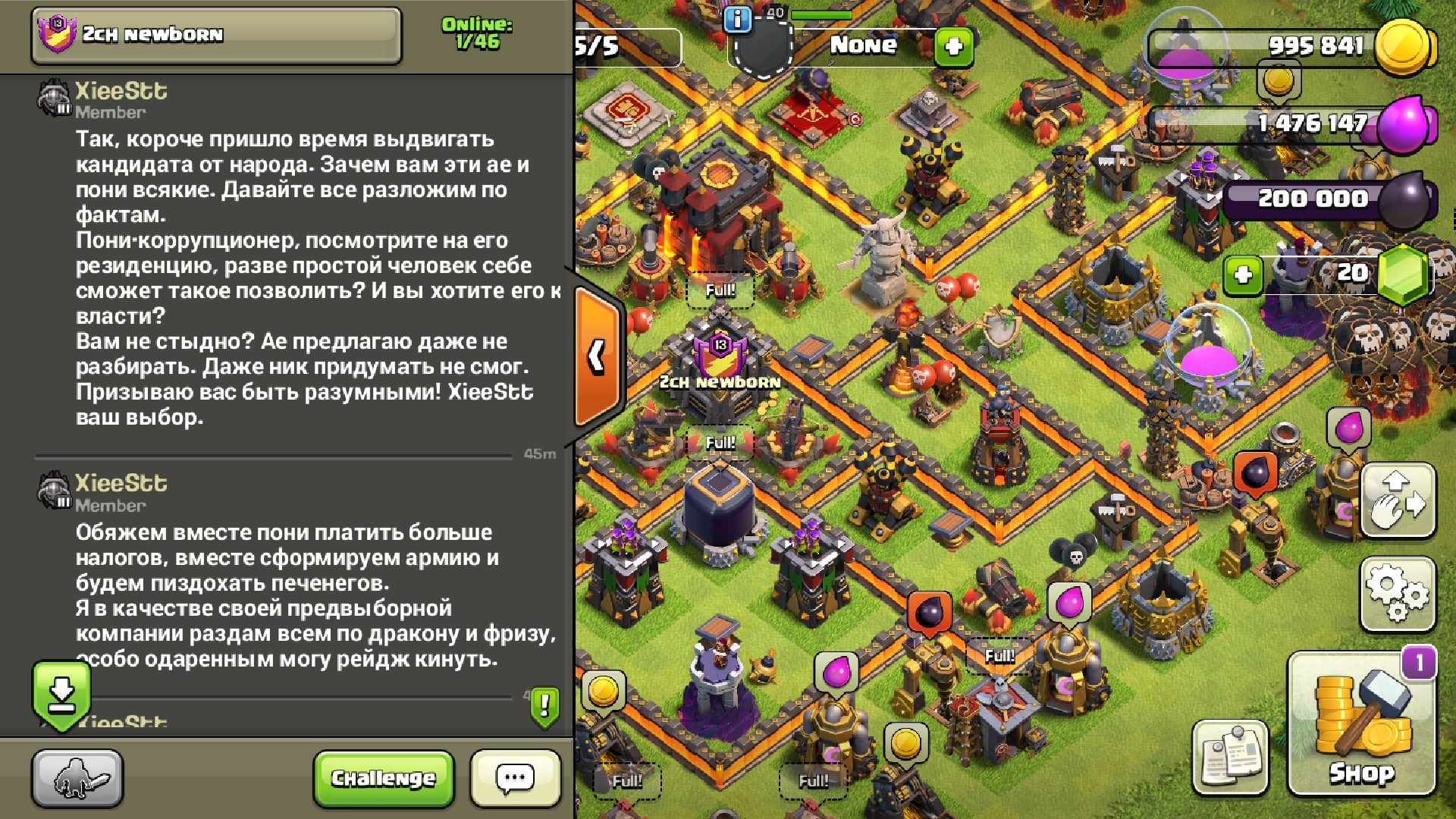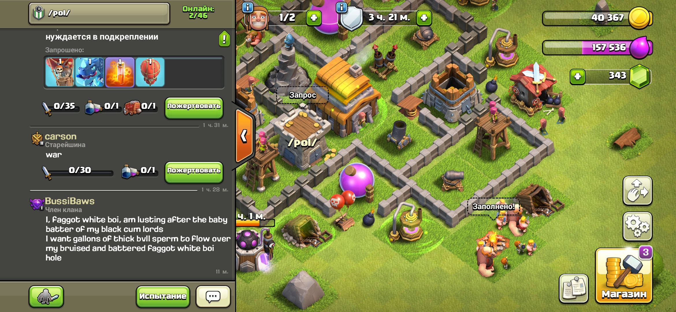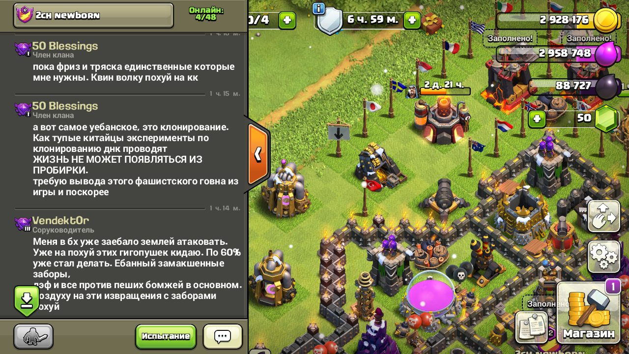 Густой сервер, нефритовая игра, сильный лидер, свободный страна. Я это, БАЗУ вам принес покушать. По порядку: >руна у торговца >ивенты + 4х бонус >задержки с апдейтом и несколько перерывов Казалось, суперселл выпустили новую обнову, героям дали доп жизнь и еще несколько мелких приколов, заебись? А на самом деле это был троянский конь дяди си цзиньпина илки. Всех китайских игроков поместили на отдельный сервер с цензурой и социальными кредитами, без предупреждения. Сейчас, если найдете в лиге китайских игроков, у них нельзя посмотреть профиль или перейти на их деревни. Их по сути перебанили, многие не могут нормально зайти в игру. В китайской версии игры другие ивенты и награды, у зелья скелетов поменяли иконку и тому подобное. Много жалоб на баги в кв против китайских кланов и прочий пиздец.