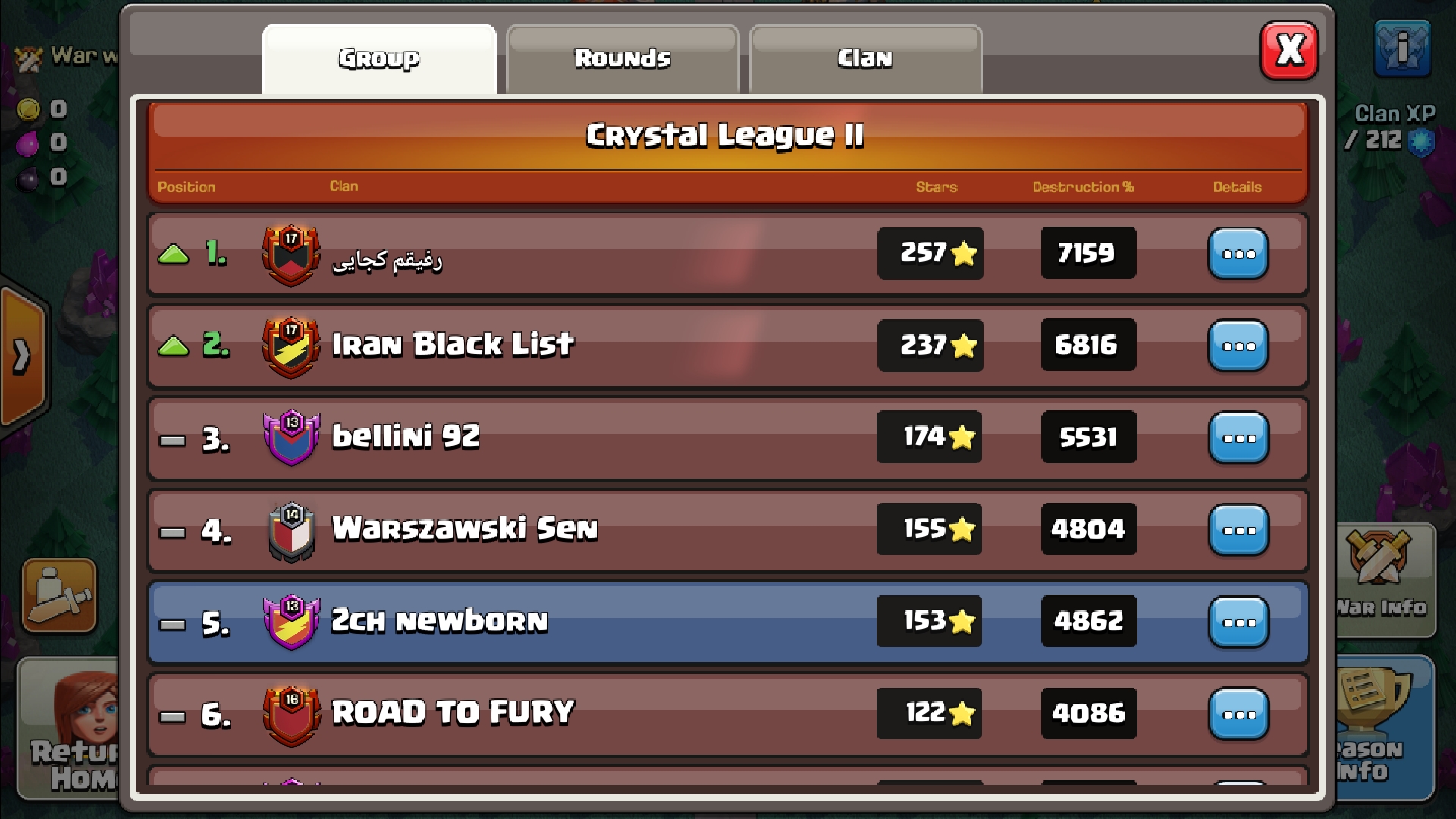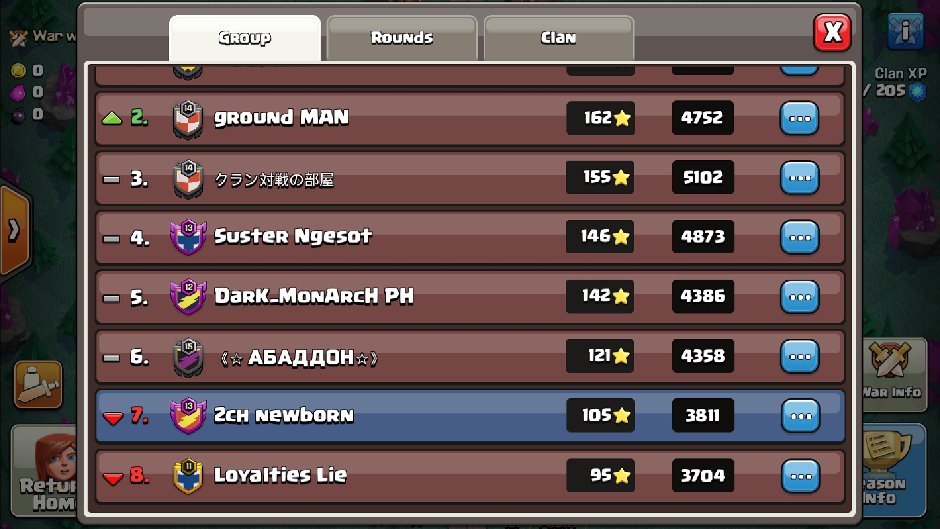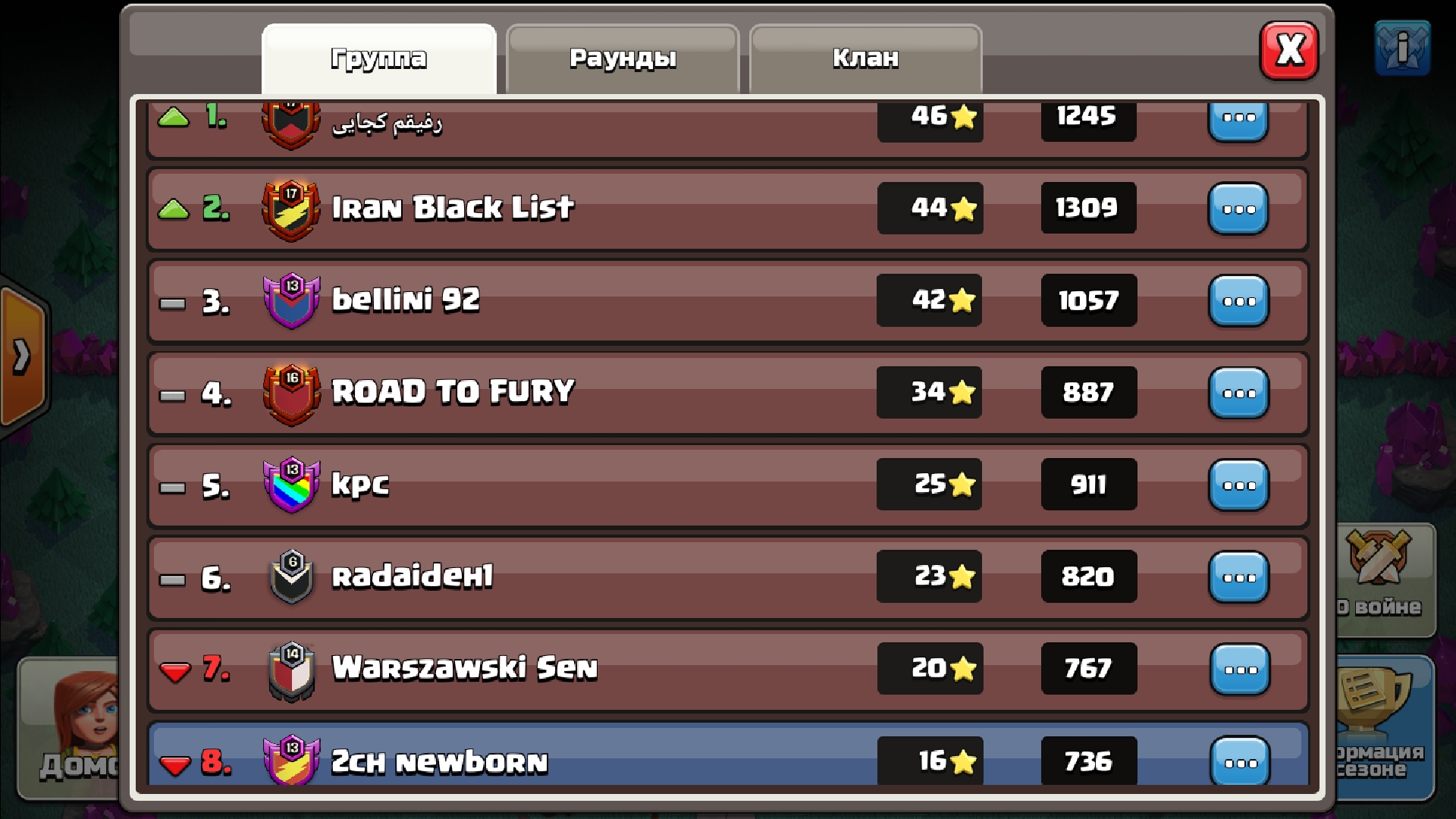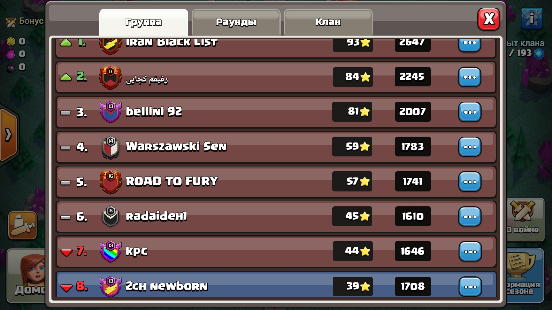 -И сразу к серьезным делам. Пока США и Иран решили поиграть в войнушку, у нас началась настоящая мясорубка ввиде ЛВК. И это полный пиздец товарищи. Чекаем фотокарточку с текущей таблицей и наблюдаем минимальный разрыв в 1-2 звезды между нами и вашим очком остальными кланами. Пиздилка в идеале за топ 2 чтобы апнуть лигу и получить медалек и ордена на грудь, чтобы место в автобусе уступали. Но скорее всего будет 3-4 место, что кстати уже неплохо УЧИТЫВАЯ ЧТО У НЕСКОЛЬКИХ ЧЕЛОВЕК КВИНА НА АПЕ БЛЯТЬ. КВИНА. НА АПЕ. Да вы кто такие чтобы это делать блядь. Вы че ебланы а В первой войне попались слабенькие противники, дальше только сложнее. Если не будем творить хуйню, можем получить и хорошее вознаграждение.