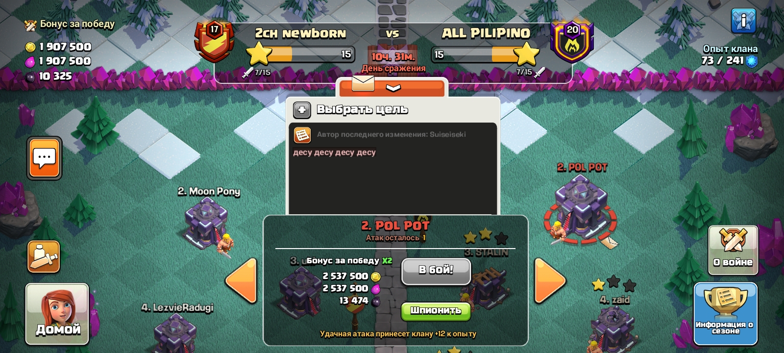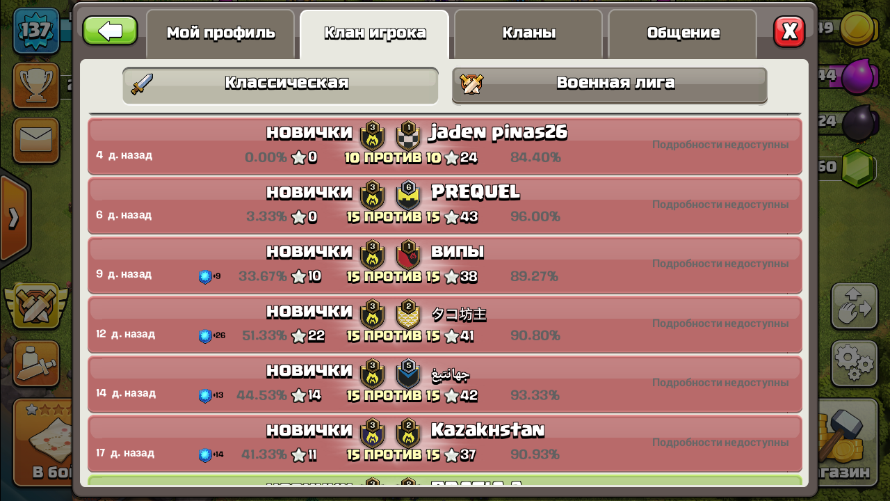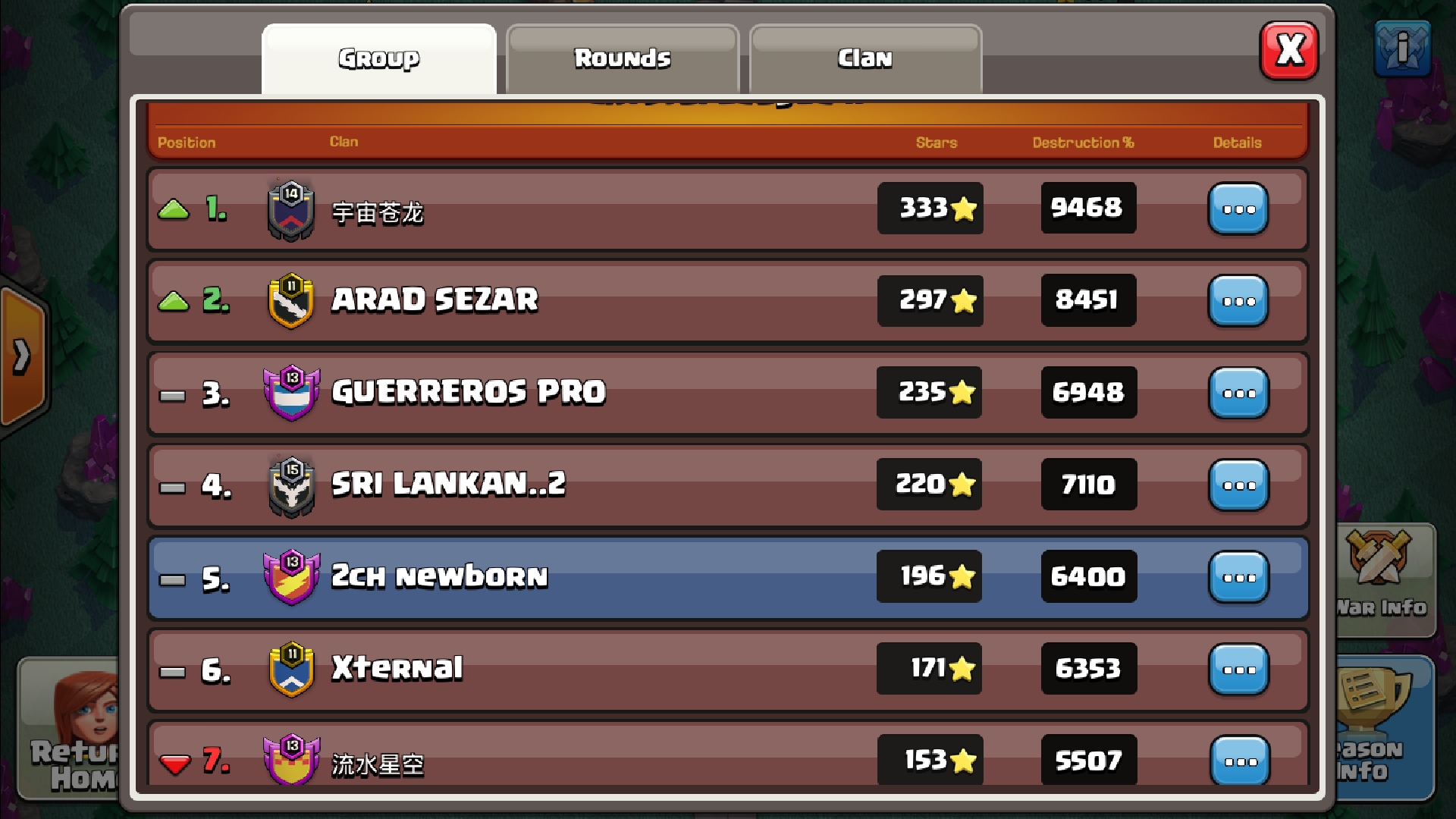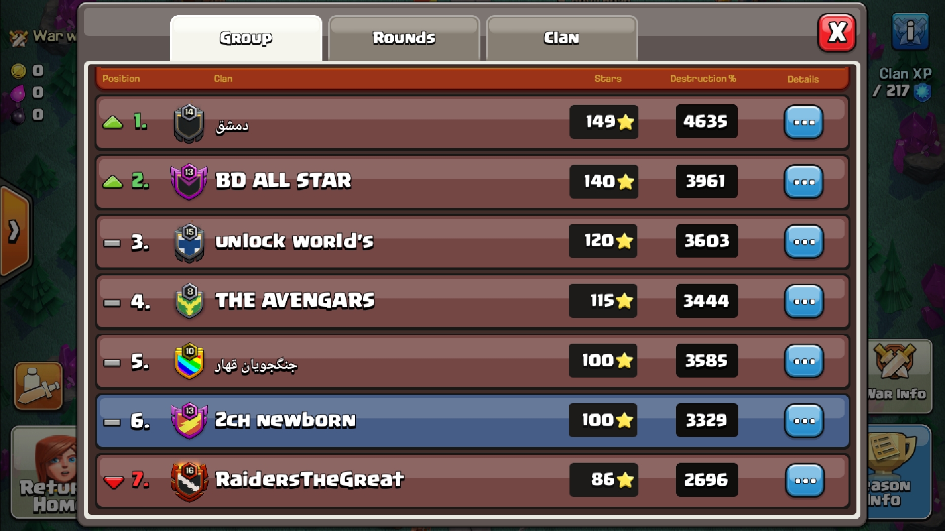 -И сразу к серьезным делам. Пока США и Иран решили поиграть в войнушку, у нас началась настоящая мясорубка ввиде ЛВК. И это полный пиздец товарищи. Чекаем фотокарточку с текущей таблицей и наблюдаем минимальный разрыв в 1-2 звезды между нами и вашим очком остальными кланами. Пиздилка в идеале за топ 2 чтобы апнуть лигу и получить медалек и ордена на грудь, чтобы место в автобусе уступали. Но скорее всего будет 3-4 место, что кстати уже неплохо УЧИТЫВАЯ ЧТО У НЕСКОЛЬКИХ ЧЕЛОВЕК КВИНА НА АПЕ БЛЯТЬ. КВИНА. НА АПЕ. Да вы кто такие чтобы это делать блядь. Вы че ебланы а В первой войне попались слабенькие противники, дальше только сложнее. Если не будем творить хуйню, можем получить и хорошее вознаграждение.