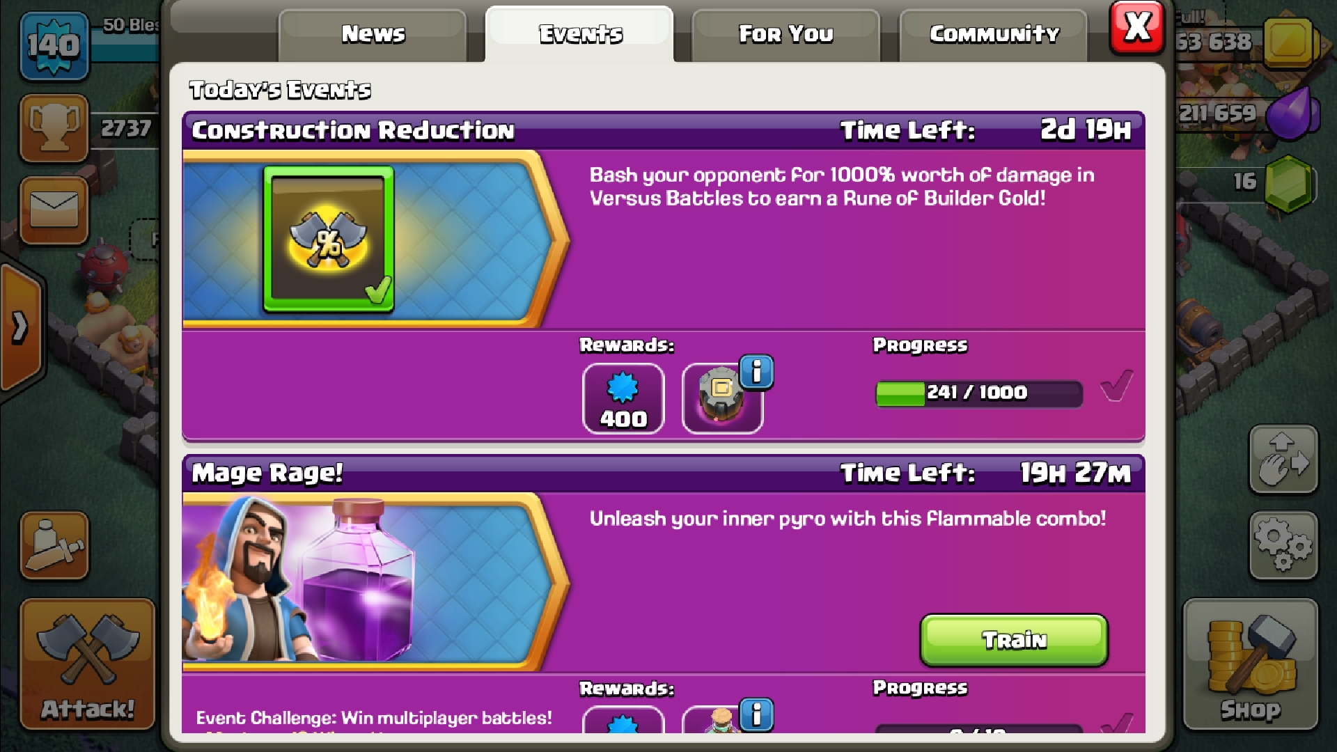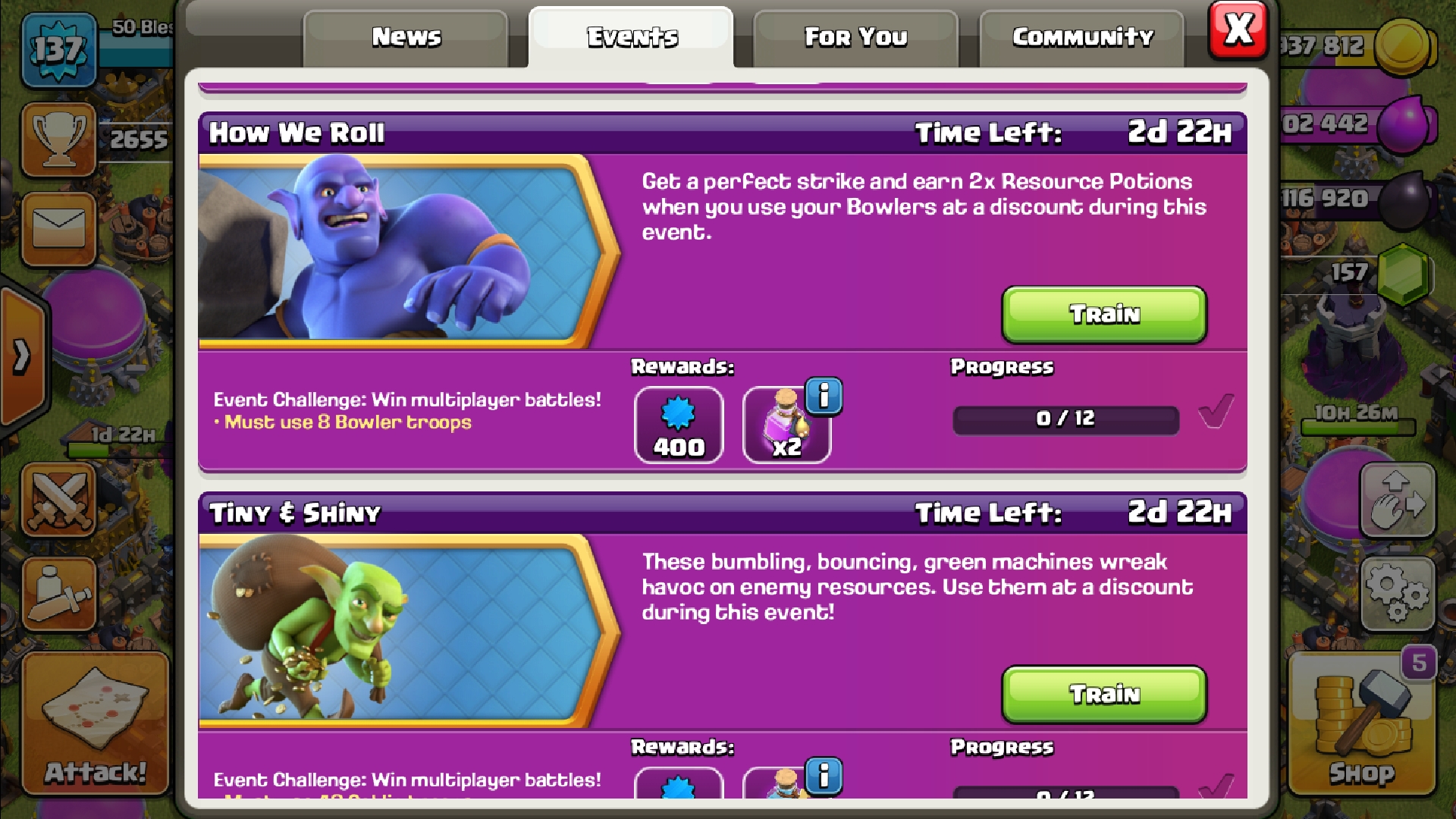 >>2219434 Самое удобное время для вката, последнее время хорошо так режут стоимость и аремя апгрейдов для низких тх. Энджой так сказать. По пунктам: 1)Порядок апгрейдов почти на любом тх : лаба, кк, лагеря, хранилища, моча, кал, все остальное. После апа тх дают всякие бусты на несколько дней. 2)Как можно скорее построй крепость клана, и вступай в клан (двач нуборн), там накидают воиска посильнее и хуев спеллов. Если хочешь к нам - скинь тег игрока из своего профиля, или просто скинь скрин профиля. Вот вот начнется ивент клановых игр, всем кланом выполняем задания и получаем очки за которые открываем уровни наград. Выше уровень - пизже награды. Дают в основном ресы, зелья и книги, что впринципе полезно в любом случае. Ненужные предметы можно продать за гемы, полный список предметов можно посмотреть тапнув на ратушу. 3)Забей на лигу и трофеи 4)Одной дрочильни мало, есть вторая деревня (переходишь туда на корабле). Особо задротить не нужно, просто рашишь тх и открываешь отто (6 строитель). 5)Не обязательно улучшать всё до последней ловушки. Если герои (у тебя тх сейчас по идее нет) и воиска вкачаны нормально можно спокойно рашить (просто иначе тебе будут сносить ебало а ты взамен ничего не сможешь сделать).