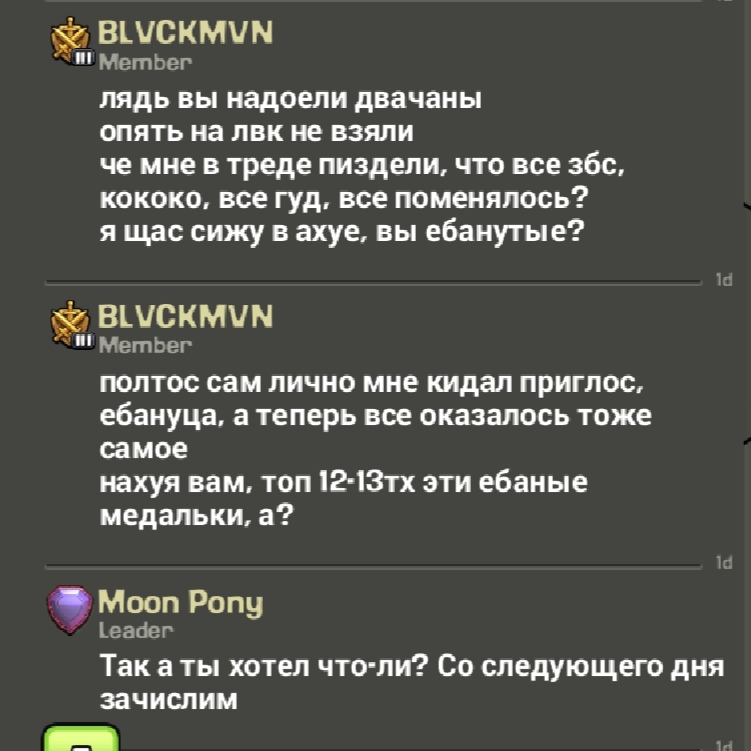 Блядь, как же беляшик был прав, и какие же пиздоболы в треде выше... Монополия медалек закончилась, у нас нормальный клан, кококо - в итоге эти злоебучие киберспортсмены на лвк берут фулл 13ых, которые вкачали абсолютно все, а на остальных кладут хуй. Донат в чате весит часами, попросишь что-нить дать - хуй, гобленов насыпят. Захотел в лвк - соси хуй, ты днище, там только 12+ господа которых все равно на 3 звезды ебошут пиздоглазые, как бы вы не оправдывались, которые выёживаются тем, дескать, если брать не фулл задротов, то клан быстро скатится. Куда ещё вам, собаки, скатываться, когда вы на дне? Ни ногой больше в эту помойку, 2ч моби был гораздо более человечным местом.