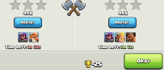 >>2286379 Забей лагеря варварами или лучницами. Начинаешь бой, ставишь одного юнита и ливаешь. Повторять пока не зайдешь в нужную лигу. Если есть королева личниц или хранитель то просто кидаешь одного из двух, сразу прожимаешь абилку и ливаешь. Так герои не получают урон и можно повторять бесконечно. Квину кстати можно ставить возле сборщика и немного пофармить. Кингом посложнее но двух жизней должно хватить. Ну и наконец просто фармишь гоблинами и ливаешь до того как накапает 50%. Я для этого дела юзаю только героев, за пару минут из титана в кристалл спускаюсь.