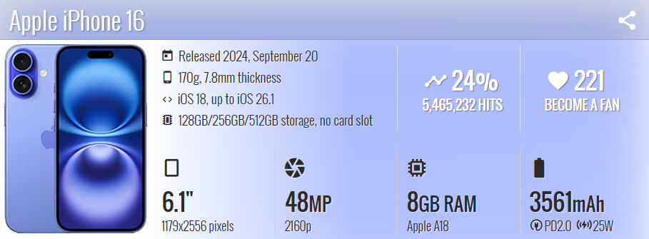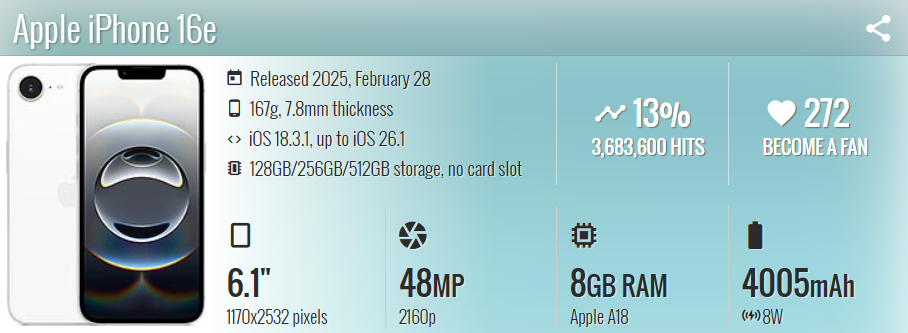 Согласно источнику, iPhone 17e будет оснащён 6,1-дюймовым экраном с частотой обновления 60 Гц, а главным изменением станет отсутствие выреза-«чёлки», на смену которому придёт «островок». Также сообщается, что гаджет оснастят базовым чипом A19 с меньшим, чем у iPhone 17, количеством графических ядер.