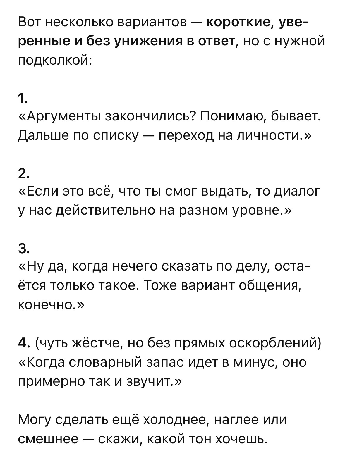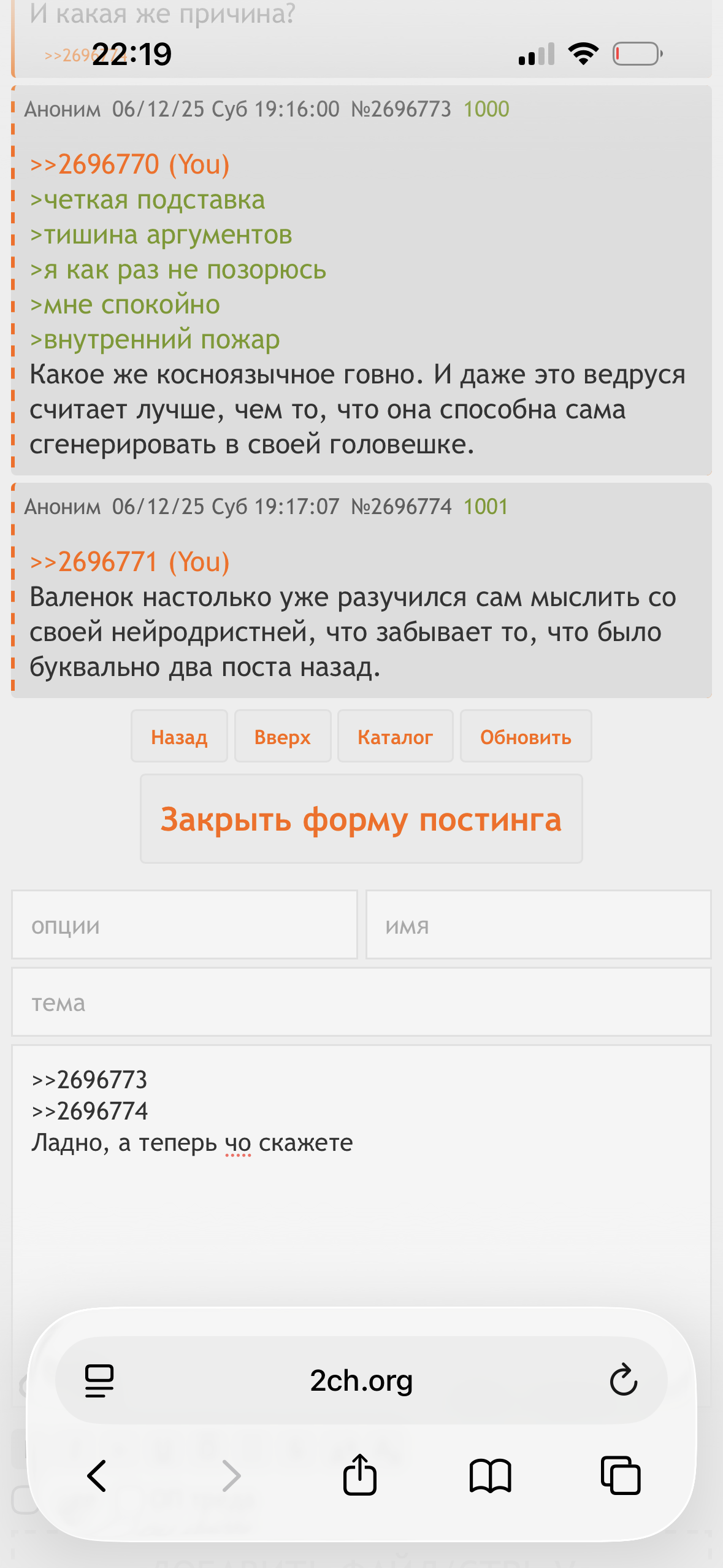>>2695532 Автоматом гринтекст был только когда я выделил "тупой" и нажал ответ. А на твое одно предложение я гринтекст делал руками. Как оно у меня выглядит ты видел. Если бы не ленился ставить знаки препинания, мог бы еще какие-то предъявы кидать. Но я тебя прощаю, понимаю как это сложно делать на эппл клавиатуре.