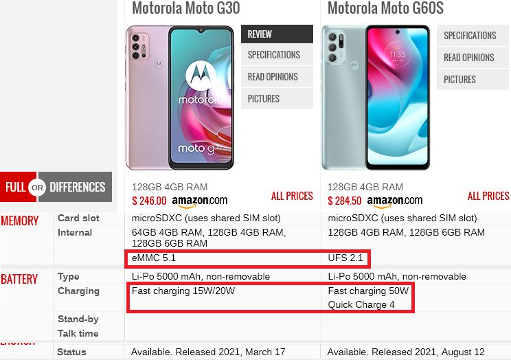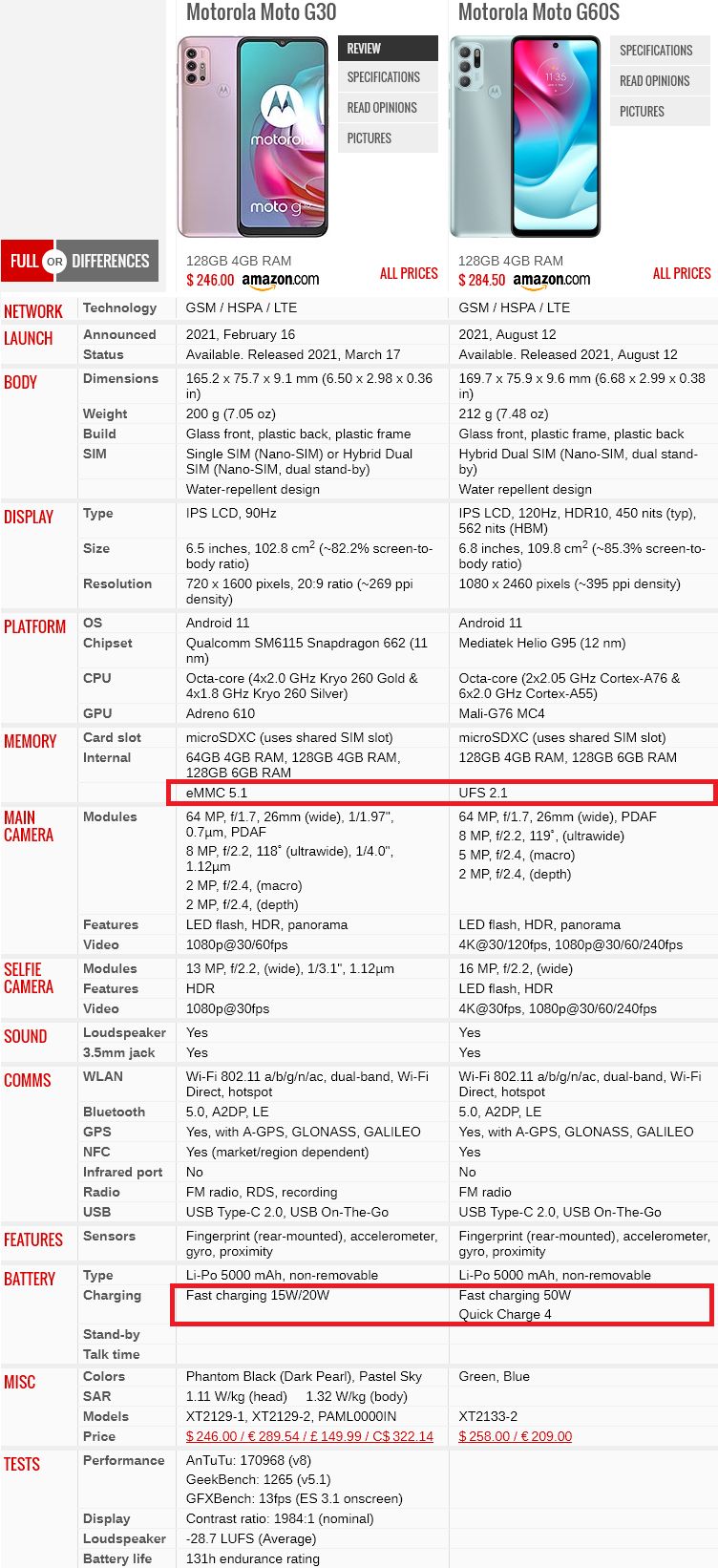 G30 vs G60s eMMC 5.1 vs UFS 2.1 15W vs 50W