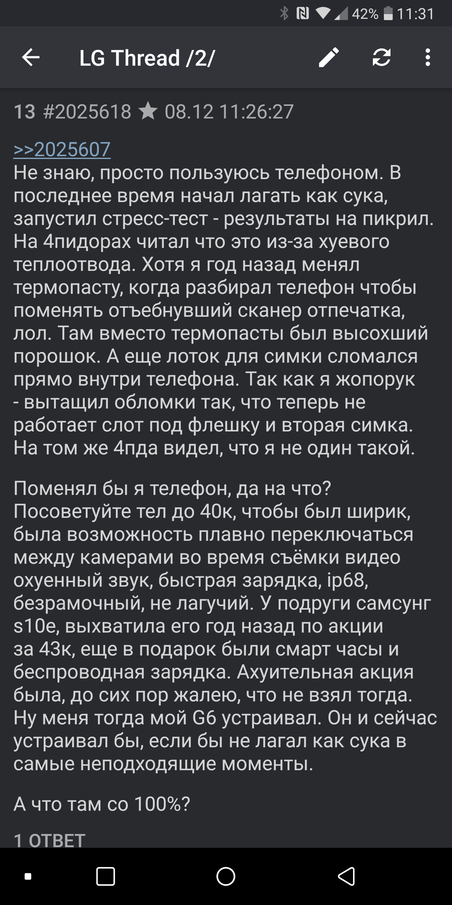 Поменял бы я телефон, да на что?Посоветуйте тел до 40к, чтобы был ширик, была возможность плавно переключаться между камерами во время съёмки видео охуенный звук, быстрая зарядка, ip68, безрамочный, не лагучий. У подруги самсунг s10e, выхватила его год назад по акции за 43к, еще в подарок были смарт часы и беспроводная зарядка. Ахуительная акция была, до сих пор жалею, что не взял тогда. Ну меня тогда мой G6 устраивал. Он и сейчас устраивал бы, если бы не лагал как сука в самые неподходящие моменты.