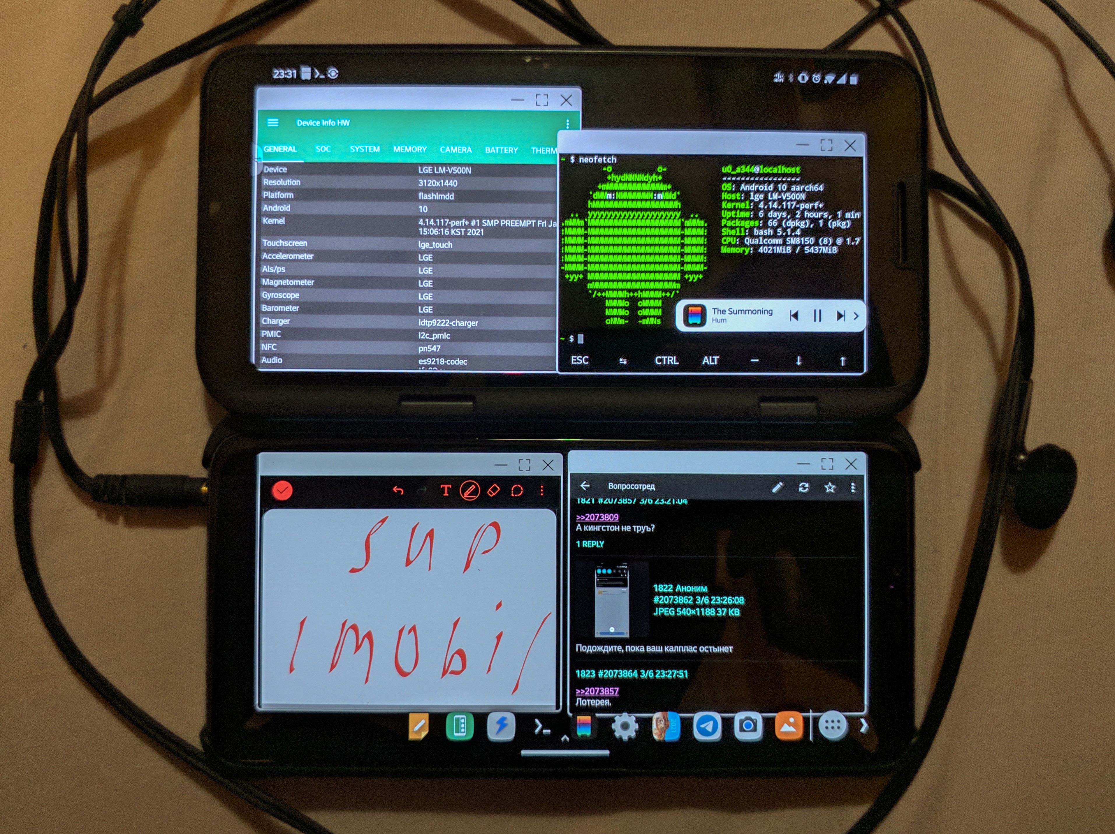 >>2099225 Мне нравится. Он конечно немаленький, но при этом у меня никаких проблем пользоваться им одной рукой. Из фишек пока больше всего впечатляет то, что второй экран позволяет наконец-то реализовать нормальную многооконность на андроиде, одновременно можно вывести 3 приложения на экран, или 2 приложения, а на втором экране набирать текст или управлять курсором как на ноутбуках тут есть сенсорная панель . Вообще, LG постаралась напихать как можно больше различных приблуд в телефон, как для двойного экрана, так и просто чтобы ты мог почувствовать что владеешь топовым устройством. Всё работает плавно и быстро. Особенно в камере много всяких опций, но я пока не приноровился ко всем особенностям