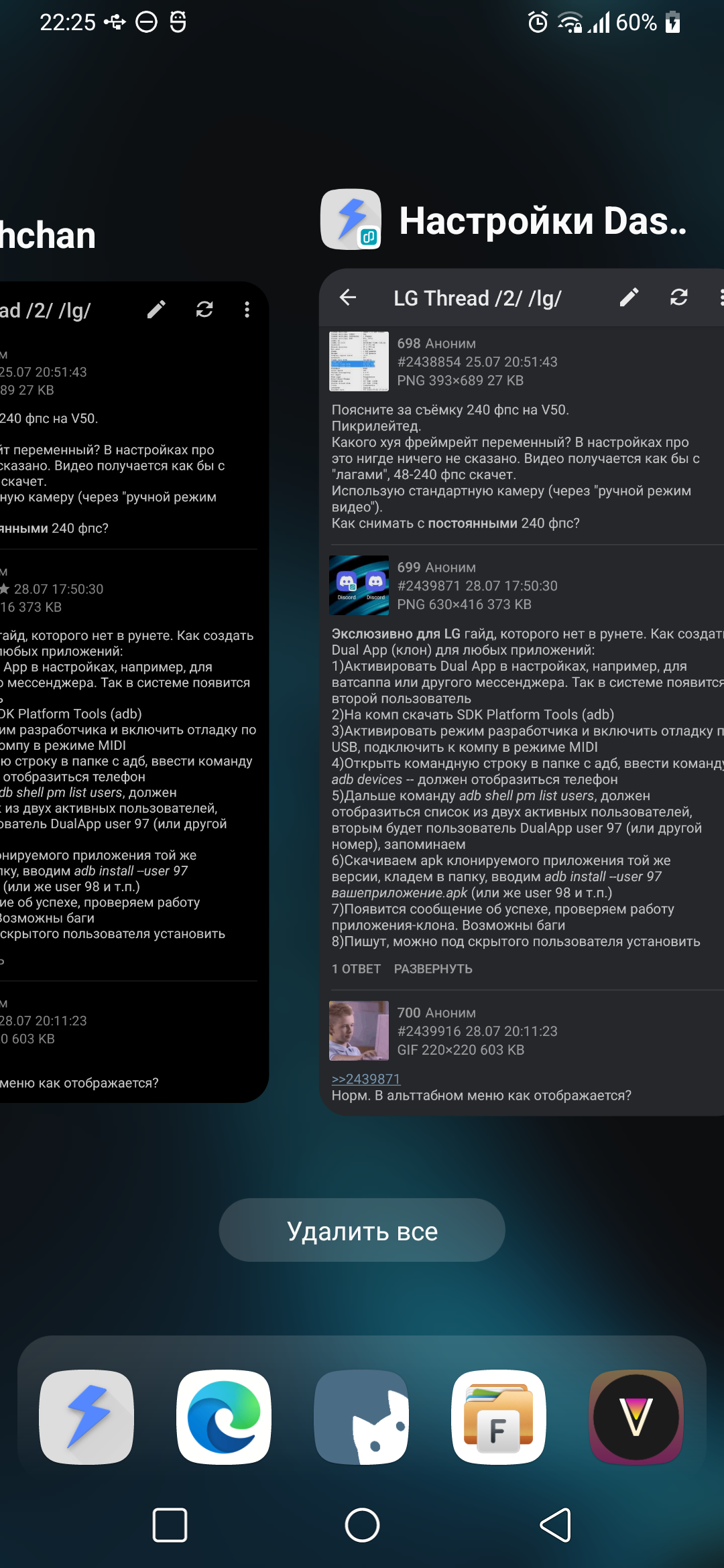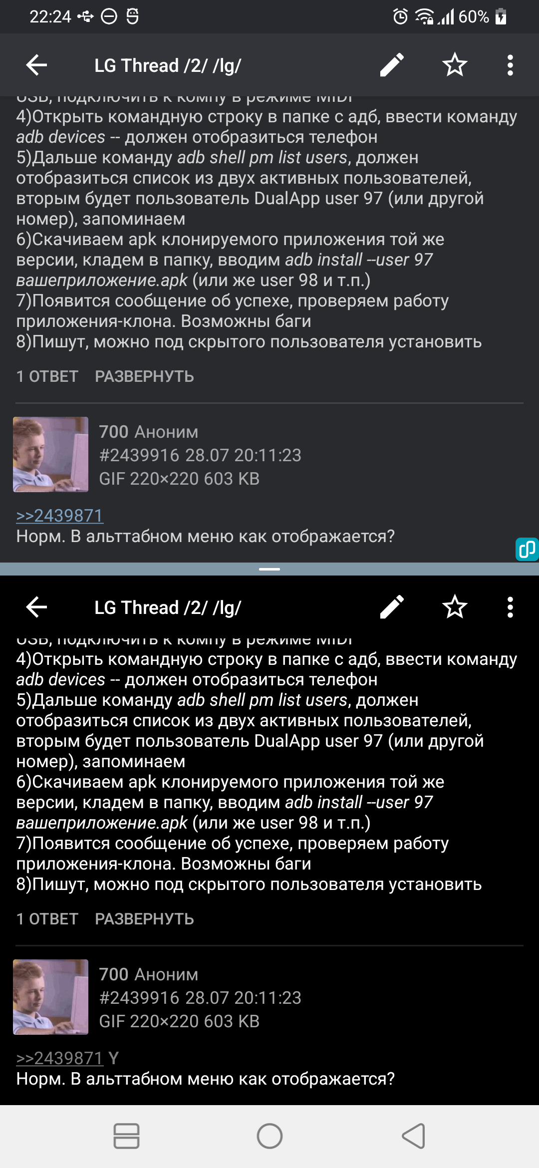 Экслюзивно для LG гайд, которого нет в рунете. Как создать Dual App (клон) для любых приложений: 1)Активировать Dual App в настройках, например, для ватсаппа или другого мессенджера. Так в системе появится второй пользователь 2)На комп скачать SDK Platform Tools (adb) 3)Активировать режим разработчика и включить отладку по USB, подключить к компу в режиме MIDI 4)Открыть командную строку в папке с адб, ввести команду adb devices -- должен отобразиться телефон 5)Дальше команду adb shell pm list users, должен отобразиться список из двух активных пользователей, вторым будет пользователь DualApp user 97 (или другой номер), запоминаем 6)Скачиваем apk клонируемого приложения той же версии, кладем в папку, вводим adb install --user 97 вашеприложение.apk (или же user 98 и т.п.) 7)Появится сообщение об успехе, проверяем работу приложения-клона. Возможны баги 8)Пишут, можно под скрытого пользователя установить Aurora Store, и сразу себе так устанавливать клоны приложений. Не проверял Источник: https://forum.xda-developers.com/t/lg-v60-install-any-app-as-a-dual-app-parallel-app.4112393/