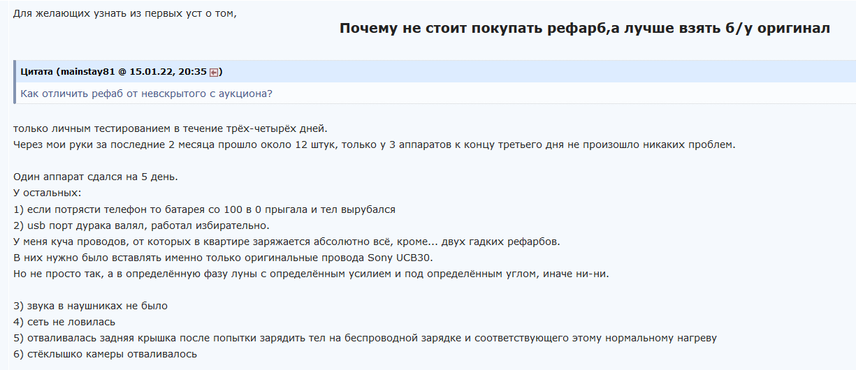 Почитал 4пидора, где рефабы прям настоятельно не советуют к покупке. Ссылаются на: >отсутсвие медной пластины для охлаждения >сломанные микрофоны >перепаяные ЦАПы >поломка вообще всего спустя пару дней использования >плохие порты тупесь >заблокированный кирпич >севшие аккумы И это только за пару страниц и несколько отызвов на алике. Что за пиздец там происходит? В них хоть что-то целое есть?