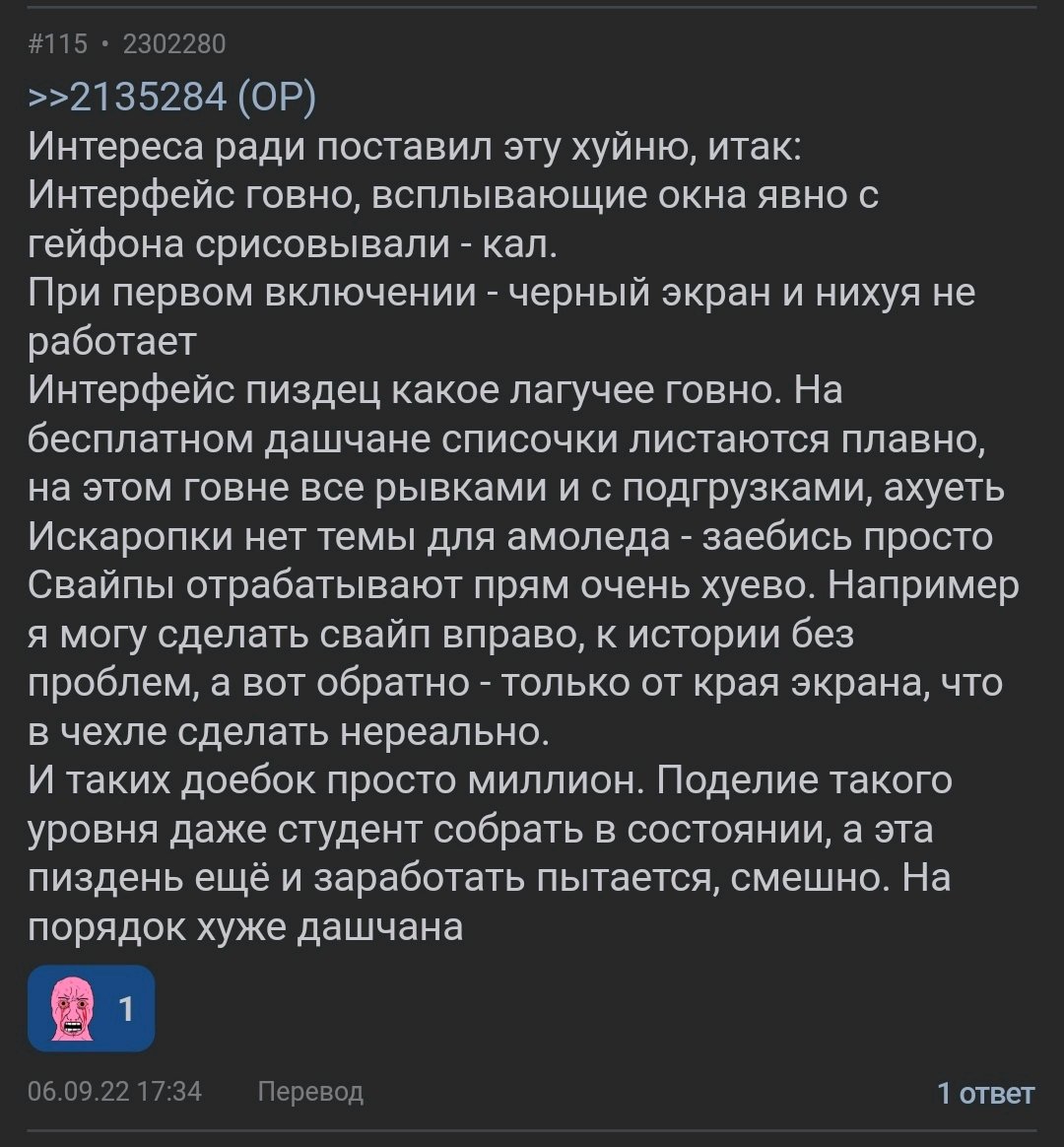 >>2135284 (OP) Интереса ради поставил эту хуйню, итак: Интерфейс говно, всплывающие окна явно с гейфона срисовывали - кал. При первом включении - черный экран и нихуя не работает Интерфейс пиздец какое лагучее говно. На бесплатном дашчане списочки листаются плавно, на этом говне все рывками и с подгрузками, ахуеть Искаропки нет темы для амоледа - заебись просто Свайпы отрабатывают прям очень хуево. Например я могу сделать свайп вправо, к истории без проблем, а вот обратно - только от края экрана, что в чехле сделать нереально. И таких доебок просто миллион. Поделие такого уровня даже студент собрать в состоянии, а эта пиздень ещё и заработать пытается, смешно. На порядок хуже дашчана