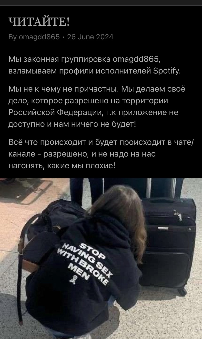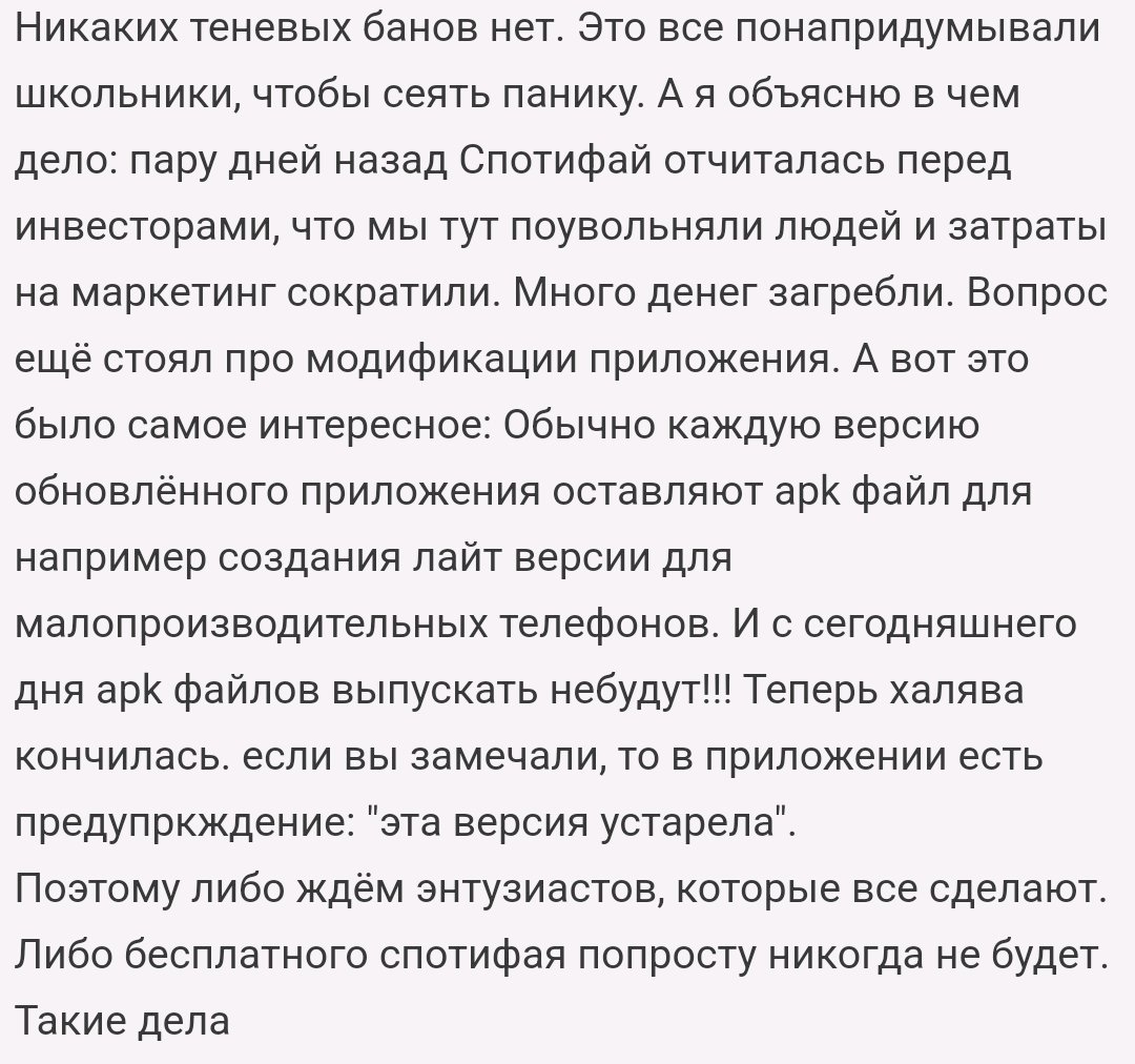 Юзал с момента ухода мод через американский ВПН, до вчерашнего дня всё работало без проблем - треки скипались, рекламы нет, высокое качество. Вчера же сначала все треки стали серыми и недоступными. Зашёл через ВПН как раньше - альбомы недоступны, вообще внутри них треков нет. Ебался полдня, но ничего не получилось, ставил разные версии и менял страны, даже Индию. У брата была официалка и купленная подписка на год, и у него такая же поебота произошла, считай что деньги проебал. А сегодня вот такое в сети прочитал, хз, верить или нет. У кого-нибудь стабильно Споти работает?