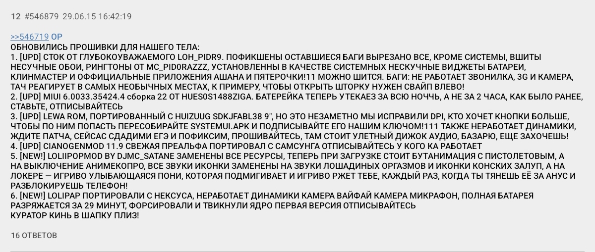 ОБНОВИЛИСЬ ПРОШИВКИ ДЛЯ НАШЕГО ТЕЛА: 1. [UPD] СТОК ОТ ГЛУБОКОУВАЖАЕМОГО LOH_PIDR9. ПОФИКШЕНЫ ОСТАВШИЕСЯ БАГИ ВЫРЕЗАНО ВСЕ, КРОМЕ СИСТЕМЫ, ВШИТЫ НЕСУЧНЫЕ ОБОИ, РИНГТОНЫ ОТ MC_PID0RAZZZ, УСТАНОВЛЕННЫ В КАЧЕСТВЕ СИСТЕМНЫХ НЕСКУЧНЫЕ ВИДЖЕТЫ БАТАРЕИ, КЛИНМАСТЕР И ОФФИЦИАЛЬНЫЕ ПРИЛОЖЕНИЯ АШАНА И ПЯТЕРОЧКИ!11 МОЖНО ШИТСЯ. БАГИ: НЕ РАБОТАЕТ ЗВОНИЛКА, 3G И КАМЕРА, ТАЧ РЕАГИРУЕТ В САМЫХ НЕОБЫЧНЫХ МЕСТАХ, К ПРИМЕРУ, ЧТОБЫ ОТКРЫТЬ ШТОРКУ НУЖЕН СВАЙП ВЛЕВО! 2. [UPD] MIUI 6.0033.35424.4 сборка 22 ОТ HUES0S1488ZIGA. БАТЕРЕЙКА ТЕПЕРЬ УТЕКАЕЗ ЗА ВСЮ НОЧЧЬ, А НЕ ЗА 2 ЧАСА, КАК БЫЛО РАНЕЕ, СТАВЬТЕ, ОТПИСЫВАЙТЕСЬ 3. [UPD] LEWA ROM, ПОРТИРОВАННЫЙ С HUIZUUG SDKJFABL38 9", НО ЭТО НЕЗАМЕТНО МЫ ИСПРАВИЛИ DPI, КТО ХОЧЕТ КНОПКИ БОЛЬШЕ, ЧТОБЫ ПО НИМ ПОПАСТЬ ПЕРЕСОБИРАЙТЕ SYSTEMUI.APK И ПОДПИСЫВАЙТЕ ЕГО НАШИМ КЛЮЧОМ!111 ТАКЖЕ НЕРАБОТАЕТ ДИНАМИКИ, ЖДИТЕ ПАТЧА, СЕЙСАС СДАДИМИ ЕГЭ И ПОФИКСИМ, ПРОШИВАЙТЕСЬ, ТАМ СТОИТ УЛЕТНЫЙ ДИЖОК АУДИО, БАЗАРЮ, ЕЩЕ ЗАХОЧЕШЬ! 4. [UPD] CIANOGENMOD 11.9 СВЕЖАЯ ПРЕАЛЬФА ПОРТИРОВАЛ С САМСУНГА ОТПИСЫВАЙТЕСЬ У КОГО КА РАБОТАЕТ 5. [NEW!] LOLIIPOPMOD BY DJMC_SATANE ЗАМЕНЕНЫ ВСЕ РЕСУРСЫ, ТЕПЕРЬ ПРИ ЗАГРУЗКЕ СТОИТ БУТАНИМАЦИЯ С ПИСТОЛЕТОВЫМ, А НА ВЫКЛЮЧЕНИЕ АНИМЕКОПРО, ВСЕ ЗВУКИ ИКОНКИ ЗАМЕНЕНЫ НА ЗВУКИ ЛОШАДИНЫХ ОРГАЗМОВ И ИКОНКИ КОНСКИХ ЗАЛУП, А НА ЛОКЕРЕ — ИГРИВО УЛЫБАЮЩАЯСЯ ПОНИ, КОТОРАЯ ПОДМИГИВАЕТ И ИГРИВО РЖЕТ ТЕБЕ, КАЖДЫЙ РАЗ, КОГДА ТЫ ТЯНЕШЬ ЕЁ ЗА АНУС И РАЗБЛОКИРУЕШЬ ТЕЛЕФОН! 6. [NEW!] LOLIPAP ПОРТИРОВАЛИ С НЕКСУСА, НЕРАБОТАЕТ ДИНАМИКИ КАМЕРА ВАЙФАЙ КАМЕРА МИКРАФОН, ПОЛНАЯ БАТАРЕЯ РАЗРЯЖАЕТСЯ ЗА 29 МИНУТ, ФОРСИРОВАЛИ И ТВИКНУЛИ ЯДРО ПЕРВАЯ ВЕРСИЯ ОТПИСЫВАЙТЕСЬ КУРАТОР КИНЬ В ШАПКУ ПЛИЗ!