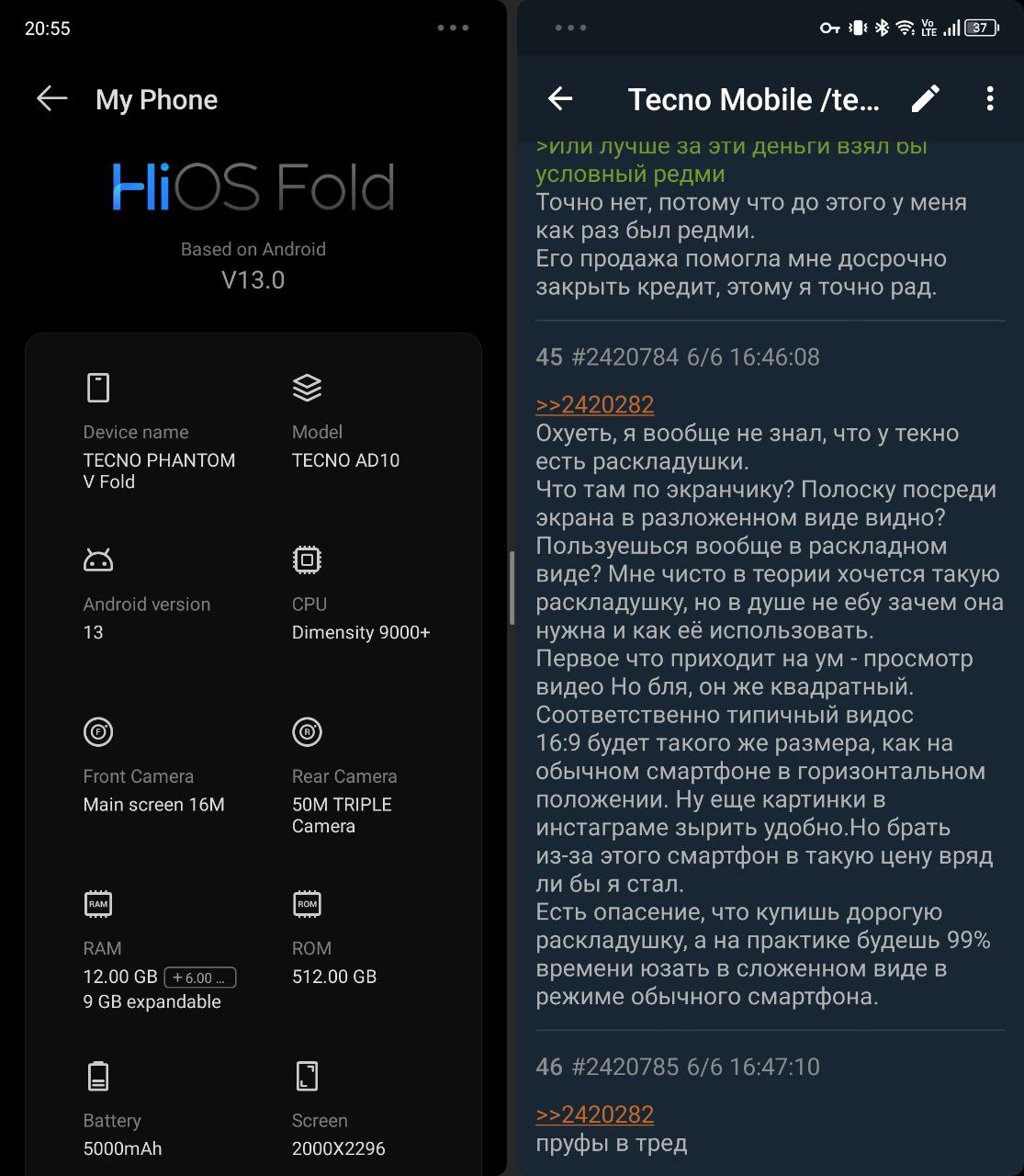 Пока же самый бюджетный вариант, если брать новые и с гарантией, оказался текно. На старте продаж была скидка, с которой получилась цена топового не складного самсунга. Обычный телефон я бы за цену выше 40к бы точно не купил, но тут получился очень интересный вариант вкатиться в формат будущего и попробовать что-то реально новое, по сравнению с одинаковыми прямоугольниками, в которых толком ничего нового не появилось за 10 лет.